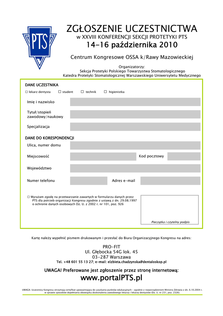 ZGŁOSZENIE UCZESTNICTWA w XXVIII KONFERENCJI SEKCJI PROTETYKI PTS 14-16 października 2010 Centrum Kongresowe OSSA k/Rawy Mazowieckiej Organizatorzy: Sekcja Protetyki Polskiego Towarzystwa Stomatologicznego Katedra Protetyki Stomatologicznej Warszawskiego Uniwersytetu Medycznego DANE UCZESTNIKA □ lekarz dentysta □ student □ technik □ higienistka Imię i nazwisko Tytuł/stopień zawodowy/naukowy Specjalizacja DANE DO KORESPONDENCJI Ulica, numer domu Kod pocztowy Miejscowość Województwo Numer telefonu Adres e-mail □ Wyrażam zgodę na przetwarzanie zawartych w formularzu danych przez PTS dla potrzeb organizacji Kongresu zgodnie z ustawą z dn. 29.08.1997 o ochronie danych osobowych Dz. U. z 2002 r. nr 101, poz. 926 Pieczątka i czytelny podpis Kartę należy wypełnić pismem drukowanym i przesłać do Biura Organizacyjnego Kongresu na adres: PRO-FIT Ul. Głębocka 54G lok. 45 03-287 Warszawa Tel. +48 601 55 13 27; e-mail: [email protected] UWAGA! Preferowane jest zgłoszenie przez stronę internetową: www.portalPTS.pl UWAGA: Uczestnicy Kongresu otrzymają certyfikat upoważniający do uzyskania punktów edukacyjnych – zgodnie z rozporządzeniem Ministra Zdrowia z dn. 6.10.2004 r. w sprawie sposobów dopełniania obowiązku doskonalenia zawodowego lekarzy i lekarzy dentystów (Dz. U. nr 231, poz. 2326). ZAMÓWIENIE OPŁATY ZA UCZESTNICTWO W KONGRESIE Opłata rejestracyjna I Termin 30.04.2010 II Termin 30.07.2010 Koszt uczestnictwa dla członków PTS □ 550 zł □ 650 zł Koszt uczestnictwa dla niezrzeszonych □ 650 zł □ 750 zł Osoba towarzysząca □ 490 zł □ 490 zł Studenci □ 250 zł □ 250 zł Opłata rejestracyjna upoważnia do wstępu na wszystkie wykłady, udziału w koktajlu powitalnym i bankiecie oraz do otrzymania materiałów zjazdowych, identyfikatora i certyfikatu. Bez uczestnictwa w obradach OPŁATY DODATKOWE Warsztaty konferencyjne nr …… □ 100 zł SUMA DO ZAPŁATY Tematy warsztatów dostępne na stronie internetowej ………………………..zł ……………zł RAZEM Powyższa kwota została przelana na konto Sekcji Protetyki PTS dn. ………………2010r. Polskie Towarzystwo Stomatologiczne – Sekcja Protetyki PKO BP s.a., ul. Grunwaldzka 103, 80-244 Gdańsk Nr konta: 87 1020 1811 0000 0002 0109 1032 DANE DO FAKTURY VAT Nazwa firmy Nazwisko i imię Ulica, numer domu Miejscowość Kod pocztowy Województwo Numer NIP Karta zgłoszenia uczestnictwa w Kongresie (str. 1 i 2) traktowana jest jako umowa zawarta pomiędzy organizatorami Kongresu a uczestnikiem. Informacje o zakwaterowaniu dostępne są na stronie: www.portalPTS.pl Pieczątka i czytelny podpis XXVIII KONFERENCJA SEKCJI PROTETYKI PTS Centrum Kongresowe OSSA k/Rawy Mazowieckiej 14-16 października 2010 ZGŁOSZENIE PRACY DO PREZENTACJI Formularz streszczenia UWAGA: Formularz wypełniają tylko te osoby, które nie mogą przesłać zgłoszenia przez Internet. Prosimy o wypełnienie formularza zgodnie z podanymi niżej wskazówkami. 1. Cały tekst (w tym tytuł, autorzy, nazwa placówki, adres) musi być zamieszczony wewnątrz ramki z pozostawieniem wolnego lewego, górnego rogu. 2. Pomiędzy liniami powinny być pojedyncze odstępy. 3. Tytuł należy podać w języku polskim i angielskim. 4. Streszczenie nie może przekraczać 250 słów. 5. Zalecane jest wyszczególnienie w streszczeniu: wprowadzenia, celu pracy, materiału i zastosowanych metod, wyników i wniosków. 6. Dane wszystkich autorów muszą zawierać tytuł/stopień naukowy, pełne imię i nazwisko, a prezentującego należy wskazać przy pomocy gwiazdki *. 7. Dane dotyczące miejsca realizacji pracy powinny obejmować: nazwę uczelni (instytucji), nazwę jednostki uczelni (instytucji) oraz miasto. 8. Wypełniony pismem drukowanym formularz musi być wolny od poprawek. 9. Niezależnie od wypełnionego niniejszego formularza wymagane jest przesłanie jego treści drogą elektroniczną (plik w formiacie Microsoft Word lub kompatybilny) na adres: [email protected] lub – po nagraniu na płytę CD – przesłanie jej na poniżej podany adres korespondencyjny. 10. Streszczenie należy przesłać najpóźniej do dnia 15 kwietnia 2010 r. 11. Zakwalifikowane na Konferencję streszczenia opublikowane zostaną w Protetyce Stomatologicznej. 12. Uprzejmie informujemy, że zaproponowana forma prezentacji może ulec zmianie. □ referat □ plakat DANE OSOBY DO KONTAKTU Imię i nazwisko Tytuł/stopień naukowy Ulica, numer domu/mieszkania Kod pocztowy/Miejscowość Nazwa instytucji zatrudniającej Tel. stacjonarny Tel, komórkowy E-mail Kartę należy przesłać na adres Komitetu Naukowego: Katedra Protetyki Stomatologicznej WUM Ul. Nowogrodzka 59 02-006 Warszawa Tel. +48 22 502 18 86 Fax: +48 22 502 21 45 E-mail: [email protected] UWAGA! Preferowane jest zgłoszenie przez stronę internetową: www.portalPTS.pl ……………………………………………… Podpis