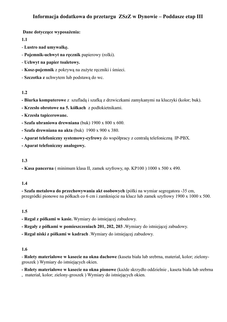 Informacja dodatkowa do przetargu ZSzZ w Dynowie – Poddasze etap III Dane dotyczące wyposażenia: 1.1 - Lustro nad umywalkę. - Pojemnik-uchwyt na ręcznik papierowy (rolki). - Uchwyt na papier toaletowy. - Kosz-pojemnik z pokrywą na zużyte ręczniki i śmieci. - Szczotka z uchwytem lub podstawą do wc. 1.2 - Biurka komputerowe z szufladą i szafką z drzwiczkami zamykanymi na kluczyki (kolor; buk). - Krzesło obrotowe na 5. kółkach z podłokietnikami. - Krzesła tapicerowane. - Szafa ubraniowa drewniana (buk) 1900 x 800 x 600. - Szafa drewniana na akta (buk) 1900 x 900 x 380. - Aparat telefoniczny systemowy-cyfrowy do współpracy z centralą telefoniczną IP-PBX. - Aparat telefoniczny analogowy. 1.3 - Kasa pancerna ( minimum klasa II, zamek szyfrowy, np. KP100 ) 1000 x 500 x 490. 1.4 - Szafa metalowa do przechowywania akt osobowych (półki na wymiar segregatora -35 cm, przegródki pionowe na półkach co 6 cm i zamknięcie na klucz lub zamek szyfrowy 1900 x 1000 x 500. 1.5 - Regał z półkami w kasie. Wymiary do istniejącej zabudowy. - Regały z półkami w pomieszczeniach 201, 202, 203 .Wymiary do istniejącej zabudowy. - Regał niski z półkami w kadrach .Wymiary do istniejącej zabudowy. 1.6 - Rolety materiałowe w kasecie na okna dachowe (kaseta biała lub srebrna, materiał, kolor; zielonygroszek ) Wymiary do istniejących okien. - Rolety materiałowe w kasecie na okna pionowe (każde skrzydło oddzielnie , kaseta biała lub srebrna , materiał, kolor; zielony-groszek ) Wymiary do istniejących okien.