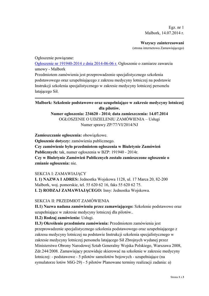Egz. nr 1 Malbork, 14.07.2014 r. Wszyscy zainteresowani (strona internetowa Zamawiającego) Ogłoszenie powiązane: Ogłoszenie nr 191940-2014 z dnia 2014-06-06 r. Ogłoszenie o zamiarze zawarcia umowy - Malbork Przedmiotem zamówienia jest przeprowadzenie specjalistycznego szkolenia podstawowego oraz uzupełniającego z zakresu medycyny lotniczej na podstawie Instrukcji szkolenia specjalistycznego w zakresie medycyny lotniczej personelu latającego Sił. Malbork: Szkolenie podstawowe oraz uzupełniające w zakresie medycyny lotniczej dla pilotów. Numer ogłoszenia: 234620 - 2014; data zamieszczenia: 14.07.2014 OGŁOSZENIE O UDZIELENIU ZAMÓWIENIA – Usługi Numer sprawy ZP/77/VI/2014/NJ Zamieszczanie ogłoszenia: obowiązkowe. Ogłoszenie dotyczy: zamówienia publicznego. Czy zamówienie było przedmiotem ogłoszenia w Biuletynie Zamówień Publicznych: tak, numer ogłoszenia w BZP: 191940 - 2014r. Czy w Biuletynie Zamówień Publicznych zostało zamieszczone ogłoszenie o zmianie ogłoszenia: nie. SEKCJA I: ZAMAWIAJĄCY I. 1) NAZWA I ADRES: Jednostka Wojskowa 1128, ul. 17 Marca 20, 82-200 Malbork, woj. pomorskie, tel. 55 620 62 16, faks 55 620 62 75. I. 2) RODZAJ ZAMAWIAJĄCEGO: Inny: Jednostka Wojskowa. SEKCJA II: PRZEDMIOT ZAMÓWIENIA II.1) Nazwa nadana zamówieniu przez zamawiającego: Szkolenie podstawowe oraz uzupełniające w zakresie medycyny lotniczej dla pilotów.. II.2) Rodzaj zamówienia: Usługi. II.3) Określenie przedmiotu zamówienia: Przedmiotem zamówienia jest przeprowadzenie specjalistycznego szkolenia podstawowego oraz uzupełniającego z zakresu medycyny lotniczej na podstawie Instrukcji szkolenia specjalistycznego w zakresie medycyny lotniczej personelu latającego Sił Zbrojnych wydanej przez Ministerstwo Obrony Narodowej Sztab Generalny Wojska Polskiego, Warszawa 2008, Zdr.244/2008. Zamawiający przewiduje skierować na szkolenie w zakresie medycyny lotniczej: - podstawowe - 5 pilotów samolotów bojowych - uzupełniające (na symulatorze lotów MiG-29) - 5 pilotów Planowane terminy realizacji zadania: a) Strona 1 z 3 szkolenie podstawowe - 25- 29.08.2014 r. b) szkolenie uzupełniające - 01.09 28.11.2014 r... II.4) Wspólny Słownik Zamówień (CPV): 80.51.00.00-2. SEKCJA III: PROCEDURA III.1) TRYB UDZIELENIA ZAMÓWIENIA: Zamówienie z wolnej ręki III.2) INFORMACJE ADMINISTRACYJNE Zamówienie dotyczy projektu/programu finansowanego ze środków Unii Europejskiej: nie SEKCJA IV: UDZIELENIE ZAMÓWIENIA IV.1) DATA UDZIELENIA ZAMÓWIENIA: 03.07.2014. IV.2) LICZBA OTRZYMANYCH OFERT: 1. IV.3) LICZBA ODRZUCONYCH OFERT: 0. IV.4) NAZWA I ADRES WYKONAWCY, KTÓREMU UDZIELONO ZAMÓWIENIA: Wojskowy Instytut Medycyny Lotniczej, ul. Krasińskiego 54/56, 01-755 Warszawa, kraj/woj. mazowieckie. IV.5) Szacunkowa wartość zamówienia (bez VAT): 190095,00 PLN. IV.6) INFORMACJA O CENIE WYBRANEJ OFERTY ORAZ O OFERTACH Z NAJNIŻSZĄ I NAJWYŻSZĄ CENĄ Cena wybranej oferty: 190095,00 Oferta z najniższą ceną: 190095,00 / Oferta z najwyższą ceną: 190095,00 Waluta: PLN. ZAŁĄCZNIK I Uzasadnienie udzielenia zamówienia w trybie negocjacji bez ogłoszenia, zamówienia z wolnej ręki albo zapytania o cenę 1. Podstawa prawna Postępowanie prowadzone jest w trybie zamówienie z wolnej ręki na podstawie art. 67 ust. 1 pkt 1 lit. a ustawy z dnia 29 stycznia 2004r. - Prawo zamówień publicznych. 2. Uzasadnienia wyboru trybu Należy podać uzasadnienie faktyczne i prawne wyboru trybu oraz wyjaśnić, dlaczego udzielenie zamówienia jest zgodne z przepisami. Szkolenia z zakresu medycyny lotniczej prowadzone na podstawie zatwierdzonej przez Szefa Inspektoratu Wojskowej Służby Zdrowia Instrukcji szkolenia specjalistycznego w zakresie medycyny lotniczej personelu latającego Sił Zbrojnych RP - sygn. Zdr. 244/2008 , mogą być realizowane przez Wojskowy Instytut Medycyny Lotniczej w Warszawie. Jest to instytucja, która jako jedyna w Polsce posiada zatwierdzony program w zakresie ww szkolenia oraz specjalizująca się w prowadzeniu treningów w zakresie medycyny lotniczej dla personelu lotniczego. Ponadto ośrodek dysponuje Strona 2 z 3 unikalnym sprzętem do badań specjalistycznych oraz doskonale przygotowaną kadrą specjalistów wykształconych w zakresie medycyny lotniczej. Skorzystanie z usług placówki zagranicznej niewątpliwie zwiększyłoby koszty realizacji zamówienia i naruszyłoby zasady celowego, oszczędnego i efektywnego dokonywania wydatków, dlatego też zasadnym jest udzielenie zamówienia dla Wojskowego Instytutu Medycyny Lotniczej. W tym stanie rzeczy okoliczności przedstawione wyżej wyczerpują przesłanki zawarte w art. 67 ust. 1 pkt. 1a ustawy Pzp. DOWÓDCA Wykonano w 1 egz..: Egz. Nr 1 – a/a Wykonała: J. Narloch (tel. 55 620 67 07) (T:11/13)(Bc) Dostęp do dokumentu: Sekcja Zamówień Publicznych Strona 3 z 3