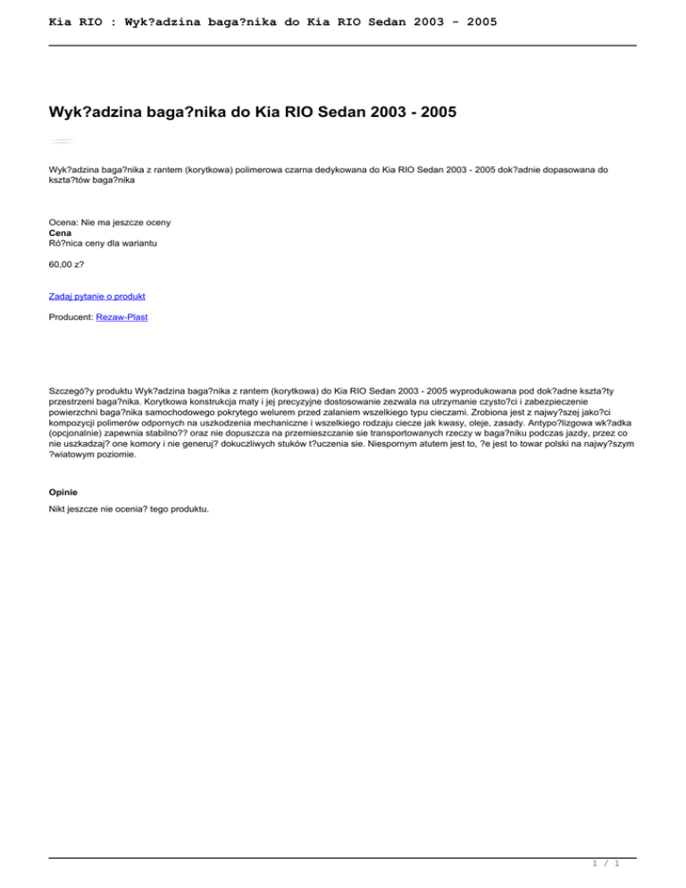 Kia RIO : Wyk?adzina baga?nika do Kia RIO Sedan 2003 - 2005 Wyk?adzina baga?nika do Kia RIO Sedan 2003 - 2005 Wyk?adzina baga?nika z rantem (korytkowa) polimerowa czarna dedykowana do Kia RIO Sedan 2003 - 2005 dok?adnie dopasowana do kszta?tów baga?nika Ocena: Nie ma jeszcze oceny Cena Ró?nica ceny dla wariantu 60,00 z? Zadaj pytanie o produkt Producent: Rezaw-Plast Szczegó?y produktu Wyk?adzina baga?nika z rantem (korytkowa) do Kia RIO Sedan 2003 - 2005 wyprodukowana pod dok?adne kszta?ty przestrzeni baga?nika. Korytkowa konstrukcja maty i jej precyzyjne dostosowanie zezwala na utrzymanie czysto?ci i zabezpieczenie powierzchni baga?nika samochodowego pokrytego welurem przed zalaniem wszelkiego typu cieczami. Zrobiona jest z najwy?szej jako?ci kompozycji polimerów odpornych na uszkodzenia mechaniczne i wszelkiego rodzaju ciecze jak kwasy, oleje, zasady. Antypo?lizgowa wk?adka (opcjonalnie) zapewnia stabilno?? oraz nie dopuszcza na przemieszczanie sie transportowanych rzeczy w baga?niku podczas jazdy, przez co nie uszkadzaj? one komory i nie generuj? dokuczliwych stuków t?uczenia sie. Niespornym atutem jest to, ?e jest to towar polski na najwy?szym ?wiatowym poziomie. Opinie Nikt jeszcze nie ocenia? tego produktu. 1 / 1 Powered by TCPDF (www.tcpdf.org)