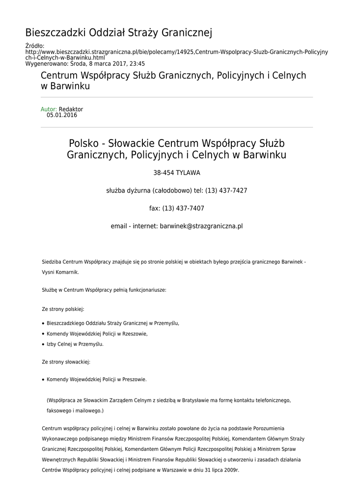 Bieszczadzki Oddział Straży Granicznej Źródło: http://www.bieszczadzki.strazgraniczna.pl/bie/polecamy/14925,Centrum-Wspolpracy-Sluzb-Granicznych-Policyjny ch-i-Celnych-w-Barwinku.html Wygenerowano: Środa, 8 marca 2017, 23:45 Centrum Współpracy Służb Granicznych, Policyjnych i Celnych w Barwinku Autor: Redaktor 05.01.2016 Polsko - Słowackie Centrum Współpracy Służb Granicznych, Policyjnych i Celnych w Barwinku 38-454 TYLAWA służba dyżurna (całodobowo) tel: (13) 437-7427 fax: (13) 437-7407 email - internet: [email protected] Siedziba Centrum Współpracy znajduje się po stronie polskiej w obiektach byłego przejścia granicznego Barwinek Vysni Komarnik. Służbę w Centrum Współpracy pełnią funkcjonariusze: Ze strony polskiej: ● Bieszczadzkiego Oddziału Straży Granicznej w Przemyślu, ● Komendy Wojewódzkiej Policji w Rzeszowie, ● Izby Celnej w Przemyślu. Ze strony słowackiej: ● Komendy Wojewódzkiej Policji w Preszowie. (Współpraca ze Słowackim Zarządem Celnym z siedzibą w Bratysławie ma formę kontaktu telefonicznego, faksowego i mailowego.) Centrum współpracy policyjnej i celnej w Barwinku zostało powołane do życia na podstawie Porozumienia Wykonawczego podpisanego między Ministrem Finansów Rzeczpospolitej Polskiej, Komendantem Głównym Straży Granicznej Rzeczpospolitej Polskiej, Komendantem Głównym Policji Rzeczpospolitej Polskiej a Ministrem Spraw Wewnętrznych Republiki Słowackiej i Ministrem Finansów Republiki Słowackiej o utworzeniu i zasadach działania Centrów Współpracy policyjnej i celnej podpisane w Warszawie w dniu 31 lipca 2009r. Do tego dnia na granicy polsko - słowackiej funkcjonował Punkt Kontaktowy utworzony w dniu 1 września 2005 na podstawie Umowy między Rzeczpospolitą Polską a Republiką Słowacką o ułatwieniu w odprawie granicznej w ruchu kolejowym i drogowym sporządzonej w Starej Lubowni w dniu 29 lipca 2002r., Umowy między Rządem Rzeczypospolitej Polskiej a Rządem Republiki Słowackiej o współpracy w zwalczaniu przestępczości oraz o współdziałaniu na terenach przygranicznych, sporządzonej w Warszawie, dnia 23 marca 2004r. oraz Porozumienia między Komendantem Głównym Straży Granicznej a Urzędem Policji Granicznej i do spraw Cudzoziemców Prezydium Korpusu Policji w sprawie utworzenia i funkcjonowania Punktów Kontaktowych. Podstawowe zadania: ● wymiana informacji istotnych dla zapewnienia bezpieczeństwa i porządku publicznego oraz zwalczania przestępczości; ● koordynacja działań służb odpowiedzialnych za zapewnienie bezpieczeństwa i porządku publicznego Rzeczypospolitej Polskiej i Republiki Słowackiej; ● przekazywanie informacji o popełnieniu przez obywateli Polski i Słowacji przestępstw na terenie państwa sąsiedniego; ● przekazywanie informacji o ewentualnie występujących zagrożeniach dla bezpieczeństwa i porządku publicznego podyktowanych np. skażeniem środowiska, kataklizmem, krytyczną sytuacją na drogach, imprezami masowymi z udziałem obywateli państw trzecich; ● pomoc w przekazywaniu informacji pomiędzy instytucjami właściwymi do prowadzenia poszukiwań osób i rzeczy; ● współpraca z organami administracji państwowej i samorządowej, organizacjami pozarządowymi zajmującymi się np. problematyką uchodźczą i cudzoziemską; ● wsparcie i koordynacja działań akcji ratowniczych w zakresie wymiany informacji z właściwymi instytucjami Polski i Słowacji; ● udział w koordynacji czynności związanych z przekazywaniem oraz przyjmowaniem osób. Otwarcie Nowej Wspólnej Sali Operacyjnej CWPiC w Barwinku 15 grudnia, w budynku dawnego przejścia granicznego ze Słowacją w Barwinku, uroczyście otwarto Polsko-Słowackie Centrum Współpracy Policyjnej i Celnej (PSCWPiC). Funkcjonariusze trzech polskich służb: Straży Granicznej, Policji i Służby Celnej oraz przedstawiciele słowackiej policji, od wczoraj, przebywają we wspólnej sali operacyjnej działając face-to-face (twarzą w twarz). Głównym zadaniem centrum jest gromadzenie i szybka wymiana informacji istotnych dla zapewnienia bezpieczeństwa i porządku publicznego obu sąsiadujących ze soba państw. Dzięki centrum każda ze współpracujących ze sobą służb będzie miała możliwość szybkiej wymiany informacji i skoordynowania wspólnych działań w terenie np. w pościgu transgranicznym czy zwalczaniu przestępczości transgranicznej. Funkcjonariusze Straży Granicznej będą mieli bezpośrednią możliwość realizacji tzw. "zapytań" do strony słowackiej w ramach swoich ustawowych zadań. Mogą także realizować tzw.: "zapytania łańcuszkowe". Dotyczą one informacji uzyskiwanych w pilnych sprawach od pozostałych krajów Schengen, a ich realizacja następuje przy pomocy europejskich Centrów Współpracy. Funkcjonariusze pracujący w Barwinku pośredniczyć będą również m.in. w przekazywaniu wniosków poszczególnych instytucji, takich jak prokuratury czy sądy z obu krajów, udzielać pomocy w poszukiwaniu osób i rzeczy, korzystać ze wspólnych baz danych.