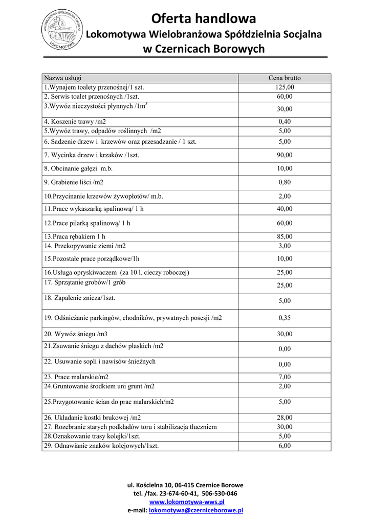 Oferta handlowa Lokomotywa Wielobranżowa Spółdzielnia Socjalna w Czernicach Borowych Nazwa usługi 1.Wynajem toalety przenośnej/1 szt. 2. Serwis toalet przenośnych /1szt. 3.Wywóz nieczystości płynnych /1m3 Cena brutto 125,00 60,00 30,00 4. Koszenie trawy /m2 5.Wywóz trawy, odpadów roślinnych /m2 0,40 5,00 6. Sadzenie drzew i krzewów oraz przesadzanie / 1 szt. 5,00 7. Wycinka drzew i krzaków /1szt. 90,00 8. Obcinanie gałęzi m.b. 10,00 9. Grabienie liści /m2 0,80 10.Przycinanie krzewów żywopłotów/ m.b. 2,00 11.Prace wykaszarką spalinową/ 1 h 40,00 12.Prace pilarką spalinową/ 1 h 60,00 13.Praca rębakiem 1 h 14. Przekopywanie ziemi /m2 85,00 3,00 15.Pozostałe prace porządkowe/1h 10,00 16.Usługa opryskiwaczem (za 10 l. cieczy roboczej) 17. Sprzątanie grobów/1 grób 25,00 18. Zapalenie znicza/1szt. 5,00 19. Odśnieżanie parkingów, chodników, prywatnych posesji /m2 0,35 20. Wywóz śniegu /m3 30,00 21.Zsuwanie śniegu z dachów płaskich /m2 0,00 22. Usuwanie sopli i nawisów śnieżnych 0,00 23. Prace malarskie/m2 24.Gruntowanie środkiem uni grunt /m2 7,00 2,00 25.Przygotowanie ścian do prac malarskich/m2 5,00 26. Układanie kostki brukowej /m2 27. Rozebranie starych podkładów toru i stabilizacja tłuczniem 28.Oznakowanie trasy kolejki/1szt. 29. Odnawianie znaków kolejowych/1szt. 28,00 30,00 5,00 6,00 ul. Kościelna 10, 06-415 Czernice Borowe tel. /fax. 23-674-60-41, 506-530-046 www.lokomotywa-wws.pl e-mail: [email protected] 25,00