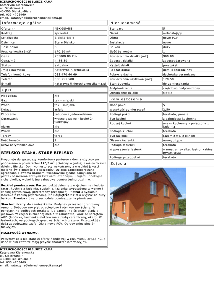 NIERUCHOMOŚCI BIELSKIE KAMA Katarzyna Kierznowska ul. Siostrzana 4 43-300 Bielsko-Biała tel. 033 4706469 email. [email protected] Informacje ogólne Nieruchomość Oferta nr NBK-DS-688 Standard 5 Rodzaj sprzedaż Garaż wolnostojący Lokalizacja Bielsko-Biała Okna nowe PCV Dzielnica Stare Bielsko Instalacje nowe Ilość pokoi 5 Balkon duży Pow. całkowita [m2] 170.50 m² Ilość balkonów 1 Cena 765000.00 PLN Powierzchnia działki [m2] 900.00 Cena/m2 4486.80 Zagosp. działki zagospodarowana Status aktualna Kształt działki prostokąt Imię i nazwisko Katarzyna Kierznowska Rodzaj domu dom jednorodzinny Telefon komórkowy 033 470 64 69 Pokrycie dachu dachówka ceramiczna Telefon 508 251 500 Powierzchnia użytkowa [m2] 170,50 E-mail [email protected] Stan budynku do zamieszkania Podpiwniczenie częściowo podpiwniczony Ogrodzenie działki siatka Opis Plac zabaw nie Gaz tak - miejski Pomieszczenia Woda tak - miejska Ilość pokoi 5 Dojazd asfalt Wysokość pomieszczeń 2,50 Otoczenie zabudowa jednorodzinna Podłogi pokoi terakota, panele Ogrzewanie własne gazowe - kocioł 2funkcyjny Typ kuchni z zabudową kuchenną Rodzaj kuchni aneks kuchenny - połączony z jadalnią Alarm nie Winda nie Podłoga kuchni terakota Tarasy taras Typ łazienki razem z wc, z oknem Ilość tarasów 1 Glazura łazienki nowego typu Drzwi antywłamaniowe nie Podłoga łazienki terakota Wyposażenie łazienki wanna, umywalka, lustro, kabina prysznicowa Podłoga przedpokoi terakota BIELSKO-BIAŁA, STARE BIELSKO Proponuję do sprzedaży komfortowy parterowy dom z użytkowym poddaszem o powierzchni 170,5 m2 położony w jednej z malowniczych dzielnic Bielska. Dom wolnostojący wykończony z wysokiej jakości materiałów z dbałością o szczegóły. Działka zagospodarowana, ogrodzona z dwoma bramami wjazdowymi (jedna zamykana na pilota) obsadzona licznymi krzewami ozdobnymi i tujami. Spokojna i cicha okolica, wokół luźna zabudowa domów jednorodzinnych. Rozkład pomieszczeń: Parter: pokój dzienny z wyjściem na nieduży taras, kuchnia z jadalnią, sypialnia, łazienka wyposażona w wannę i kabinę prysznicową, przestronny przedpokój. Piętro: 3 sypialnie, łazienka z kabiną prysznicową. Na Półpiętrze z klatki wyjście na duży balkon. Piwnica - dwa przechodnie pomieszczenia piwniczne. Stan techniczny: do zamieszkania. Budynek przeszedł gruntowny remont. Dobudowano piętro, ocieplono i otynkowano ściany. W pokojach na podłogach terakota lub panele, na ścianach gładzie gipsowe. W części kuchennej meble w zabudowie, wraz ze sprzętem AGD (lodówka, kuchenka elektryczna z płytą ceramiczną, okap). W łazienkach, na podłogach gres, na ścianach glazura. Przedpokój z dużą zabudowaną szafą. Okna nowe PCV. Ogrzewanie: piec 2funkcyjny. MOŻLIWOŚĆ WYNAJMU. Powyższy opis nie stanowi oferty handlowej w rozumieniu art.66 KC, a dane w nim zawarte mają jedynie charakter informacyjny. NIERUCHOMOŚCI BIELSKIE KAMA Katarzyna Kierznowska ul. Siostrzana 4 43-300 Bielsko-Biała tel. 033 4706469 email. [email protected] Zdjęcia