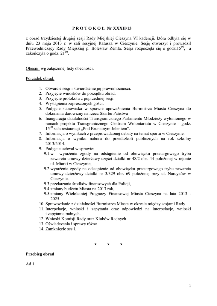 P R O T O K Ó Ł Nr XXXII/13 z obrad trzydziestej drugiej sesji Rady Miejskiej Cieszyna VI kadencji, która odbyła się w dniu 23 maja 2013 r. w sali sesyjnej Ratusza w Cieszynie. Sesję otworzył i prowadził Przewodniczący Rady Miejskiej p. Bolesław Zemła. Sesja rozpoczęła się o godz.1500, a zakończyła o godz. 2110. Obecni: wg załączonej listy obecności. Porządek obrad: Otwarcie sesji i stwierdzenie jej prawomocności. Przyjęcie wniosków do porządku obrad. Przyjęcie protokołu z poprzedniej sesji. Wystąpienia zaproszonych gości. Podjęcie stanowiska w sprawie upoważnienia Burmistrza Miasta Cieszyna do dokonania darowizny na rzecz Skarbu Państwa 6. Inauguracja działalności Transgranicznego Parlamentu Młodzieży wyłonionego w ramach projektu Transgranicznego Centrum Wolontariatu w Cieszynie - godz. 1500 sala restauracji „Pod Brunatnym Jeleniem”. 7. Informacja o wynikach z przeprowadzonej debaty na temat sportu w Cieszynie. 8. Informacja o wyniku naboru do przedszkoli publicznych na rok szkolny 2013/2014. 9. Podjęcie uchwał w sprawie: 9.1.w wyrażenia zgody na odstąpienie od obowiązku przetargowego trybu zawarcia umowy dzierżawy części działki nr 48/2 obr. 44 położonej w rejonie ul. Miarki w Cieszynie, 9.2.wyrażenia zgody na odstąpienie od obowiązku przetargowego trybu zawarcia umowy dzierżawy działki nr 3/329 obr. 69 położonej przy ul. Narcyzów w Cieszynie. 9.3.przekazania środków finansowych dla Policji, 9.4.zmiany budżetu Miasta na 2013 rok, 9.5.zmiany Wieloletniej Prognozy Finansowej Miasta Cieszyna na lata 2013 2025. 10. Sprawozdanie z działalności Burmistrza Miasta w okresie między sesjami Rady. 11. Interpelacje, wnioski i zapytania oraz odpowiedzi na interpelacje, wnioski i zapytania radnych. 12. Wnioski Komisji Rady oraz Klubów Radnych. 13. Oświadczenia i sprawy różne. 14. Zamknięcie sesji. 1. 2. 3. 4. 5. x x x Przebieg obrad Ad 1. 1 Trzydziestą drugą sesję Rady Miejskiej Cieszyna otworzył i prowadził Przewodniczący Rady Pan Bolesław Zemła. Na podstawie listy obecności stwierdził prawomocność obrad. W sesji uczestniczyło 21 radnych. Przewodniczący Rady przywitał Pana Jana Kielocha Komendanta Komendy Powiatowej Państwowej Straży Pożarnej w Cieszynie, Burmistrza Miasta Cieszyna p. Mieczysława Szczurka, I Z-cę Burmistrza Miasta p. Jana Matuszka, II Z-cę Burmistrza Miasta p. Adama Swakonia, Sekretarza Miasta p. Stanisława Kaweckiego, dyrektorów miejskich jednostek organizacyjnych, naczelników wydziałów Urzędu Miejskiego, przedstawicieli prasy lokalnej oraz publiczność. Ad 2. Bolesław Zemła – zapytał o uwagi do porządku obrad. Uwag nie zgłoszono. Ad 3. Bolesław Zemła - zapytał o uwagi do protokołu z sesji, która odbyła się w dniu 25 kwietnia 2013 roku. Uwag do protokołu nie zgłoszono. Przewodniczący Rady stwierdził, iż tym samym protokół został przez Radę przyjęty. Ad 4. Bolesław Zemła – udzielił głosu p. Janowi Kielochowi Komendantowi Komendy Powiatowej Państwowej Straży Pożarnej w Cieszynie. Jan Kieloch – w swoim wystąpieniu zwrócił się do Rady Miejskiej o upoważnienie przez Radę Burmistrza Miasta Cieszyna do dokonania na rzecz Skarbu Państwa darowizny działek wymienionych w uchwale Rady z dnia 26 kwietnia 2012 roku, na których planowana jest budowa nowej siedziby Komendy Powiatowej Państwowej Straży Pożarnej w Cieszynie. Obecna siedziba PSP znajduje się w dzierżawionych pomieszczeniach po byłej zakładowej straży pożarnej PPG Polifarb Cieszyn. PSP ponosi wysokie koszty utrzymania tych pomieszczeń, a i sama lokalizacja Komendy nie jest optymalna. Mienie we władaniu Skarbu Państwa przy ul. Wojska Polskiego, które Straż posiada w trwałym zarządzie, chciałaby zamienić za działki przy ul. Motokrosowej. Istnieje możliwość uzyskania środków na budowę nowej siedziby od Wojewody, ale Komenda musi być właścicielem terenu, najpóźniej do końca czerwca br. ponieważ już w lipcu jest tworzony przyszłoroczny budżet operacyjny. Na zakończenie jeszcze raz zwrócił się do Rady Miejskiej z prośbą o upoważnienie Burmistrza Miasta do rozpoczęcia procedury przekazania działek. Bolesław Zemła – złożył wniosek o wprowadzenie do porządku obrad stanowiska Rady Miejskiej w sprawie upoważnienia Burmistrza Miasta Cieszyna do dokonania darowizny na rzecz Skarbu Państwa i poddał go pod głosowanie. Wniosek został przyjęty przez Radę jednogłośnie, 20 głosami za. 2 Ad 5. Bolesław Zemła – przestawił projekt stanowiska w sprawie upoważnienia Burmistrza Miasta Cieszyna do dokonania darowizny na rzecz Skarbu Państwa i poddał go pod głosowanie. Rada jednogłośnie, 20 głosami za przyjęła stanowisko w sprawie upoważnienia Burmistrza Miasta Cieszyna do dokonania darowizny na rzecz Skarbu Państwa. Ad 6. Rada udała się do sali restauracji „Pod Brunatnym Jeleniem”, gdzie odbyła się inauguracja działalności Transgranicznego Parlamentu Młodzieży, wyłonionego w ramach projektu Transgranicznego Centrum Wolontariatu w Cieszynie. Celem spotkania było przedstawienie założeń Transgranicznego Parlamentu Młodzieży; „Obywatele, czy konsumenci – Cieszyn młodego pokolenia”. Spotkanie przebiegało wg następującego porządku: 1. Przywitanie zebranych przez Przewodniczącego Rady Miejskiej Cieszyna p. Bolesława Zemłę. 2. Projekcja filmu „Wehikuł czasu”, przedstawiającego historię miasta. 3. Słowo do młodych i nie tylko. Cieszyn – miasto młode w każdym wieku, wystąpienie p. Michała Palucha. 4. Prezentacja struktury i funkcji Transgranicznego Parlamentu Młodzieży. Wręczenie wyróżnień i podręczników dla Wolontariuszy TCW, wystąpienie p. Wojciecha Szczurka. 5. Prezentacja metodologicznych podstaw badania KAMAMI 2013 i przyszłych parlamentarzystów, wystąpienie p. Krzysztofa Kuli. 6. Dyskusja obejmowała takie zagadnienia jak: - jak młodzież może wpłynąć na decyzyjność radnych, - c
