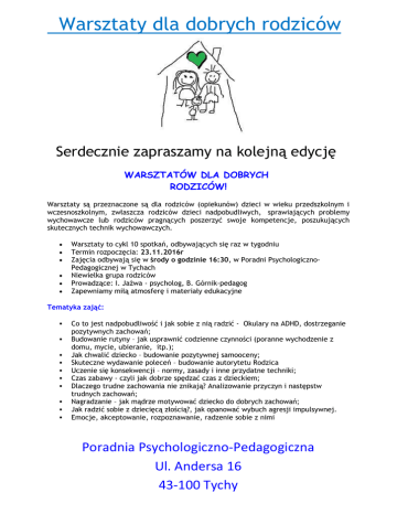 Warsztaty dla dobrych rodziców Serdecznie zapraszamy na kolejną edycję WARSZTATÓW DLA DOBRYCH RODZICÓW! Warsztaty są przeznaczone są dla rodziców (opiekunów) dzieci w wieku przedszkolnym i wczesnoszkolnym, zwłaszcza rodziców dzieci nadpobudliwych, sprawiających problemy wychowawcze lub rodziców pragnących poszerzyć swoje kompetencje, poszukujących skutecznych technik wychowawczych. Warsztaty to cykl 10 spotkań, odbywających się raz w tygodniu Termin rozpoczęcia: 23.11.2016r Zajęcia odbywają się w środy o godzinie 16:30, w Poradni PsychologicznoPedagogicznej w Tychach Niewielka grupa rodziców Prowadzące: I. Jaźwa - psycholog, B. Górnik-pedagog Zapewniamy miłą atmosferę i materiały edukacyjne Tematyka zająć: Co to jest nadpobudliwość i jak sobie z nią radzić - Okulary na ADHD, dostrzeganie pozytywnych zachowań; Budowanie rutyny – jak usprawnić codzienne czynności (poranne wychodzenie z domu, mycie, ubieranie, itp.); Jak chwalić dziecko – budowanie pozytywnej samooceny; Skuteczne wydawanie poleceń – budowanie autorytetu Rodzica Uczenie się konsekwencji – normy, zasady i inne przydatne techniki; Czas zabawy - czyli jak dobrze spędzać czas z dzieckiem; Dlaczego trudne zachowania nie znikają? Analizowanie przyczyn i następstw trudnych zachowań; Nagradzanie – jak mądrze motywować dziecko do dobrych zachowań; Jak radzić sobie z dziecięcą złością?, jak opanować wybuch agresji impulsywnej. Emocje, akceptowanie, rozpoznawanie, radzenie sobie z nimi Poradnia Psychologiczno-Pedagogiczna Ul. Andersa 16 43-100 Tychy Akademia świadomego rodzica Spotkania odbywać się będą w siedzibie Poradni, Tychy, Andersa 16 NAZWA I RODZAJ ZAJĘĆ PROWADZĄCY Jak pomóc dziecku rozpoczynającemu naukę szkolną? D. Piórek Przyczyny powstawania kryzysów w związkach małżeńskich i partnerskich. B. Czarnota-Palenik A. Jendrasik Ekonomiczne, społeczne i psychologiczne skutki rozwodu rodziców dla dziecka B. Czarnota-Palenik A. Jendrasik Jak skutecznie wymagać? J. Kośmińska Jak stymulować rozwój dziecka by dobrze czytało i pisało? warsztaty B. Górnik, I . Jaźwa Wspieranie rozwoju ruchowego oraz rozwoju ręki. W. Mikanik, J. Kuzio Rodzina jako system B. Czarnota-Palenik A. Jendrasik Dziecko z zespołem nadpobudliwości. J. Kuzio, I. Stefańska Jak pomóc dziecku radzić sobie ze stresem? D. Piórek Jak pomóc dziecku wybrać zawód? A. Pilszek Jak wychowywać do odpowiedzialności? J. Kośmińska Szczęśliwy rodzic, szczęśliwe dziecko. J. Kustwan Rozwijanie samodzielności u dzieci D. Piórek Łatwo kochać, trudno dyscyplinować. L. Kubecko, T.Jagiełka Jak wychowywać bez porażek J. Kośmińska Jak rozmawiać z dzieckiem o seksualności? „Skąd się biorą dzieci?” H. Walicka Zaburzenia jedzenia i wydalania u małych dzieci. J. Gajda, A. KalbarczykWanot Jak zachęcić dziecko do współpracy? J. Kuzio, I. Stefańska Jak uchronić dziecko od molestowania seksualnego? H. Walicka Jak skutecznie komunikować się z dzieckiem? J. Kośmińska Zapisy drogą mailową lub telefonicznie Poradnia Psychologiczno- Pedagogiczna w Tychach ul. Andersa 16 43-100 Tychy tel. (032) 22 72 392; (032) 327 17 66 e-mail: [email protected] www: www.ppptychy.pl ZAPRASZAMY !!!
