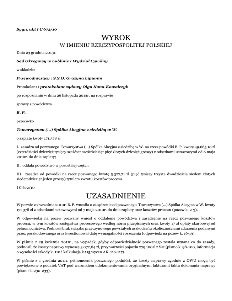 Sygn. akt I C 672/10 WYROK W IMIENIU RZECZYPOSPOLITEJ POLSKIEJ Dnia 23 grudnia 2013r. Sąd Okręgowy w Lublinie I Wydział Cywilny w składzie: Przewodniczący : S.S.O. Grażyna Lipianin Protokolant : protokolant sądowy Olga Kuna-Kowalczyk po rozpoznaniu w dniu 26 listopada 2013r. na rozprawie sprawy z powództwa B. P. przeciwko Towarzystwu (...) Spółka Akcyjna z siedzibą w W. o zapłatę kwoty 171.378 zł I. zasadza od pozwanego Towarzystwa (...) Spółka Akcyjna z siedzibą w W. na rzecz powódki B. P. kwotę 49.665,10 zł (czterdzieści dziewięć tysięcy sześćset sześćdziesiąt pięć złotych dziesięć groszy) z odsetkami ustawowymi od 6 maja 2010r. do dnia zapłaty; II. oddala powództwo w pozostałej części; III. zasądza od powódki na rzecz pozwanego kwotę 5.327,71 zł (pięć tysięcy trzysta dwadzieścia siedem złotych siedemdziesiąt jeden groszy) tytułem zwrotu kosztów procesu. I C 672/10 UZASADNIENIE W pozwie z 7 września 2010r. B. P. wnosiła o zasądzenie od pozwanego Towarzystwa (...) Spółka Akcyjna w W. kwoty 171 378 zł z odsetkami ustawowymi od 7 maja 2010r. do dnia zapłaty oraz kosztów procesu (pozew k. 2-3). W odpowiedzi na pozew pozwany wniósł o oddalenie powództwa i zasądzenie na rzecz pozwanego kosztów procesu, w tym kosztów zastępstwa procesowego według norm przepisanych oraz kwoty 17 zł opłaty skarbowej od pełnomocnictwa. Podnosił brak związku przyczynowego powstałych uszkodzeń z okolicznościami zdarzenia podanymi przez poszkodowanego oraz kwestionował datę wymagalności roszczenia (odpowiedź na pozew k. 16-19). W piśmie z 29 kwietnia 2011r., na wypadek, gdyby odpowiedzialność pozwanego została uznana co do zasady, podnosił, że koszty naprawy wynoszą 3 072,84 zł, przy wartości pojazdu 279 100zł z Vat (pismo k. 98-100, informacja o wysokości szkody k. 110 i kalkulacja k.115,wycen AK. 116-117). W piśmie z 1 grudnia 2011r. pełnomocnik pozwanego podniósł, że koszty naprawy zgodnie z OWU mogą być powiększone o podatek VAT pod warunkiem udokumentowania oryginalnymi fakturami faktu dokonania naprawy (pismo k. 230-233). Sąd ustalił następujący stan faktyczny: Towarzystwo (...) Spółka Akcyjna z siedzibą w W. wpisana została do Krajowego Rejestru Sądowego za numerem (...) (odpis aktualny z KRS k. 23-28). B. P. zawarła w dniu 20 sierpnia 2009r. z pozwanym umowę ubezpieczenia auto-casco, ze zniesieniem udziału własnego, samochodu osobowego marki L. (...) o numerze rejestracyjnym (...). Wartość pojazdu wskazano na 351 000zł. W umowie przywołano ogólne warunki ubezpieczenia auto-casco wariant standard. Przedstawiciel potwierdził, że w dacie zawierania umowy, samochód był sprawny technicznie, w pełni kompletny, nie nosił widocznych uszkodzeń blacharskich i lakierniczych nadwozia (polisa k.7, wypis z umowy k. 297). Samochód został wyprodukowany w 2008r. W dacie wypadku miał 45 000km przebiegu. Został zakupiony w stanie uszkodzonym na terenie S.. Był naprawiany w Polsce w nieautoryzowanym warsztacie częściami kupowanymi na giełdzie i (...). Po naprawie i badaniach technicznych pojazd został zarejestrowany. Ogólne warunki ubezpieczenia autocasco standard (ogólne warunki k. 30-42v) w § 5 ust. 1 pkt 6) stanowią, że pozwany nie odpowiada za szkody: powstałe w okolicznościach innych niż podane w zgłoszeniu szkody. § 14 stanowi, że szkodę należy zgłosić niezwłocznie telefonicznie do ubezpieczyciela. W pojeździe uszkodzonym nie wolno dokonywać zmian i napraw, o ile nie jest to uzasadnione koniecznością kontynuowania bezpiecznej jazdy, bez uprzedniego przeprowadzenia oględzin przez przedstawiciela W., chyba że W. z przyczyn leżących wyłącznie po jej stronie nie przeprowadziła oględzin w ciągu 7 dni od dnia otrzymania zawiadomienia o szkodzie lub 14 dni, jeżeli niezbędne było powołanie niezależnych rzeczoznawców - § 14 ust. 1 pkt 4) OWU. W okresie ubezpieczenia w pojeździe została wyrządzona szkoda na skutek uderzenia przez kierującego samochodem R. P. w drzewa w dniu 6 kwietnia 2010r. (zeznania R. P. k. 58v-59, D. K. k. 59v). O godzinie 15.15 tego dnia R. P. telefonicznie dokonał zgłoszenia szkody komunikacyjnej (potwierdzenie zgłoszenia w aktach szkody). Podał, że podczas wykonywania manewru mającego na celu uniknięcie zderzenia z sarną, uderzył samochodem w rosnące po prawej stronie drogi drzewo. W rezultacie kolizji uszkodzeniu uległy: zderzak przedni, lampy przednie, błotniki przednie, nawigacja oraz nastąpiło odpalenie poduszek gazowych. Do tych uszkodzeń w formularzu zgłoszenia szkody dopisano także uszkodzenie: czujnika radaru, przekładni kierowniczej, wahacza prawego, opony, felgi i halogenu. R. P. zdemontował na miejscu wypadku zderzak, aby nie uległ dalszemu uszkodzeniu. Pomagał mu jego pracownik D. K.. Uprzątnęli odłamki szkła z miejsca wypadku. Samochód na holowniku przewieźli na podwórko R. P.. Policji nie wzywali. Po oględzinach pojazdu likwidator szkody z ramienia pozwanego J. B. wycenił 16 kwietnia 2010r. wysokość szkody – koszty naprawy na 140 473,58zł netto (z VAT 171 377,77zł) i wartość rynkową pojazdu w dniu szkody na 279 100zł. Oglądał pojazd już po zdemontowaniu części wyposażenia (informacja o wysokości szkody k. 8, kalkulacja naprawy k. 9-10). Rzeczoznawca z W. obejrzał samochód i miejsce zdarzenia w dniu 28 kwietnia 2010r. (sprawozdanie z czynności w aktach szkody). 10 czerwca 2010r. pozwany odmówił wypłaty odszkodowania na podstawie § 5 ust. 1 pkt 6 OWU auto-casco standard. Podniósł, że szkoda powstała w innych warunkach niż podane w zgłoszeniu (decyzja k. 11). Odwołanie powódki nie zostało uwzględnione (pismo k. 12). W przypadku szkody częściowej zgodnie z § 17 OWU odszkodowanie obejmuje koszty naprawy pojazdu mające związek przyczynowy ze zdarzeniem objętym ochroną ubezpieczeniową. Kwota odszkodowania może uwzględniać koszty użycia zmodernizowanych czę