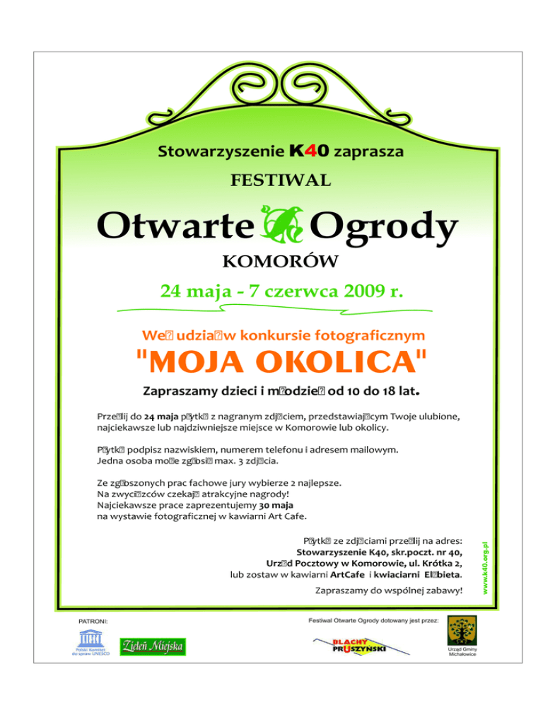 Stowarzyszenie K40 zaprasza FESTIWAL Otwarte Ogrody KOMORÓW 24 maja - 7 czerwca 2009 r. Weź udział w konkursie fotograficznym " M O J A O K O L I C A " Zapraszamy dzieci i młodzież od 10 do 18 lat. Prześlij do 24 maja płytkę z nagranym zdjęciem, przedstawiającym Twoje ulubione, najciekawsze lub najdziwniejsze miejsce w Komorowie lub okolicy. Płytkę podpisz nazwiskiem, numerem telefonu i adresem mailowym. Jedna osoba może zgłosić max. 3 zdjęcia. Płytkę ze zdjęciami prześlij na adres: Stowarzyszenie K40, skr.poczt. nr 40, Urząd Pocztowy w Komorowie, ul. Krótka 2, lub zostaw w kawiarni ArtCafe i kwiaciarni Elżbieta. Zapraszamy do wspólnej zabawy! PATRONI: Festiwal Otwarte Ogrody dotowany jest przez: Urząd Gminy Michałowice www.k40.org.pl Ze zgłoszonych prac fachowe jury wybierze 2 najlepsze. Na zwycięzców czekają atrakcyjne nagrody! Najciekawsze prace zaprezentujemy 30 maja na wystawie fotograficznej w kawiarni Art Cafe.