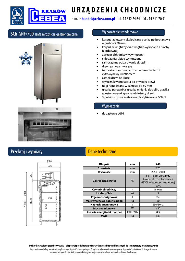URZĄDZENIA CHŁODNICZE e-mail: [email protected] tel. 14 612 24 64 faks 14 611 70 51 Wyposażenie standardowe SCh-GNF/700 szafa mroźnicza gastronomiczna • • • • • • • • • • • • korpus izolowany ekologiczną pianką poliuretanową o grubości 70 mm korpus zewnętrzny oraz wnętrze wykonane z blachy nierdzewnej agregat chłodniczy wewnętrzny chłodzenie: obieg wymuszony samoczynne odparowanie skroplin drzwi samozamykające termostat z automatycznym odszranianiem i cyfrowym wyświetlaczem zamek drzwi na klucz wyłącznik wentylatora po otwarciu drzwi nogi regulowane w zakresie do 50 mm grzałka parownika, grzałka rynienki skroplin, grzałka spustu rynienki, grzałka ościeżnicy drzwi 3 półki rusztowe metalowe plastyfikowane GN2/1 Wyposażenie • Przekrój i wymiary dodatkowe półki Dane techniczne Długość Szerokość Wysokość mm mm mm Zakres temperatur °C Czynnik chłodniczy Liczba półek Pojemność użytkowa Maksymalne obciążenie półki Napięcie znamionowe Moc znamionowa Zużycie energii elektrycznej Masa szt l kg V W kWh/24h kg 740 870 2050 - 2100 od –18 do -21°C przy temperaturze otoczenia + 43°C i wilgotności względnej 60% R404A 3 550 30 230/50hz 450 8,5 136 Do krótkotrwałego przechowywania i ekspozycji produktów spożywczych uprzednio wychłodzonych do temperatury przechowywania Zaprezentowane kolory wykończeń urządzeń mogą się różnić od rzeczywistych. W wyborze odpowiedniego koloru proszę się posłużyć próbnikiem. Zastrzega się prawo do zmian bez uprzedzenia. Niniejsza karta katalogowa nie jest ofertą handlową w rozumieniu Prawa Handlowego.