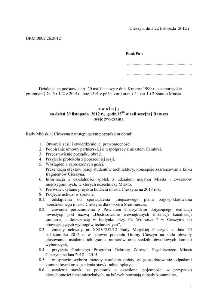 Cieszyn, dnia 22 listopada 2012 r. BRM.0002.26.2012 Pani/Pan ........................................................... ........................................................... Działając na podstawie art. 20 ust.1 ustawy z dnia 8 marca 1990 r. o samorządzie gminnym (Dz. Nr 142 z 2001r., poz.1591 z późn. zm.) oraz § 11 ust.1 i 2 Statutu Miasta zwołuję na dzień 29 listopada 2012 r., godz.1500 w sali sesyjnej Ratusza sesję zwyczajną Rady Miejskiej Cieszyna z następującym porządkiem obrad: Otwarcie sesji i stwierdzenie jej prawomocności. Podpisanie umowy partnerskiej o współpracy z miastem Cambrai. Przedstawienie porządku obrad. Przyjęcie protokołu z poprzedniej sesji. Wystąpienia zaproszonych gości. Prezentacja efektów pracy studentów architektury, koncepcje zaaranżowania kilku fragmentów Cieszyna. 6. Informacja z działalności spółek z udziałem majątku Miasta i związków międzygminnych, w których uczestniczy Miasto. 7. Pierwsze czytanie projektu budżetu miasta Cieszyna na 2013 rok. 8. Podjęcie uchwał w sprawie: 8.1. odstąpienia od sporządzenia miejscowego planu zagospodarowania przestrzennego miasta Cieszyna dla obszaru Śródmieścia, 8.2. zawarcia porozumienia z Powiatem Cieszyńskim dotyczącego realizacji inwestycji pod nazwą „Dostosowanie wewnętrznych instalacji kanalizacji sanitarnej i deszczowej w budynku przy Pl. Wolności 7 w Cieszynie do obowiązujących wymogów technicznych”, 8.3. zmiany uchwały nr XXIV/252/12 Rady Miejskiej Cieszyna z dnia 25 października 2012 r. w sprawie podziału Gminy Cieszyn na stałe obwody głosowania, ustalenia ich granic, numerów oraz siedzib obwodowych komisji wyborczych, 8.4. przyjęcia Gminnego Programu Ochrony Zdrowia Psychicznego Miasta Cieszyna na lata 2012 – 2015, 8.5. w sprawie wyboru metody ustalenia opłaty za gospodarowanie odpadami komunalnymi oraz ustalenia stawki takiej opłaty, 8.6. ustalenia stawki za pojemnik o określonej pojemności w przypadku nieruchomości niezamieszkałych, na których powstają odpady komunalne, 1. 2. 3. 4. 5. 1 2 wzoru deklaracji o wysokości opłaty za gospodarowanie odpadami komunalnymi, składanej przez właściciela nieruchomości, 8.8. określenia terminu, częstotliwości i trybu uiszczania opłaty za gospodarowanie odpadami komunalnymi, 8.9. określenia szczegółowego sposobu i zakresu świadczenia usług w zakresie odbierania odpadów komunalnych od właścicieli nieruchomości i zagospodarowania tych odpadów w zamian za uiszczaną przez właścicieli nieruchomości opłatę za gospodarowanie odpadami komunalnymi, 8.10. w sprawie rodzaju dodatkowych usług świadczonych przez gminę w zakresie odbierania odpadów komunalnych od właścicieli nieruchomości i zagospodarowanie tych odpadów oraz wysokości cen za te usługi, 8.11. uchwalenia regulaminu utrzymania czystości i porządku na terenie Gminy Cieszyn, 8.12. prowadzenia z województwem Śląskim jako wspólnej instytucji kultury „Zamek Cieszyn. Ośrodek Badań i Dokumentacji nad Kulturą Materialną i Wzornictwem” i zmiany jej nazwy, 8.13. przyjęcia projektu statutu instytucji kultury „Zamek Cieszyn. Ośrodek Badań i Dokumentacji nad Kulturą Materialną i Wzornictwem”, 8.14. wieloletniego planu rozwoju i modernizacji urządzeń kanalizacyjnych zlokalizowanych na terenie miasta Cieszyna, na lata 2013 – 2017, 8.15. zmiany uchwały nr XVI/150/07 z dnia 29 listopada 2007 r. w sprawie wprowadzenia na terenie miasta Cieszyna zwolnień niektórych nieruchomości z podatku od nieruchomości, 8.16. zmiany uchwały nr XXIV/241/12 Rady Miejskiej Cieszyna z dnia 25 października 2012 r. w sprawie określenia na rok 2013 stawek podatku od środków transportowych, 8.17. przyjęcia zasad i trybu udzielania i rozliczania dotacji na prace konserwatorskie, restauratorskie i roboty budowlane przy zabytkach wpisanych do rejestru, znajdujących się na terenie miasta Cieszyna, 8.18. zmiany budżetu Miasta na 2012 rok, 8.19. zmiany Wieloletniej Prognozy Finansowej Miasta Cieszyna na lata 2012 – 2025. 9. Sprawozdanie z działalności Burmistrza Miasta w okresie między sesjami Rady. 10. Interpelacje, wnioski i zapytania oraz odpowiedzi na interpelacje, wnioski i zapytania radnych. 11. Wnioski Komisji Rady oraz Klubów Radnych. 12. Oświadczenia i sprawy różne. 13. Zamknięcie sesji. 8.7. Przewodniczący Rady Miejskiej Cieszyna Bolesław Zemła 3 Usprawiedliwienia nieobecności radni składają w Biurze Rady Miejskiej, pod nr tel. 33-4794 311; 33-4794 312; tel. kom.782981046 lub mailem na adres: [email protected]