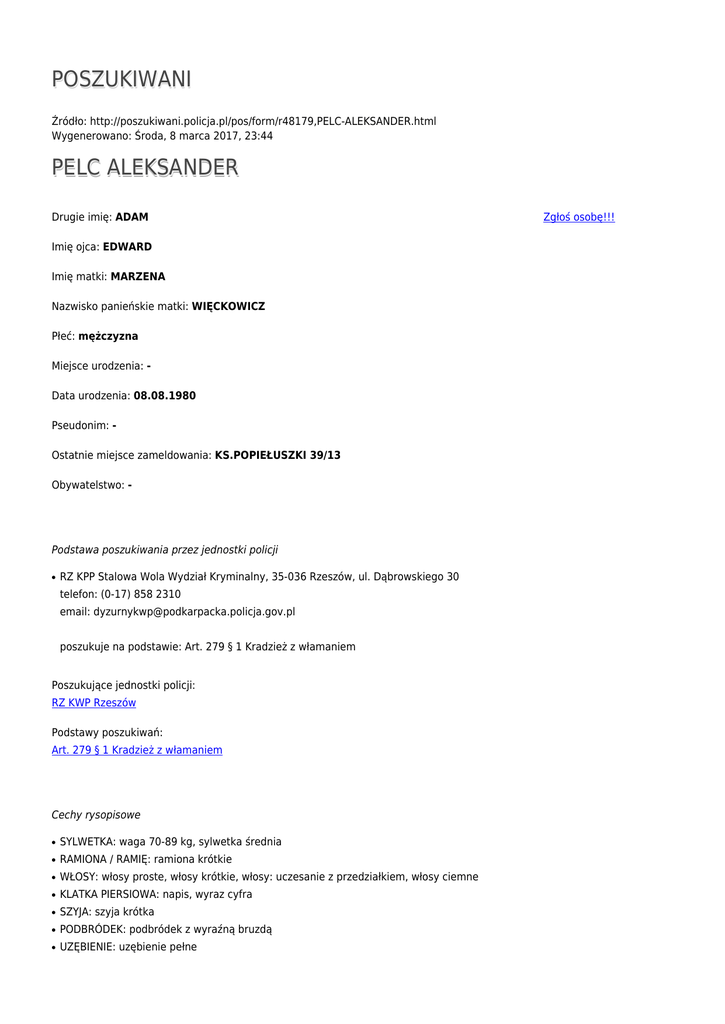 POSZUKIWANI Źródło: http://poszukiwani.policja.pl/pos/form/r48179,PELC-ALEKSANDER.html Wygenerowano: Środa, 8 marca 2017, 23:44 PELC ALEKSANDER Drugie imię: ADAM Imię ojca: EDWARD Imię matki: MARZENA Nazwisko panieńskie matki: WIĘCKOWICZ Płeć: mężczyzna Miejsce urodzenia: Data urodzenia: 08.08.1980 Pseudonim: Ostatnie miejsce zameldowania: KS.POPIEŁUSZKI 39/13 Obywatelstwo: - Podstawa poszukiwania przez jednostki policji ● RZ KPP Stalowa Wola Wydział Kryminalny, 35-036 Rzeszów, ul. Dąbrowskiego 30 telefon: (0-17) 858 2310 email: [email protected] poszukuje na podstawie: Art. 279 § 1 Kradzież z włamaniem Poszukujące jednostki policji: RZ KWP Rzeszów Podstawy poszukiwań: Art. 279 § 1 Kradzież z włamaniem Cechy rysopisowe ● SYLWETKA: waga 70-89 kg, sylwetka średnia ● RAMIONA / RAMIĘ: ramiona krótkie ● WŁOSY: włosy proste, włosy krótkie, włosy: uczesanie z przedziałkiem, włosy ciemne ● KLATKA PIERSIOWA: napis, wyraz cyfra ● SZYJA: szyja krótka ● PODBRÓDEK: podbródek z wyraźną bruzdą ● UZĘBIENIE: uzębienie pełne Zgłoś osobę!!! ● WARGI (USTA): wargi cienkie ● USZY / UCHO: uszy normalne ● NOS: kolor nosa naturalny, nos średni, nos prostolinijny, koniuszek nosa opuszczony ● POWIEKI / POWIEKA: kreska ● ŁYDKI / ŁYDKA: smok ● UDA / UDO: tygrys ● NOGI / NOGA: nogi krótkie ● OCZY / OKO: oczy wąsko rozstawione, oczy wpadnięte ● CZOŁO: czoło wysokie ● PALCE / PALEC: palce rąk grube, palce rąk krótkie, kropka ● DŁONIE / DŁOŃ: dłonie drobne ● NADGARSTKI / NADGARSTEK: napis, wyraz cyfra, napis, wyraz cyfra ● TWARZ: cera czerstwa, twarz pełna, tłusta, twarz okrągła, brak zarostu Wzrost: 166-170 CM Kolor oczu: NIEZNANE Tweetnij
