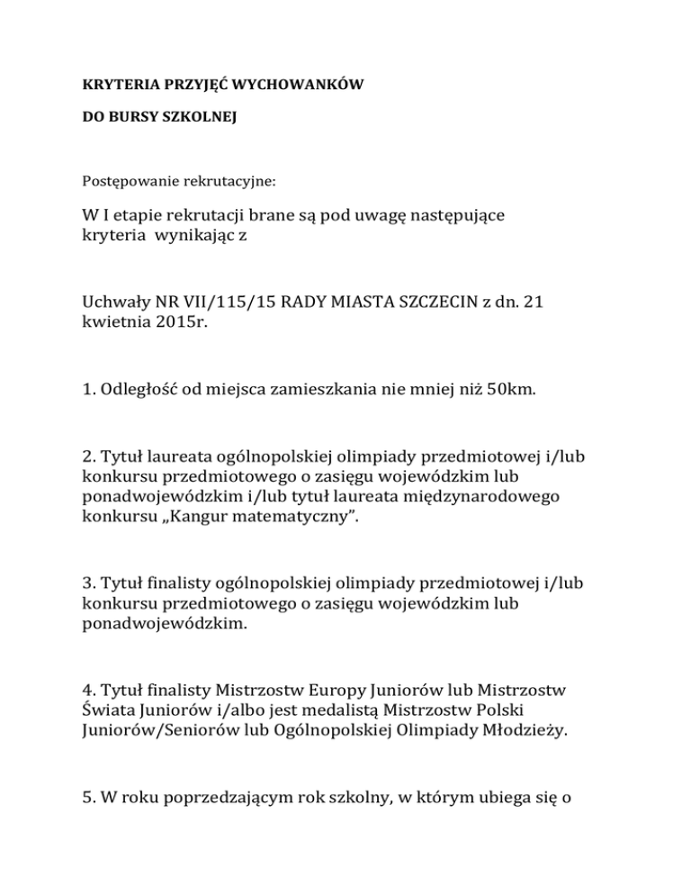 KRYTERIA PRZYJĘĆ WYCHOWANKÓW DO BURSY SZKOLNEJ Postępowanie rekrutacyjne: W I etapie rekrutacji brane są pod uwagę następujące kryteria wynikając z Uchwały NR VII/115/15 RADY MIASTA SZCZECIN z dn. 21 kwietnia 2015r. 1. Odległość od miejsca zamieszkania nie mniej niż 50km. 2. Tytuł laureata ogólnopolskiej olimpiady przedmiotowej i/lub konkursu przedmiotowego o zasięgu wojewódzkim lub ponadwojewódzkim i/lub tytuł laureata międzynarodowego konkursu ,,Kangur matematyczny”. 3. Tytuł finalisty ogólnopolskiej olimpiady przedmiotowej i/lub konkursu przedmiotowego o zasięgu wojewódzkim lub ponadwojewódzkim. 4. Tytuł finalisty Mistrzostw Europy Juniorów lub Mistrzostw Świata Juniorów i/albo jest medalistą Mistrzostw Polski Juniorów/Seniorów lub Ogólnopolskiej Olimpiady Młodzieży. 5. W roku poprzedzającym rok szkolny, w którym ubiega się o przyjęcie do bursy uzyskał stypendium Prezesa Rady Ministrów lub /i stypendium Ministra Edukacji Narodowej. 6. W roku poprzedzającym rok szkolny, w którym ubiega się o przyjęcie do bursy uzyskał świadectwo promocyjne z wyróżnieniem albo świadectwo ukończenia szkoły podstawowej lub gimnazjum z wyróżnieniem. 7. Kandydat jest lub będzie uczniem publicznego gimnazjum w Szczecinie lub publicznej szkoły ponadgimnazjalnej w Szczecinie w roku szkolnym, w którym przeprowadza się postępowanie rekrutacyjne do bursy szkolnej. 8. Rodzeństwo rodzone, przyrodnie lub przybrane kandydata mieszka w tej samej bursie szkolnej, do której kandydat ubiega się o przyjęcie. 9. Kandydat będzie uczniem pierwszej klasy gimnazjum w Szczecinie lub uczniem pierwszej klasy szkoły ponadgimnazjalnej w Szczecinie w roku szkolnym , na który przeprowadza się postępowanie rekrutacyjne do bursy szkolnej. 10. Kandydat posiada drugą klasę sportową lub wyższą potwierdzoną przez Okręgowy Związek Sportowy i/lub status zawodnika reprezentacji Polski juniorów/seniorów albo status zawodnika ligowego lub zawodnika kadr wojewódzkich. 11. Kandydat jest lub będzie uczniem oddziału sportowego lub oddziału mistrzostwa sportowego w publicznym gimnazjum z oddziałami sportowymi/mistrzostwa sportowego w Szczecinie w roku szkolnym, na który przeprowadza się postępowanie rekrutacyjne do bursy szkolnej. Dokumentami potwierdzającymi ww. kryteria są: 1) W przypadku kryterium określonego w pkt. 1: oświadczenie rodzica (prawnego opiekuna) lub pełnoletniego kandydata, ujęte we wniosku o przyjęcie do bursy szkolnej 2) w przypadku kryterium określonego w pkt. 2: kserokopia dyplomu/zaświadczenia, potwierdzającego uzyskanie przez kandydata tytułu laureata w konkursie/olimpiadzie, poświadczona za zgodność z oryginałem przez rodzica (prawnego opiekuna) lub pełnoletniego kandydata; 3) w przypadku kryterium określonego w pkt. 3 i 4: kserokopia dyplomu/zaświadczenia, potwierdzającego uzyskanie przez kandydata tytułu finalisty lub medalisty w konkursie/olimpiadzie/mistrzostwach, poświadczona za zgodność z oryginałem przez rodzica (prawnego opiekuna) lub pełnoletniego kandydata; 4) w przypadku kryterium określonego w pkt. 5: kserokopia dokumentu, potwierdzającego uzyskanie stypendium, poświadczona za zgodność z oryginałem przez rodzica (prawnego opiekuna) kandydata lub pełnoletniego kandydata; 5) w przypadku kryterium określonego w pkt. 6: kserokopia świadectwa promocyjnego z wyróżnieniem albo kserokopia świadectwa ukończenia szkoły podstawowej z wyróżnieniem lub gimnazjum z wyróżnieniem poświadczona za zgodność z oryginałem przez dyrektora szkoły, której kandydat jest uczniem lub którą ukończył; 6) w przypadku kryteriów określonych w pkt. 7, 9 i 11: zaświadczenie potwierdzone przez dyrektora szkoły w Szczecinie lub osobę przez niego upoważnioną o przyjęciu do szkoły lub kontynuacji kształcenia w danej szkole w roku szkolnym, na który przeprowadza się postępowanie rekrutacyjne do bursy szkolnej – Załącznik Nr 2; 7) w przypadku kryterium określonego w pkt. 8: oświadczenie rodzica (prawnego opiekuna) lub pełnoletniego kandydata, ujęte we wniosku o przyjęcie do bursy szkolnej, 8) w przypadku kryterium określonego w pkt. 10: zaświadczenie wydane przez macierzysty klub sportowy lub odpowiedni związek sportowy. W dalszej kolejności brane są pod uwagę kryteria wynikające z Ustawy o systemie Oświaty z 7 września 1991r.: W przypadku kandydata niepełnoletniego: 1. wielodzietność rodziny kandydata, 2. niepełnosprawność kandydata, 3. niepełnosprawność jednego z rodziców kandydata, 4. niepełnosprawność obojga rodziców kandydata, 5. niepełnosprawność rodzeństwa kandydata, 6. samotne wychowywanie kandydata w rodzinie, 7. objęcie kandydata pieczą zastępczą. W przypadku kandydata pełnoletniego: 1. wielodzietność rodziny kandydata, 2. niepełnosprawność kandydata, 3. niepełnosprawność dziecka kandydata, 4. niepełnosprawność innej osoby bliskiej, nad którą kandydat sprawuje opiekę, 5. samotne wychowywanie dziecka przez kandydata. Spełnianie ww. kryteriów przez kandydata niepełnoletniego deklarują rodzice we wniosku o przyjęcie dziecka do bursy i potwierdzają stosownymi dokumentami (kandydat pełnoletni potwierdza sam). a) oświadczenie o wielodzietności rodziny kandydata - (Załącznik Nr 3) b) orzeczenie o potrzebie kształcenia specjalnego wydane ze względu na niepełnosprawność lub o stopniu niepełnosprawności lub orzeczenie równoważne w rozumieniu przepisów ustawy z dnia 27 sierpnia 1997 o rehabilitacji zawodowej i społecznej oraz zatrudnianiu osób niepełnosprawnych ( Dz.U. z 2011r Nr 127, poz.721, z późn. zm.) c) prawomocny wyrok sądu rodzinnego orzekającego rozwód lub separację lub akt zgonu oraz oświadczenie o samotnym wychowywaniu dziecka oraz niewychowywaniu żadnego dziecka wspólnie z jego rodzicem- (Załącznik Nr 4) d) dokument poświadczający objęcie dziecka pieczą zastępczą zgodnie z ustawą z dnia 9 czerwc