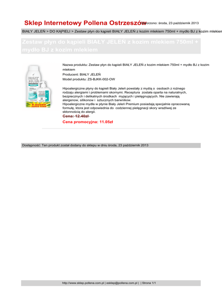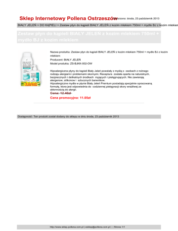 Utworzono: środa, 23 październik 2013 Sklep Internetowy Pollena Ostrzeszów BIAŁY JELEŃ > DO KĄPIELI > Zestaw płyn do kąpieli BIAŁY JELEŃ z kozim mlekiem 750ml + mydło BJ z kozim mlekiem Zestaw płyn do kąpieli BIAŁY JELEŃ z kozim mlekiem 750ml + mydło BJ z kozim mlekiem Nazwa produktu: Zestaw płyn do kąpieli BIAŁY JELEŃ z kozim mlekiem 750ml + mydło BJ z kozim mlekiem Producent: BIAŁY JELEŃ Model produktu: ZS-BJKK-002-OW Hipoalergiczne płyny do kąpieli Biały Jeleń powstały z myślą o osobach z rożnego rodzaju alergiami i problemami skornymi. Receptura została oparta na naturalnych, bezpiecznych i delikatnych środkach myjących i pielęgnujących. Nie zawierają alergenow, silikonow i sztucznych barwnikow. Hipoalergiczne mydła w płynie Biały Jeleń Premium posiadają specjalnie opracowaną formułę, ktora jest odpowiednia do codziennej pielęgnacji skory wrażliwej ze skłonnością do alergii. Cena: 12.40zł Cena promocyjna: 11.05zł Dostępność: Ten produkt został dodany do sklepu w dniu środa, 23 październik 2013 http://www.sklep.pollena.com.pl | [email protected] | | Strona 1/1