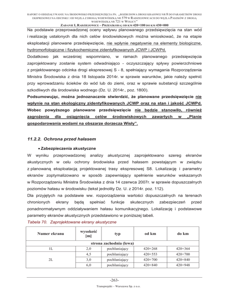 RAPORT O ODDZIAŁYWANIU NA RODOWISKO PRZEDSI WZI CIA PN. „ROZBUDOWA DROGI KRAJOWEJ NR 8 DO PARAMETRÓW DROGI EKSPRESOWEJ NA ODCINKU : OD W ZŁA Z DROG WOJEWÓDZK NR 579 W RADZIEJOWICACH DO W ZŁA P ASZKÓW Z DROG WOJEWÓDZK NR 721 W WOLICY” ZADANIE I, RADZIEJOWICE – PRZESZKODA; OD KM 420+100 DO KM 430+000 Na podstawie przeprowadzonej oceny wpływu planowanego przedsi wzi cia na stan wód i realizacj ustalonych dla nich celów rodowiskowych mo na wnioskowa , e na etapie eksploatacji planowane przedsi wzi cie, nie wpłynie negatywnie na elementy biologiczne, hydromorfologiczne i fizykochemiczne zidentyfikowanych JCWP i JCWPd. Dodatkowo jak wcze niej wspomniano, w ramach planowanego przedsi wzi cia zaprojektowany zostanie system odwadniaj co - oczyszczaj cy spływy powierzchniowe z projektowanego odcinka drogi ekspresowej S - 8, spełniaj cy wymagania Rozporz dzenia Ministra rodowiska z dnia 18 listopada 2014r. w sprawie warunków, jakie nale y spełni przy wprowadzaniu cieków do wód lub do ziemi, oraz w sprawie substancji szczególnie szkodliwych dla rodowiska wodnego (Dz. U. 2014r., poz. 1800). Podsumowuj c, mo na jednoznacznie stwierdzi , e planowane przedsi wzi cie nie wpłynie na stan ekologiczny zidentyfikowanych JCWP oraz na stan i jako JCWPd. Wobec powy szego planowane przedsi wzi cie nie b dzie stanowiło, równie zagro enia dla osi gni cia celów rodowiskowych zawartych w „Planie szereg ekranów gospodarowania wodami na obszarze dorzecza Wisły”. 11.2.2. Ochrona przed hałasem • Zabezpieczenia akustyczne W wyniku przeprowadzonej analizy akustycznych w celu ochrony z planowan eksploatacj akustycznej zaprojektowano rodowiska przed hałasem powstaj cym w zwi zku projektowanej trasy ekspresowej S8. Lokalizacj i parametry ekranów zoptymalizowano w sposób zapewniaj cy spełnienie warunków wskazanych w Rozporz dzeniu Ministra rodowiska z dnia 14 czerwca 2007r. w sprawie dopuszczalnych poziomów hałasu w rodowisku (tekst jednolity Dz. U. z 2014r. poz. 112). Dla przyj tych na podstawie ww. rozporz dzenia warto ci dopuszczalnych na terenach chronionych ekrany b d spełnia funkcje skutecznych zabezpiecze ponadnormatywnym oddziaływaniem hałasu komunikacyjnego. Lokalizacj i podstawowe parametry ekranów akustycznych przedstawiono w poni szej tabeli. Tabela 70. Zaprojektowane ekrany akustyczne Numer ekranu wysoko [m] typ od km do km 420+268 420+364 strona zachodnia (lewa) pochłaniaj cy 1L 2,0 4,5 pochłaniaj cy 420+553 420+700 2L 3,0 pochłaniaj cy 420+700 420+840 6,0 pochłaniaj cy 420+840 420+948 -263Transprojekt – Warszawa Sp. z o.o. przed RAPORT O ODDZIAŁYWANIU NA RODOWISKO PRZEDSI WZI CIA PN. „ROZBUDOWA DROGI KRAJOWEJ NR 8 DO PARAMETRÓW DROGI EKSPRESOWEJ NA ODCINKU : OD W ZŁA Z DROG WOJEWÓDZK NR 579 W RADZIEJOWICACH DO W ZŁA P ASZKÓW Z DROG WOJEWÓDZK NR 721 W WOLICY” ZADANIE I, RADZIEJOWICE – PRZESZKODA; OD KM 420+100 DO KM 430+000 3L 4L 5L-1 5L-2 6L 9L 11L 12L 4,5 pochłaniaj cy 420+948 420+996 3,5 pochłaniaj cy 420+996 421+088 3,0 pochłaniaj cy 421+088 421+144 4,0 mieszany 421+144 421+200 3,5 mieszany 421+200 421+322 2,0 mieszany 421+526 421+548 2,0 odbijaj cy prze roczysty 421+548 (obiekt WS-1) 421+581 (obiekt WS-1) 2,0 mieszany 421+581 421+620 2,0 pochłaniaj cy 421+620 422+000 3,5 odbijaj cy prze roczysty 422+000 422+102 2,5 odbijaj cy prze roczysty 422+098 422+150 2,5 pochłaniaj cy 422+150 422+200 3,0 mieszany 422+200 422+294 2,5 pochłaniaj cy 422+600 422+627 3,0 pochłaniaj cy 422+627 422+650 3,0 mieszany 422+650 422+742 2,5 mieszany 422+742 422+770 2,5 pochłaniaj cy 423+820 423+846 4,0 pochłaniaj cy 423+846 423+946 2,5 pochłaniaj cy 423+946 423+970 4,0 pochłaniaj cy 424+080 424+118 6,0 pochłaniaj cy 424+118 424+238 4,0 pochłaniaj cy 424+238 424+265 4,0 odbijaj cy prze roczysty 424+265 (obiekt MS-2a) 424+308 (obiekt MS-2a) 4,0 pochłaniaj cy 424+398 424+450 5,0 pochłaniaj cy 424+455 424+595 3,5 pochłaniaj cy 424+585 424+713 3,5 pochłaniaj cy 427+166 427+380 7,5 pochłaniaj cy 427+380 427+500 5,0 pochłaniaj cy 427+500 427+600 2,0 pochłaniaj cy 427+600 427+682 4,0 pochłaniaj cy 429+200 429+245 4,5 pochłaniaj cy 429+245 429+400 4,0 pochłaniaj cy 429+400 429+423 4,5 pochłaniaj cy 429+819 (1+195 pik. DZ-429L) 429+852 6,0 pochłaniaj cy 429+852 429+970 4,0 pochłaniaj cy 429+970 429+993,3 -264Transprojekt – Warszawa Sp. z o.o. RAPORT O ODDZIAŁYWANIU NA RODOWISKO PRZEDSI WZI CIA PN. „ROZBUDOWA DROGI KRAJOWEJ NR 8 DO PARAMETRÓW DROGI EKSPRESOWEJ NA ODCINKU : OD W ZŁA Z DROG WOJEWÓDZK NR 579 W RADZIEJOWICACH DO W ZŁA P ASZKÓW Z DROG WOJEWÓDZK NR 721 W WOLICY” ZADANIE I, RADZIEJOWICE – PRZESZKODA; OD KM 420+100 DO KM 430+000 strona wschodnia (prawa) 6,5 pochłaniaj cy 424+150 424+265 6,5 odbijaj cy prze roczysty 424+265 (obiekt MS-2a) 424+308 (obiekt MS-2a) 1S 5,5 pochłaniaj cy 424+448 424+504 2S 4,5 pochłaniaj cy 424+512 424+534 19P 3,0 pochłaniaj cy 20P 2,5 pochłaniaj cy 2,5 3,5 4,5 3,5 3,0 4,0 5,0 4,0 5,0 6,5 5,0 3,5 2,0 2,5 4,0 5,0 4,0 pochłaniaj pochłaniaj pochłaniaj pochłaniaj pochłaniaj pochłaniaj pochłaniaj pochłaniaj pochłaniaj pochłaniaj pochłaniaj pochłaniaj pochłaniaj pochłaniaj pochłaniaj pochłaniaj pochłaniaj 425+600 426+538 (0+000 pik. ł cznicy Z3) 427+280 427+320 427+400 427+450 427+328 428+222 428+252 428+352 428+450 428+519 428+619 428+784 428+930 429+000 429+100 429+140 429+220 425+700 426+560 (0+084 pik. ł cznicy Z3) 427+320 427+400 427+450 427+567 427+344 428+252 428+352 428+450 428+519 428+619 428+649 428+900 429+000 429+100 429+140 429+220 429+250 18P 21P 3S 23P 24P 25P cy cy cy cy cy cy cy cy cy cy cy cy cy cy cy cy cy Na zał cznikach graficznych 5 i 6 oraz 8 przedstawiono ekrany akustyczne zaprojektowane zgodnie z zestawieniem w tabeli powy ej. Projekt i optymalizacja ekranów akustycznych została wykonana w oparciu o prognoz nat enia ruchu pojazdów w 2034 roku. Ekrany akustyczne s zaprojektowane jako powierzchnie o ró nym wypełnieniu, maj cym ró ne wła ciwo ci akustycz