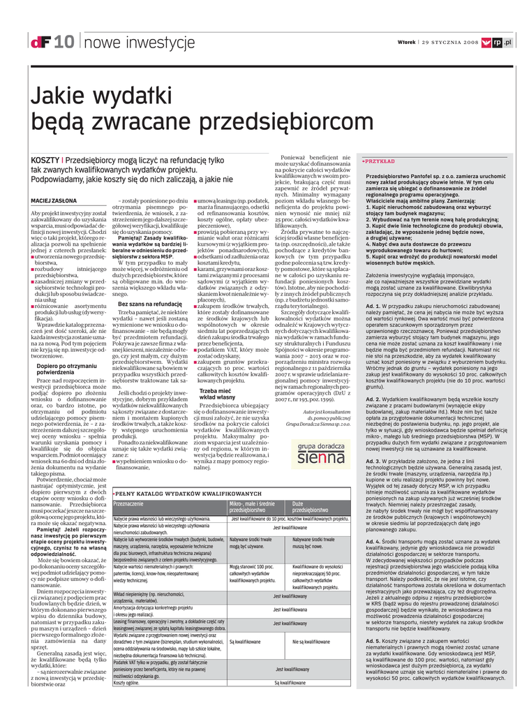 10 nowe inwestycje Wtorek | 29 stycznia 2008 ◊ rp .pl Jakie wydatki będą zwracane przedsiębiorcom Ponieważ beneficjent nie może uzyskać dofinansowania na pokrycie całości wydatków kwalifikowanych w swoim projekcie, brakującą część musi zapewnić ze źródeł prywatnych. Minimalny wymagany poziom wkładu własnego beneficjenta do projektu powinien wynosić nie mniej niż 25 proc. całości wydatków kwalifikowanych. Źródła prywatne to najczęściej środki własne beneficjenta (np. oszczędności), ale także pochodzące z kredytów bankowych (w tym przypadku godne polecenia są tzw. kredyty pomostowe, które są spłacane w całości po uzyskaniu refundacji poniesionych kosztów). Istotne, aby nie pochodziły z innych źródeł publicznych (np. z budżetu jednostki samorządu terytorialnego). Szczegóły dotyczące kwalifikowalności wydatków można odnaleźć w Krajowych wytycznych dotyczących kwalifikowania wydatków w ramach funduszy strukturalnych i Funduszu Spójności w okresie programowania 2007 – 2013 oraz w rozporządzeniu ministra rozwoju regionalnego z 11 października 2007 r. w sprawie udzielania regionalnej pomocy inwestycyjnej w ramach regionalnych programów operacyjnych (DzU z 2007 r., nr 193, poz. 1399). KOSZTY I Przedsiębiorcy mogą liczyć na refundację tylko tak zwanych kwalifikowanych wydatków projektu. Podpowiadamy, jakie koszty się do nich zaliczają, a jakie nie MACIEJ ZASŁONA Aby projekt inwestycyjny został zakwalifikowany do uzyskania wsparcia, musi odpowiadać definicji nowej inwestycji. Chodzi więc o taki projekt, którego realizacja pozwoli na spełnienie jednej z czterech przesłanek: ∑ utworzenia nowego przedsiębiorstwa, ∑ rozbudowy istniejącego przedsiębiorstwa, ∑ zasadniczej zmiany w przedsiębiorstwie technologii produkcji lub sposobu świadczenia usług ∑ różnicowanie asortymentu produkcji lub usług (dywersyfikacja). Wprawdzie katalog przeznaczeń jest dość szeroki, ale nie każda inwestycja zostanie uznana za nową. Pod tym pojęciem nie kryją się np. inwestycje odtworzeniowe. Dopiero po otrzymaniu potwierdzenia Prace nad rozpoczęciem inwestycji przedsiębiorca może podjąć dopiero po złożeniu wniosku o dofinansowanie oraz, co bardzo istotne, po otrzymaniu od podmiotu udzielającego pomocy pisemnego potwierdzenia, że – z zastrzeżeniem dalszej szczegółowej oceny wniosku – spełnia warunki uzyskania pomocy i kwalifikuje się do objęcia wsparciem. Podmiot oceniający wniosek ma 60 dni od dnia złożenia dokumentu na wydanie takiego pisma. Potwierdzenie, chociaż może nastrajać optymistycznie, jest dopiero pierwszym z dwóch etapów oceny wniosku o dofinansowanie. Przedsiębiorca musi poczekać jeszcze na szczegółową ocenę jego projektu, która może się okazać negatywna. Pamiętaj! Jeżeli rozpoczynasz inwestycję po pierwszym etapie oceny projektu inwestycyjnego, czynisz to na własną odpowiedzialność. Może się bowiem okazać, że po dokonaniu oceny szczegółowej podmiot udzielający pomocy nie podpisze umowy o dofinansowanie. Dniem rozpoczęcia inwestycji związanej z podjęciem prac budowlanych będzie dzień, w którym dokonano pierwszego wpisu do dziennika budowy, natomiast w przypadku zakupu maszyn i urządzeń – dzień pierwszego formalnego złożenia zamówienia na dany sprzęt. Generalną zasadą jest więc, że kwalifikowane będą tylko wydatki, które: – są nierozerwalnie związane z nową inwestycją w przedsiębiorstwie oraz – zostały poniesione po dniu otrzymania pisemnego potwierdzenia, że wniosek, z zastrzeżeniem jego dalszej szczegółowej weryfikacji, kwalifikuje się do uzyskania pomocy. Pamiętaj! Zasady kwalifikowania wydatków są bardziej liberalne w odniesieniu do przedsiębiorstw z sektora MSP. W tym przypadku to mały może więcej, w odróżnieniu od dużych przedsiębiorstw, które są obligowane m.in. do wnoszenia większego wkładu własnego. Bez szans na refundację Trzeba pamiętać, że niektóre wydatki – nawet jeśli zostaną wymienione we wniosku o dofinansowanie – nie będą mogły być przedmiotem refundacji. Pokrywa je zawsze firma z własnej kieszeni, niezależnie od tego, czy jest małym, czy dużym przedsiębiorstwem. Wydatki niekwalifikowane są bowiem w przypadku wszystkich przedsiębiorstw traktowane tak samo. Jeśli chodzi o projekty inwestycyjne, dobrym przykładem wydatków niekwalifikowanych są koszty związane z dostarczeniem i montażem kupionych środków trwałych, a także koszty wstępnego uruchomienia produkcji. Ponadto za niekwalifikowane uznaje się także wydatki związane z: ∑ wypełnieniem wniosku o dofinansowanie, ∑ umową leasingu (np. podatek, marża finansującego, odsetki od refinansowania kosztów, koszty ogólne, opłaty ubezpieczeniowe), ∑ prowizją pobieraną przy wymianie walut oraz różnicami kursowymi (z wyjątkiem projektów ponadnarodowych), ∑ odsetkami od zadłużenia oraz kosztami kredytu, ∑ karami, grzywnami oraz kosztami związanymi z procesami sądowymi (z wyjątkiem wydatków związanych z odzyskaniem kwot nienależnie wypłaconych), ∑ zakupem środków trwałych, które zostały dofinansowane ze środków krajowych lub wspólnotowych w okresie siedmiu lat poprzedzających dzień zakupu środka trwałego przez beneficjenta, ∑ podatkiem VAT, który może zostać odzyskany, ∑ zakupem gruntów przekraczających 10 proc. wartości całkowitych kosztów kwalifikowanych projektu. Trzeba mieć wkład własny Przedsiębiorca ubiegający się o dofinansowanie inwestycji musi założyć, że nie uzyska środków na pokrycie całości wydatków kwalifikowanych projektu. Maksymalny poziom wsparcia jest uzależniony od regionu, w którym inwestycja będzie realizowana, i wynika z mapy pomocy regionalnej. Autor jest konsultantem ds. pomocy publicznej Grupa Doradcza Sienna sp. z o.o. > PEŁNY KATALOG WYDATKÓW KWALIFIKOWANYCH Przeznaczenie Nabycie prawa własności lub wieczystego u