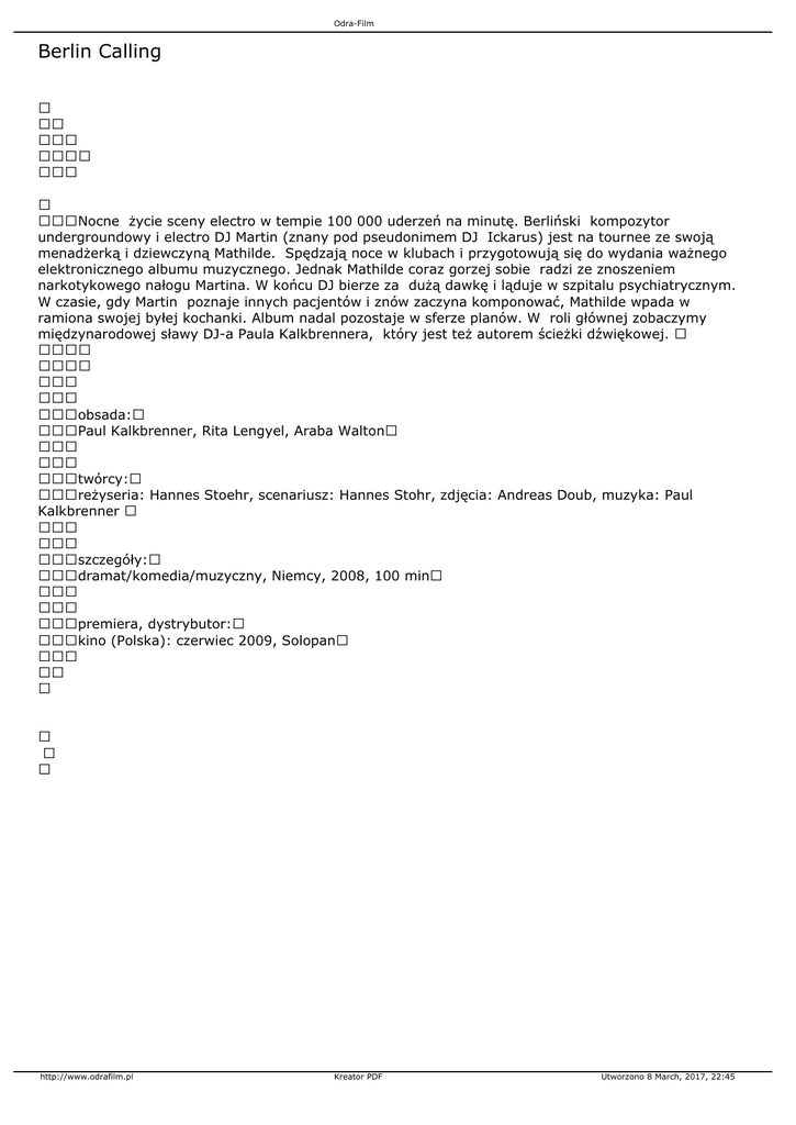 Odra-Film Berlin Calling Nocne życie sceny electro w tempie 100 000 uderzeń na minutę. Berliński kompozytor undergroundowy i electro DJ Martin (znany pod pseudonimem DJ Ickarus) jest na tournee ze swoją menadżerką i dziewczyną Mathilde. Spędzają noce w klubach i przygotowują się do wydania ważnego elektronicznego albumu muzycznego. Jednak Mathilde coraz gorzej sobie radzi ze znoszeniem narkotykowego nałogu Martina. W końcu DJ bierze za dużą dawkę i ląduje w szpitalu psychiatrycznym. W czasie, gdy Martin poznaje innych pacjentów i znów zaczyna komponować, Mathilde wpada w ramiona swojej byłej kochanki. Album nadal pozostaje w sferze planów. W roli głównej zobaczymy międzynarodowej sławy DJ-a Paula Kalkbrennera, który jest też autorem ścieżki dźwiękowej. obsada: Paul Kalkbrenner, Rita Lengyel, Araba Walton twórcy: reżyseria: Hannes Stoehr, scenariusz: Hannes Stohr, zdjęcia: Andreas Doub, muzyka: Paul Kalkbrenner szczegóły: dramat/komedia/muzyczny, Niemcy, 2008, 100 min premiera, dystrybutor: kino (Polska): czerwiec 2009, Solopan http://www.odrafilm.pl Kreator PDF Utworzono 8 March, 2017, 22:45