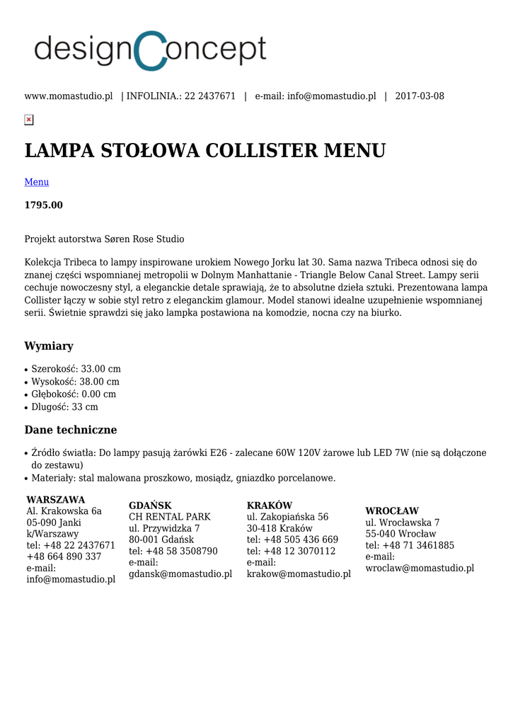 www.momastudio.pl | INFOLINIA.: 22 2437671 | e-mail: [email protected] | 2017-03-08 LAMPA STOŁOWA COLLISTER MENU Menu 1795.00 Projekt autorstwa Søren Rose Studio Kolekcja Tribeca to lampy inspirowane urokiem Nowego Jorku lat 30. Sama nazwa Tribeca odnosi się do znanej części wspomnianej metropolii w Dolnym Manhattanie - Triangle Below Canal Street. Lampy serii cechuje nowoczesny styl, a eleganckie detale sprawiają, że to absolutne dzieła sztuki. Prezentowana lampa Collister łączy w sobie styl retro z eleganckim glamour. Model stanowi idealne uzupełnienie wspomnianej serii. Świetnie sprawdzi się jako lampka postawiona na komodzie, nocna czy na biurko. Wymiary ● ● ● ● Szerokość: 33.00 cm Wysokość: 38.00 cm Głębokość: 0.00 cm Dlugość: 33 cm Dane techniczne ● ● Źródło światła: Do lampy pasują żarówki E26 - zalecane 60W 120V żarowe lub LED 7W (nie są dołączone do zestawu) Materiały: stal malowana proszkowo, mosiądz, gniazdko porcelanowe. WARSZAWA Al. Krakowska 6a 05-090 Janki k/Warszawy tel: +48 22 2437671 +48 664 890 337 e-mail: [email protected] GDAŃSK CH RENTAL PARK ul. Przywidzka 7 80-001 Gdańsk tel: +48 58 3508790 e-mail: [email protected] KRAKÓW ul. Zakopiańska 56 30-418 Kraków tel: +48 505 436 669 tel: +48 12 3070112 e-mail: [email protected] WROCŁAW ul. Wrocławska 7 55-040 Wrocław tel: +48 71 3461885 e-mail: [email protected]
