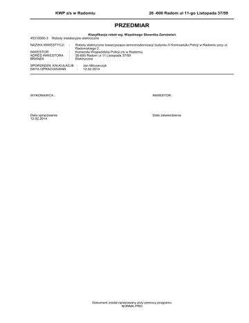 KWP z/s w Radomiu 26 -600 Radom ul 11-go Listopada 37/59 PRZEDMIAR 45310000-3 Klasyfikacja robót wg. Wspólnego Słownika Zamówień Roboty instalacyjne elektryczne NAZWA INWESTYCJI : INWESTOR ADRES INWESTORA BRANŻA : : : Roboty elektryczne towarzyszące termomodernizacji budynku II Komisariatu Policji w Radomiu przy ul. Radomskiego 2. Komenda Wojewódzka Policji z/s w Radomiu 26-600 Radom ul.11 Listopada 37/59 Elektryczna SPORZĄDZIŁ KALKULACJE : DATA OPRACOWANIA : Jan Milczarczyk 12.02.2014 WYKONAWCA : INWESTOR : Data opracowania 12.02.2014 Data zatwierdzenia Dokument został opracowany przy pomocy programu NORMA PRO Przedmiar Lp. Podstawa Opis i wyliczenia j.m. Poszcz Razem Roboty elektryczne towarzyszące termomodernizacji budynku II Komisariatu Policji w Radomiu przy ul. Radomskiego 2 1 KNR AL-01 Montaż elementów systemu telewizji użytkowej - kamera TVU zewnętrzna w szt. 0501-02 obudowie wandaloodpornej z oświetleniem IR na poczerwień ( podświetlenie do 30 m.) 4 szt. 4.000 RAZEM 4.000 2 KNR AL-01 Montaż elementów systemu telewizji użytkowej -rejestrator cyfrowy 8-kanałowy szt. 0502-03 z dyskiem 2TB. 1 szt. 1.000 RAZEM 1.000 3 KNR AL-01 Montaż elementów systemu telewizji użytkowej - monitor LCD 32" do współ- szt. 0501-03 pracy z monitorem 1 szt. 1.000 RAZEM 1.000 4 Wykonanie okablowania do kamer. kpl analiza indywidualna 1 kpl 1.000 RAZEM 1.000 5 KNR AL-01 Montaż elementów systemu telewizji użytkowej - kamera wewnętrzna w obu- szt. 0501-01 dowie wandaloodpornej 1 szt. 1.000 RAZEM 1.000 6 KNNR 5 Listwy elektroinstalacyjne z PCW (naścienne, przypodłogowe i ścienne) przy- m 0110-04 kręcane do cegły - LN 16x16 16 m 16.000 RAZEM 16.000 7 KNNR 5 Przewody kabelkowe o łącznym przekroju żył do 7.5 mm2 układane w listwach m 0212-01 i kanałach elektroinstalacyjnych - przewód YDY 3 x 1.5 mm2 16 m 16.000 RAZEM 16.000 8 KNNR 5 Montaż opraw oświetlenia zewnętrznego oświetlającego logo Policji ( 2 projek- kpl 1004-02 tory iluminacyjne z lampami metalohalogenkowymi 250V/70W. 1 kpl 1.000 RAZEM 1.000 -2- Norma PRO Wersja 4.36 Nr seryjny: 28029