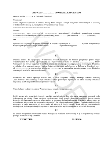 UMOWA Nr ………../…… DO WEKSLA KAUCYJNEGO zawarta w dniu ………..r. w Dąbrowie Górniczej Wierzyciel: Gmina Dąbrowa Górnicza w imieniu której działa Miejski Zarząd Budynków Mieszkalnych z siedzibą w Dąbrowie Górniczej, ul. Tysiąclecia 20 reprezentowany przez: ………………………………………………… Dłużnik: …………….… zam. ………… ul. …………….… prowadzący(a) działalność gospodarczą wpisaną do ewidencji działalności gospodarczej prowadzonej przez ………… pod numerem ………… pod nazwą: ………………………………………………… lub ………………………………………………… wpisany do Krajowego Rejestru Sądowego w Sądzie Rejonowym w ......... , …. Wydział Gospodarczy Krajowego Rejestru Sądowego pod numerem ……………. reprezentowany przez: ………………………………………………. §1 Dłużnik składa do dyspozycji Wierzyciela weksel kaucyjny in blanco podpisany przez niego własnoręcznie lub osoby upoważnione do wystawiania weksla w imieniu ……………….., który Wierzyciel ma prawo wypełnić w każdym czasie, na kwotę odpowiadającą sumie zobowiązań Dłużnika wynikających z zawarcia umowy najmu lokalu użytkowego położonego w Dąbrowie Górniczej przy ul. ......................... o powierzchni użytkowej ................m2 w przypadku niedotrzymania przez Dłużnika umownych terminów zapłaty należności. §2 Wierzyciel ma prawo opatrzyć weksel datą a także uzupełnić według własnego uznania klauzulą „bez protestu” zawiadamiając o tym Dłużnika listem poleconym wysłanym na adres siedziby Dłużnika najpóźniej na 14 dni przed terminem płatności weksla. §3 Weksel płatny będzie w siedzibie Wierzyciela pod aktualnym jego adresem. §4 Jeżeli umowa nie przewiduje inaczej, wszelkie zawiadomienia lub informacje pomiędzy stronami będą dokonywane na piśmie i będą uważane za doręczone, jeżeli zostały doręczone osobiście, faxem, pocztą kurierską lub listem poleconym na adres podany w komparycji niniejszej umowy. O zmianie adresu strony są zobowiązane informować się wzajemnie w terminie 7 dni od daty dokonania zmiany. Zawiadomienie staje się skuteczne w dniu następnym po doręczeniu tej informacji drugiej stronie. Brak takiego zawiadomienia skutkuje tym, że korespondencja doręczona na poprzedni adres będzie uznawana za właściwie doręczoną. §5 Po spłacie wszystkich zobowiązań wobec Wierzyciela o którym mowa wyżej w § 1 zdeponowany weksel podlega zwrotowi do rąk Dłużnika. WIERZYCIEL: DŁUŻNIK: