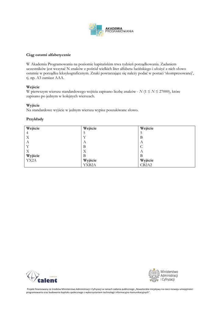 Ciąg ostatni alfabetycznie W Akademia Programowania na poziomie kapitańskim trwa tydzień porządkowania. Zadaniem uczestników jest wczytać N znaków z pośród wielkich liter alfabetu łacińskiego i ułożyć z nich słowo ostatnie w porządku leksykograficznym. Znaki powtarzające się należy podać w postaci ‘skompresowanej’, tj. np. A3 zamiast AAA. Wejście W pierwszym wierszu standardowego wejścia zapisano liczbę znaków - N (1 ≤ N ≤ 27000), które zapisano po jednym w kolejnych wierszach. Wyjście Na standardowe wyjście w jednym wierszu wypisz poszukiwane słowo. Przykłady Wejście 4 X A Y X Wyjście YX2A Wejście 5 Y A B X B Wyjście YXB2A Wejście 5 B A C A B Wyjście CB2A2 Projekt finansowany ze środków Ministerstwa Administracji i Cyfryzacji w ramach zadania publicznego „Nowatorskie inicjatywy na rzecz rozwoju umiejętności programowania oraz budowania kapitału społecznego z wykorzystaniem technologii informacyjno-komunikacyjnych”.