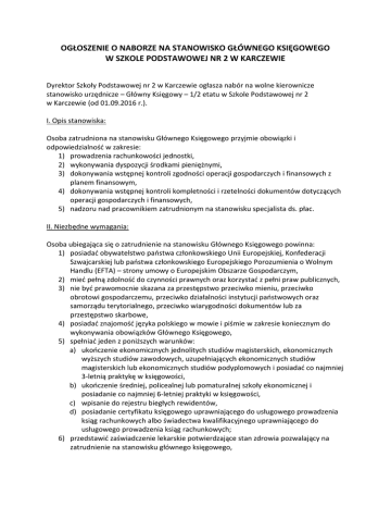 OGŁOSZENIE O NABORZE NA STANOWISKO GŁÓWNEGO KSIĘGOWEGO W SZKOLE PODSTAWOWEJ NR 2 W KARCZEWIE Dyrektor Szkoły Podstawowej nr 2 w Karczewie ogłasza nabór na wolne kierownicze stanowisko urzędnicze – Główny Księgowy – 1/2 etatu w Szkole Podstawowej nr 2 w Karczewie (od 01.09.2016 r.). I. Opis stanowiska: Osoba zatrudniona na stanowisku Głównego Księgowego przyjmie obowiązki i odpowiedzialność w zakresie: 1) prowadzenia rachunkowości jednostki, 2) wykonywania dyspozycji środkami pieniężnymi, 3) dokonywania wstępnej kontroli zgodności operacji gospodarczych i finansowych z planem finansowym, 4) dokonywania wstępnej kontroli kompletności i rzetelności dokumentów dotyczących operacji gospodarczych i finansowych, 5) nadzoru nad pracownikiem zatrudnionym na stanowisku specjalista ds. płac. II. Niezbędne wymagania: Osoba ubiegająca się o zatrudnienie na stanowisku Głównego Księgowego powinna: 1) posiadać obywatelstwo państwa członkowskiego Unii Europejskiej, Konfederacji Szwajcarskiej lub państwa członkowskiego Europejskiego Porozumienia o Wolnym Handlu (EFTA) – strony umowy o Europejskim Obszarze Gospodarczym, 2) mieć pełną zdolność do czynności prawnych oraz korzystać z pełni praw publicznych, 3) nie być prawomocnie skazana za przestępstwo przeciwko mieniu, przeciwko obrotowi gospodarczemu, przeciwko działalności instytucji państwowych oraz samorządu terytorialnego, przeciwko wiarygodności dokumentów lub za przestępstwo skarbowe, 4) posiadać znajomość języka polskiego w mowie i piśmie w zakresie koniecznym do wykonywania obowiązków Głównego Księgowego, 5) spełniać jeden z poniższych warunków: a) ukończenie ekonomicznych jednolitych studiów magisterskich, ekonomicznych wyższych studiów zawodowych, uzupełniających ekonomicznych studiów magisterskich lub ekonomicznych studiów podyplomowych i posiadać co najmniej 3-letnią praktykę w księgowości, b) ukończenie średniej, policealnej lub pomaturalnej szkoły ekonomicznej i posiadanie co najmniej 6-letniej praktyki w księgowości, c) wpisanie do rejestru biegłych rewidentów, d) posiadanie certyfikatu księgowego uprawniającego do usługowego prowadzenia ksiąg rachunkowych albo świadectwa kwalifikacyjnego uprawniającego do usługowego prowadzenia ksiąg rachunkowych; 6) przedstawić zaświadczenie lekarskie potwierdzające stan zdrowia pozwalający na zatrudnienie na stanowisku głównego księgowego, 7) posiadać umiejętność obsługi komputera i znajomość branżowych programów komputerowych w zakresie księgowości, sprawozdawczości i bankowości. III. Wymagania dodatkowe: 1) 2) 3) 4) 5) umiejętność pracy w zespole, odpowiedzialność, systematyczność, pracowitość, kreatywność, wysokie zdolności analityczne, nieposzlakowana opinia, pożądane doświadczenie w pracy w oświatowych jednostkach budżetowych. IV. Obowiązki: W szczególności do zadań Głównego Księgowego będzie należało wykonywanie następujących obowiązków: 1) przygotowanie dokumentów źródłowych do księgowania, 2) wprowadzanie dokumentów księgowych do programu finansowo-księgowego zgodnie z dekretacją, 3) terminowe przekazywanie wszelkich analiz i rozliczeń, 4) przechowywanie i zabezpieczanie dokumentów przed zniszczeniem, uszkodzeniem lub zagubieniem, 5) prowadzenie na bieżąco dokumentacji finansowo-księgowej szkoły zgodnie z obowiązującymi przepisami, 6) przygotowanie projektu budżetu, 7) opracowywanie projektów przepisów wewnętrznych, 8) sporządzanie bilansu, prowadzenie sprawozdawczości budżetowej, wykonywanie analiz, zestawień oraz prognoz kosztów i wydatków, 9) sporządzanie na bieżąco sprawozdań, 10) dbanie o terminowe regulowanie rachunków, 11) terminowe rozliczanie spraw finansowych szkoły, 12) udział w rozliczaniu inwentaryzacji, 13) zapewnienie pod względem finansowym prawidłowości zawieranych umów przez szkołę, 14) księgowanie i rozliczanie na bieżąco zakupów materiałów, pomocy naukowych i sprzętu. V. Warunki pracy: 1) 2) 3) 4) zmienne tempo pracy, konieczność szybkiego podejmowania decyzji, praca siedząca przy komputerze, praca wymagająca częstych kontaktów z Wydziałem Finansowo-Budżetowym Urzędu Miejskiego w Karczewie. Wskaźnik zatrudnienia osób niepełnosprawnych w Szkole Podstawowej nr 2 w Karczewie wynosi 0%. VI. Wymagane dokumenty: 1) 2) 3) 4) 5) list motywacyjny, życiorys (CV), kwestionariusz osobowy kandydata ubiegającego się o zatrudnienie, kserokopie świadectw pracy z dotychczasowych miejsc pracy (oryginały do wglądu), kserokopie dokumentów potwierdzających wykształcenie i dodatkowe kwalifikacje zawodowe (oryginały do wglądu), 6) oświadczenie o niekaralności, 7) oświadczenie o pełnej zdolności do czynności prawnych, 8) oświadczenie o korzystaniu z pełni praw publicznych, 9) oświadczenie, że kandydat nie był prawomocnie skazany za przestępstwo przeciwko mieniu, przeciwko obrotowi gospodarczemu, przeciwko działalności instytucji państwowych oraz samorządu terytorialnego, przeciwko wiarygodności dokumentów lub za przestępstwo skarbowe, 10) oświadczenie o wyrażeniu zgody na przetwarzanie danych osobowych na potrzeby rekrutacji, 11) zaświadczenie lekarskie o braku przeciwwskazań do zajmowania stanowiska, 12) inne dokumenty potwierdzające przygotowanie na proponowane stanowisko. Oferty należy składać w sekretariacie Szkoły Podstawowej nr 2 w Karczewie lub przesłać w terminie do dnia 27 czerwca 2016 r. do godz.1000, w zaklejonych kopertach z dopiskiem „Nabór na wolne kierownicze stanowisko urzędnicze – Główny Księgowy w Szkole Podstawowej nr 2 w Karczewie”, na adres: 05-480 Karczew, ul. Otwocka 13. Telefon kontaktowy do szkoły: 22 780-60-97. Uwaga: 1) Dokumenty aplikacyjne składane przez osoby ubiegające się o zatrudnienie mogą być przyjmowane tylko po ukazaniu się ogłoszenia o organizowanym naborze i tylko w formie pisemnej. 2) Dokumen