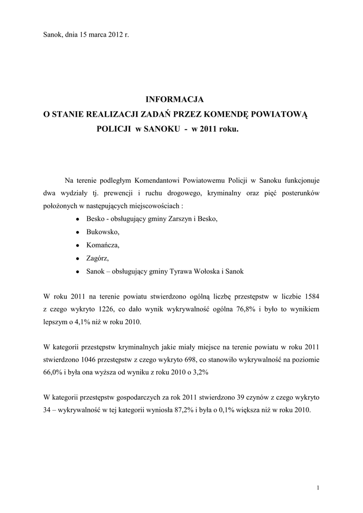 Sanok, dnia 15 marca 2012 r. INFORMACJA O STANIE REALIZACJI ZADAŃ PRZEZ KOMENDĘ POWIATOWĄ POLICJI w SANOKU - w 2011 roku. Na terenie podległym Komendantowi Powiatowemu Policji w Sanoku funkcjonuje dwa wydziały tj. prewencji i ruchu drogowego, kryminalny oraz pięć posterunków położonych w następujących miejscowościach : Besko - obsługujący gminy Zarszyn i Besko, Bukowsko, Komańcza, Zagórz, Sanok – obsługujący gminy Tyrawa Wołoska i Sanok W roku 2011 na terenie powiatu stwierdzono ogólną liczbę przestępstw w liczbie 1584 z czego wykryto 1226, co dało wynik wykrywalność ogólna 76,8% i było to wynikiem lepszym o 4,1% niż w roku 2010. W kategorii przestępstw kryminalnych jakie miały miejsce na terenie powiatu w roku 2011 stwierdzono 1046 przestępstw z czego wykryto 698, co stanowiło wykrywalność na poziomie 66,0% i była ona wyższa od wyniku z roku 2010 o 3,2% W kategorii przestępstw gospodarczych za rok 2011 stwierdzono 39 czynów z czego wykryto 34 – wykrywalność w tej kategorii wyniosła 87,2% i była o 0,1% większa niż w roku 2010. 1 Ukazana poniżej tabela wskazuje wyniki wykrywalności w wymienionych, wybranych kategoriach przestępstw za rok 2010 i 2011 porównanie wykrywalności 2010 87,2 2011 91,7 91,3 90,0 87,1 85,9 83,8 76,8 72,7 77,4 76,5 68,2 66,0 62,8 53,7 39,8 41,5 50,9 47,0 40,9 43,6 34,0 ogólne kryminalna gospodarcza rozboje pobicia uszkodzenia ciała w łamania kradzieże uszkodzenia mienia p. życiu i zdrow iu p. mieniu Wykres nr 1 – Porównanie wyników wykrywalności na terenie powiatu w roku 2010 i 2011 W kategorii przestępstw przeciwko życiu i zdrowi zanotowano 63 przestępstwa z czego wykryto 55 – co stanowiło 85,9% i było wynikiem większym niż w analogicznym okresie roku 2010 o 8,5%. W roku 2011 na terenie powiatu nie zanotowano żadnego zabójstwa, stwierdzono natomiast 40 przestępstw z art.156kk i 157 kk (ciężkie i średnie uszkodzenie ciała) z czego wykryto 36 czynów (90,0%) - w roku 2010 stwierdzono 37 wykryto 31 (83,8%), w kategorii przestępstw bójka i pobicie stwierdzono 17 czynów z których wykryto 13 (76,5%) - 2010 analogicznie 22 stwierdzone 15 wykrytych (68,2%). W kategorii przestępstw przeciwko mieniu zanotowano 685 przestępstw z czego wykryto 354 – co stanowiło 50,9%. Kradzieży rzeczy (art.275kk i 278kk) odnotowano 249 czynów z czego wykryto 119 (46,7%) - nastąpił spadek ilości stwierdzonych 261 w roku 2010 do 249 w 2011 przy jednoczesnym wzroście wykrywalności tego rodzaju czynów z 108 w 2010 do 119 w roku ubiegłym (procentowo z 40,9% w 2010 do 47,0% w 2011) - nie stwierdzono kradzieży pojazdów mechanicznych. Odnotowano 129 kradzieży z włamaniem (art.279kk) z czego wykryto 53 - nastąpił spadek ilości tego rodzaju spraw z 168 do 129 przy niewielkim spadku wykrywalności 41,5% do 39,8%. 2 Zanotowano 36 rozbojów (art.280kk) w tym 2 z użyciem niebezpiecznego narzędzia z czego wykryto 33 (91,7%) w tym 1 z użyciem niebezpiecznego narzędzia – nastąpił wzrost stwierdzonych ale i wzrost wykrytych w stosunku do roku 2010. Odnotowano 149 przypadków uszkodzenie mienia z czego wykryto 51 (34,0%) - nastąpił spadek wykrywalności w tej kategorii w stosunku do roku 2010. W roku 2011 zanotowano 62 przestępstwa przeciwko funkcjonariuszom publicznym z czego wykryto 61. Poniższa tabela ukazuje ilość czynów stwierdzonych na terenie powiatu sanockiego w roku 2011 w rozbiciu na wybrane kategorie. Rozboje i wymuszenia rozbójnicze Bójki i pobicia Uszkodzenia ciała Kradzieżę z włamaniem Kradzieżę cudzej rzeczy Uszkodzenia mienia Przestępstwa narkotykowe Wypadki w ruchu lądowym Nietrzeźwi kierujący Pozostałe Gospodarcze 39 36 17 40 129 423 249 149 384 90 28 Wykres nr 2 – ilość czynów stwierdzonych na terenie powiatu sanockiego w roku 2011 Przestępstwa narkotykowe na terenie powiatu w roku 2011 W roku 2011 stwierdzono na terenie powiatu 90 przestępstw narkotykowych (posiadanie i udzielenia środków odurzających), wykryto 88 czynów (97,8%) z czego 39 popełniono przez osoby nieletnie. 3 Przestepstwa narkotykowe 2010 90 2011 90 88 80 70 60 50 57 40 54 30 19 20 10 14 2011 0 2010 wszczęte stwierdzone wykryte Wykres nr 3 – Przestępczość narkotykowa na ternie powiatu sanockiego w roku 2011 Przestępczość nieletnich na terenie powiatu w roku 2011 Przestępczość nieletnich 2010 157 89 2011 154 87 69 39 23 12 ogólne kryminalne narkotykowe sprawcy Wykres nr 4 – Przestępczość nieletnich na terenie powiatu sanockiego w latach 2010 i 2011 4 DANE DOTYCZĄCE STRAT SPOWODOWANYCH PRZESTEPSTWAMI, WARTOŚĆ ODZYSKANEGO MIENIA ORAZ WARTOŚĆ MIENIA ZABEZPIECZONEGO U PODEJRZANYCH W ROKU 2011 W roku 2011 straty w mieniu na terenie powiatu wyniosły 1369019zł (w roku 2010 1777537zł), wartość mienia odzyskanego wyniosła 157275zł (w roku 2010 – 109648zł) zaś na mieniu podejrzanych dokonano zabezpieczenia na kwotę 93802zł (rok 2010 – 78458zł). Graficznie osiągnięte wyniki przedstawiały się następująco: Wysokość strat przy przestępstwach ogółem 2010 2011 1 369 019,00 zł 1 777 537,00 zł Wykres 5 – Dane dotyczące wysokości strat spowodowanych przestępstwami na terenie powiatu sanockiego w latach 2010 i 2011 Wartości odzyskanego mienia przy przestępstwach ogółem 2010 2011 109 648,00 zł 157 275,00 zł Wykres nr 6 – Dane dotyczące wartości odzyskanego mienia od sprawców w latach 2010 i 2011 5 Wartość zabezpieczonego mienia przy przestępstwach ogółem 2010 2011 78 548,00 zł 93 802,00 zł Wykres nr 7 – Dane dotyczące wartości mienia zabezpieczonego u sprawców w latach 2010 i 2011 Imprezy masowe W roku 2011 funkcjonariusze Komendy Powiatowej Policji w Sanoku brali udział w zabezpieczeniu porządku publicznego łącznie w 59 imprezach masowych, z czego zabezpieczono 39 meczów hokeja na lodzie i 17 meczów piłki nożnej. Wszystkie mecze miały charakter masowych imprez sportowych. Ponadto zabezpieczono 3 inne imprezy masowe 