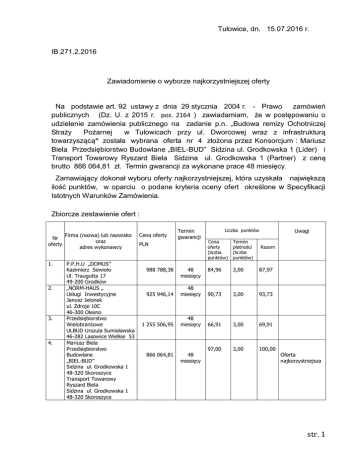 Tułowice, dn. 15.07.2016 r. IB.271.2.2016 Zawiadomienie o wyborze najkorzystniejszej oferty Na podstawie art. 92 ustawy z dnia 29 stycznia 2004 r. - Prawo zamówień publicznych (Dz. U. z 2015 r. poz. 2164 ) zawiadamiam, że w postępowaniu o udzielenie zamówienia publicznego na zadanie p.n. „Budowa remizy Ochotniczej Straży Pożarnej w Tułowicach przy ul. Dworcowej wraz z infrastrukturą towarzyszącą” została wybrana oferta nr 4 złożona przez Konsorcjum : Mariusz Biela Przedsiębiorstwo Budowlane „BIEL-BUD” Sidzina ul. Grodkowska 1 (Lider) i Transport Towarowy Ryszard Biela Sidzina ul. Grodkowska 1 (Partner) z ceną brutto 866 064,81 zł. Termin gwarancji za wykonane prace 48 miesięcy. Zamawiający dokonał wyboru oferty najkorzystniejszej, która uzyskała największą ilość punktów, w oparciu o podane kryteria oceny ofert określone w Specyfikacji Istotnych Warunków Zamówienia. Zbiorcze zestawienie ofert : Firma (nazwa) lub nazwisko Nr oraz oferty adres wykonawcy 1. 2. 3. 4. P.P.H.U „DOMUS” Kazimierz Sewioło Ul. Traugutta 17 49-200 Grodków „NORM-HAUS „ Usługi Inwestycyjne Janusz Jelonek ul. Zdroje 10C 46-300 Olesno Przedsiębiorstwo Wielobranżowe ULBUD Urszula Sumisławska 46-282 Lasowice Wielkie 53 Mariusz Biela Przedsiębiorstwo Budowlane „BIEL-BUD” Sidzina ul. Grodkowska 1 48-320 Skoroszyce Transport Towarowy Ryszard Biela Sidzina ul. Grodkowska 1 48-320 Skoroszyce Cena oferty Termin gwarancji PLN 988 788,38 48 miesięcy Liczba punktów Uwagi Cena oferty (liczba punktów) Termin płatności (liczba punktów) 84,96 3,00 87,97 Razem 925 946,14 48 miesięcy 90,73 3,00 93,73 1 255 506,95 48 miesięcy 66,91 3,00 69,91 97,00 3,00 100,00 866 064,81 48 miesięcy Oferta najkorzystniejsza str. 1 5. 6. 7. 8. Usługi Inżyniersko-Budowlane IMPOST Tomasz Duszyński Ul. Skautów Opolskich 17/403 45-286 Opole „TOM-BUD” Usługi Ogólnobudowlane Tomasz Karaś ul. Aleja Wojska Polskiego 38 49-340 Lewin Brzeski „PC” Przedsiębiorstwo Handlowo-Usługowe Przemysław Ciepichał Ul. Kosynierów 42 C 49-340 Lewin Brzeski DOMBOD Anna Zadrożna Ryszard Zadrożny Sp. J. Ul. Chorzowska 64 44-100 Gliwice Zamawiający odrzucił 1 156 264,30 48 miesięcy 48 miesięcy 59,31 3,00 62,31 1 416 450,25 919 894,37 48 miesięcy 91,32 3,00 94,32 48 miesięcy 90,48 3,00 93,48 928 476,23 - - - Oferta odrzucona ofertę nr 5 t.j. Usługi Inżyniersko-Budowlane IMPOST Tomasz Duszyński Opole ul. Skautów Opolskich 17/403 z postępowania o udzielenie zamówienia na podstawie art. 89 ust. 1 pkt 1) ustawy Prawo zamówień publicznych (Dz. U. z 2015 r. poz. 2164), zwaną dalej Pzp, z powodu braku podpisu oferty. Art. 89 ust.1. pkt 1 ustawy Prawo zamówień publicznych określa obowiązek Zamawiającego odrzucenia oferty , która jest niezgodna z ustawą . Zgodnie z art. 82 ust.2 ustawy Pzp ofertę składa się w formie pisemnej, pod rygorem nieważności. Minimalne wymagania dla zachowania formy pisemnej zostały określone w art. 78 § 1 Kodeksu cywilnego, zgodnie z którym oferta powinna zostać opatrzona własnoręcznym podpisem osoby składającej oświadczenie woli. Brak podpisu w przypadku oferty, oznacza brak zachowania formy pisemnej. Jednocześnie zawiadamiam, że umowa z wykonawcą może być zawarta po dniu 21.07.2016 r. Niniejsze zawiadomienie zamieszcza się na stronie internetowej Urzędu Gminy Tułowice oraz tablicy ogłoszeń w dniu 15.07.2016 r. Zgodnie z zapisem pkt. 14 Specyfikacji Istotnych Warunków Zamówienia oraz art. 27 ust. 2 ustawy z dnia 29 stycznia 2004 r. - Prawo zamówień publicznych (Dz. U. . z 2015 r. poz. 2164 ) proszę o niezwłoczne odesłanie faksem lub pocztą elektroniczną potwierdzenia o otrzymaniu niniejszej informacji o wynikach przetargu na przekazanym druku, nr faksu (77) 4600474. WÓJT GMINY TUŁOWICE Andrzej Wesołowski str. 2