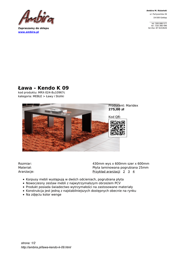 Ambira M. Różański ul. Partyzantów 26 19-500 Gołdap ___________________ tel. 500 088 577 tel.: 516 366 496 tel./fax: 87 6153626 Zapraszamy do sklepu www.ambira.pl Ława - Kendo K 09 kod produktu: MRX-024-8u10967c kategoria: MEBLE > Ławy i Stoliki Producent: Maridex 275,00 zł Kod QR: Rozmiar: Materiał: Aranżacje: 430mm wys x 600mm szer x 600mm Płyta laminowana pogrubiana 25mm Przykład aranżacji 2 3 4 Korpusy mebli występują w dwóch odcieniach, pogrubiana płyta Nowoczesny zestaw mebli z najwytrzymalszym obrzeżem PCV Produkt posiada świadectwo wytrzymałości na zastosowane materiały Konstrukcja jest jedną z najstabilniejszych dostępnych obecnie na rynku Na zdjęciu kolor wenge strona: 1/2 http://ambira.pl/lawa-kendo-k-09.html strona: 2/2 http://ambira.pl/lawa-kendo-k-09.html