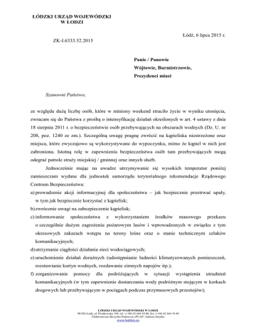 ŁÓDZKI URZĄD WOJEWÓDZKI W ŁODZI Łódź, 6 lipca 2015 r. ZK-I.6333.52.2015 Panie / Panowie Wójtowie, Burmistrzowie, Prezydenci miast Szanowni Państwo, ze względu dużą liczbę osób, które w miniony weekend straciło życie w wyniku utonięcia, zwracam się do Państwa z prośbą o intensyfikację działań określonych w art. 4 ustawy z dnia 18 sierpnia 2011 r. o bezpieczeństwie osób przebywających na obszarach wodnych (Dz. U. nr 208, poz. 1240 ze zm.). Szczególną uwagę pragnę zwrócić na kąpieliska niestrzeżone oraz miejsca, które zwyczajowo są wykorzystywane do wypoczynku, mimo że kąpiel w nich jest zabroniona. Istotną rolę w zapewnieniu bezpieczeństwa osób tam przebywających mogą odegrać patrole straży miejskiej / gminnej oraz innych służb. Jednocześnie mając na uwadze utrzymywanie się wysokich temperatur poniżej zamieszczam wydane dla jednostek samorządu terytorialnego rekomendacje Rządowego Centrum Bezpieczeństwa: a) prowadzenie akcji informacyjnej dla społeczeństwa – jak bezpiecznie przetrwać upały, w tym jak bezpiecznie korzystać z kąpielisk; b) zwrócenie uwagi na zabezpieczenie kąpielisk; c) informowanie społeczeństwa z wykorzystaniem środków masowego przekazu o szczególnie dużym zagrożeniu pożarowym lasów i wprowadzonych w związku z tym okresowych zakazach wstępu na tereny leśne oraz o stanie technicznym szlaków komunikacyjnych; d) utrzymanie ciągłości działania sieci wodociągowych; e) uruchomienie działań doraźnych (udostępnianie ludności klimatyzowanych pomieszczeń, rozstawianie kurtyn wodnych, rozdawanie zimnych napojów itp.); f) zorganizowanie pomocy dla podróżujących w sytuacji wystąpienia utrudnień komunikacyjnych (w tym zapewnienie dostarczania wody podróżnym stojącym w korkach drogowych lub przebywającym w pociągach podczas przymusowych przestojów); ŁÓDZKI URZĄD WOJEWÓDZKI W ŁODZI 90-926 Łódź, ul. Piotrkowska 104, tel.: (+48) 42 664 10 00, fax: (+48) 42 664 10 40 Elektroniczna Skrzynka Podawcza ePUAP: /lodzuw/skrytka www.lodzkie.eu g) zintensyfikowanie kontroli warunków życia osób objętych opieką społeczną przez ośrodki pomocy społecznej (niepełnosprawni, chorzy, samotni, osoby starsze); h) monitorowanie miejsc gromadzenia się osób (np. plaże, centra miast, miejsca imprez masowych). W załączeniu przekazuję również - w wersji elektronicznej - poradnik opracowany w Rządowym Centrum Bezpieczeństwa dotyczący zasad postępowania w przypadku upałów, z prośbą o jego zamieszczenie na witrynie internetowej Państwa jednostek. Z poważaniem Z up. WOJEWODY ŁÓDZKIEGO Arkadiusz Makoski Zastępca Dyrektora Wydziału Bezpieczeństwa i Zarządzania Kryzysowego