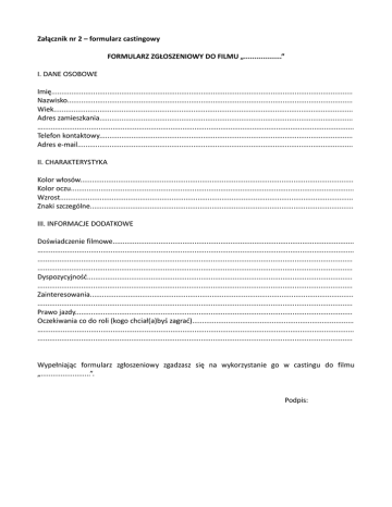 Załącznik nr 2 – formularz castingowy FORMULARZ ZGŁOSZENIOWY DO FILMU „..................” I. DANE OSOBOWE Imię....................................................................................................................................................... Nazwisko............................................................................................................................................... Wiek...................................................................................................................................................... Adres zamieszkania............................................................................................................................... …............................................................................................................................................................ Telefon kontaktowy............................................................................................................................... Adres e-mail.......................................................................................................................................... II. CHARAKTERYSTYKA Kolor włosów......................................................................................................................................... Kolor oczu.............................................................................................................................................. Wzrost................................................................................................................................................... Znaki szczególne.................................................................................................................................... III. INFORMACJE DODATKOWE Doświadczenie filmowe......................................................................................................................... …............................................................................................................................................................ .............................................................................................................................................................. .............................................................................................................................................................. Dyspozycyjność..................................................................................................................................... .............................................................................................................................................................. Zainteresowania.................................................................................................................................... .............................................................................................................................................................. Prawo jazdy........................................................................................................................................... Oczekiwania co do roli (kogo chciał(a)byś zagrać)................................................................................. …............................................................................................................................................................ .............................................................................................................................................................. Wypełniając formularz zgłoszeniowy zgadzasz się na wykorzystanie go w castingu do filmu „.........................”. Podpis: