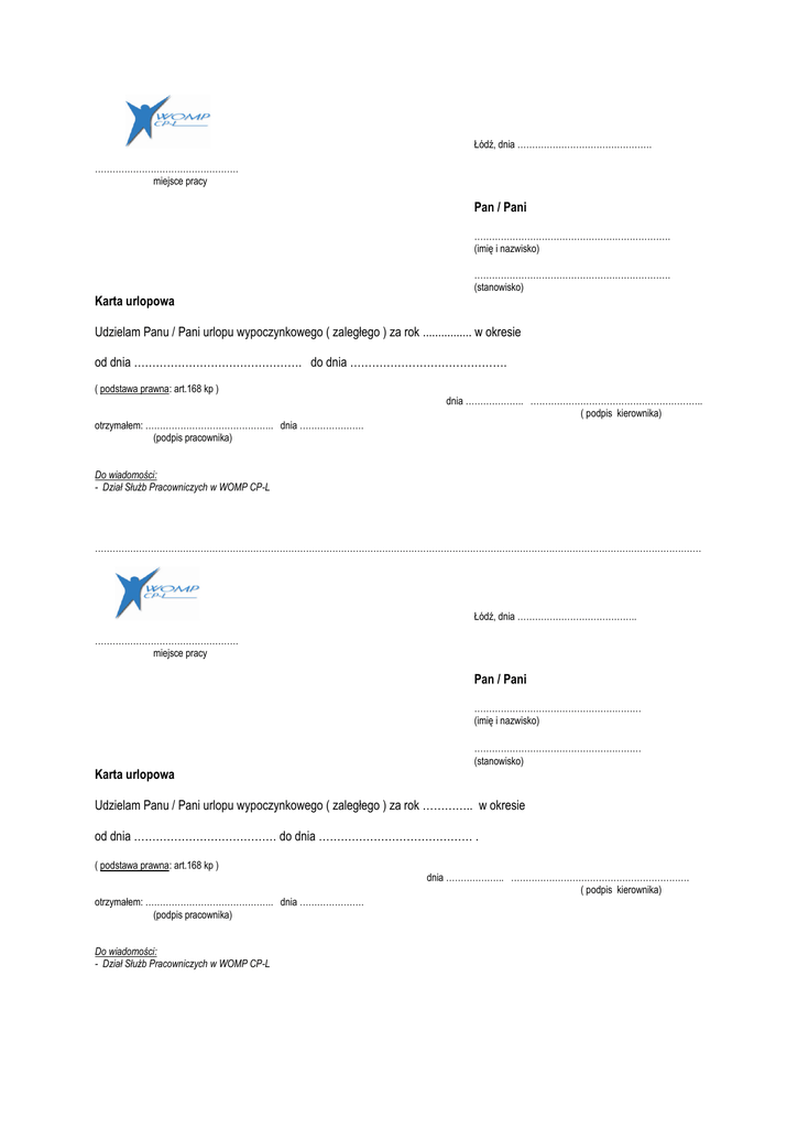 Łódź, dnia ………………………………………. …………………………………………. miejsce pracy Pan / Pani …………………………………………………………. (imię i nazwisko) …………………………………………………………. (stanowisko) Karta urlopowa Udzielam Panu / Pani urlopu wypoczynkowego ( zaległego ) za rok ................ w okresie od dnia ………………………………………. do dnia ……………………………………. ( podstawa prawna: art.168 kp ) otrzymałem: …………………………………….. dnia …………………. (podpis pracownika) dnia ……………….. ………………………………………………….. ( podpis kierownika) Do wiadomości: - Dział Służb Pracowniczych w WOMP CP-L ……………………………………………………………………………………………………………………………………………………………………………………… Łódź, dnia ………………………………….. …………………………………………. miejsce pracy Pan / Pani ………………………………………………… (imię i nazwisko) Karta urlopowa ………………………………………………… (stanowisko) Udzielam Panu / Pani urlopu wypoczynkowego ( zaległego ) za rok ………….. w okresie od dnia ………………………………… do dnia …………………………………… . ( podstawa prawna: art.168 kp ) otrzymałem: …………………………………….. dnia …………………. (podpis pracownika) Do wiadomości: - Dział Służb Pracowniczych w WOMP CP-L dnia ……………….. ……………………………………………………. ( podpis kierownika)