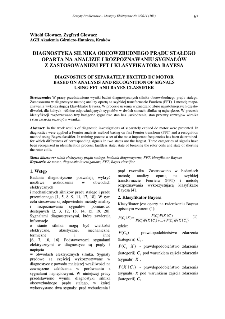 Słowa kluczowe: silnik elektryczny prądu stałego, badania diagnostyczne, FFT, klasyfikator Bayesa