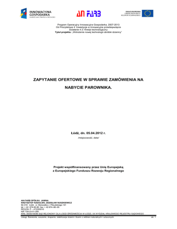 Program Operacyjny Innowacyjna Gospodarka, 2007-2013 Oś Priorytetowa 4: Inwestycje w innowacyjne przedsięwzięcia Działanie 4.3: Kredyt technologiczny Tytuł projektu: „Wdrożenie nowej technologii obróbki dzianiny” ZAPYTANIE OFERTOWE W SPRAWIE ZAMÓWIENIA NA NABYCIE PAROWNIKA. Łódź, dn. 05.04.2012 r. /miejscowość, data/ Projekt współfinansowany przez Unię Europejską z Europejskiego Funduszu Rozwoju Regionalnego AN-FARB SPÓŁKA JAWNA KRZYSZTOF NADOLSKI, ZDZISŁAW NUSZKIEWICZ 92-318 Łódź, ul. Marszałka J. Piłsudskiego 141 tel. + 42 674-63-90 fax: + 42 674–80–05 REGON: P – 472265810 NIP 728-23-01-206 KRS: 0000018098 SĄD REJONOWY DLA ŁODZI-ŚRÓDMIEŚCIA W ŁODZI, XX WYDZIAŁ KRAJOWEGO REJESTRU SĄDOWEGO Usługi: Barwienie, suszenie, drapanie, stabilizacja dzianin i tkanin z włókien naturalnych i sztucznych. str. 1 Program Operacyjny Innowacyjna Gospodarka, 2007-2013 Oś Priorytetowa 4: Inwestycje w innowacyjne przedsięwzięcia Działanie 4.3: Kredyt technologiczny Tytuł projektu: „Wdrożenie nowej technologii obróbki dzianiny” 1. Wstęp: W związku z realizacją projektu pt.: „Wdrożenie nowej technologii obróbki dzianiny” współfinansowanego ze środków unijnych w ramach Programu Operacyjnego Innowacyjna Gospodarka, Działanie 4.3. Kredyt technologiczny, zapraszamy do złożenia ofert zgodnie ze specyfikacją zawartą w niniejszym zapytaniu. Zamawiający jednocześnie informuje, że postępowanie nie jest prowadzone w oparciu o ustawę z dnia 29 stycznia 2004r. – Prawo Zamówień Publicznych, dlatego nie jest możliwe stosowanie środków odwoławczych określonych w tej ustawie. 2. Nazwa i adres Zamawiającego: AN-FARB Krzysztof Nadolski, Zdzisław Nuszkiewicz Spółka Jawna 3. Adres: 92 – 318 Łódź, al. Piłsudskiego 141 NIP: 7282301206 REGON: 472265810 Tel. +48 42 674 63 90 Fax. +48 42 674 80 05 Postanowienia ogólne: Zamówienie udzielane będzie w trybie postępowania ofertowego. Zamawiający nie dopuszcza składania ofert częściowych. Zamawiający nie dopuszcza składania ofert wariantowych. 4. Opis przedmiotu zamówienia. Przedmiotem zamówienia jest nabycie parownika – szt. 1 o niżej wskazanych minimalnych parametrach technicznych: Pojemność robocza maszyny: 150 metrów bieżących lub więcej; Szerokość robocza maksymalnie: 2200 mm; Kontrola wilgotności dzianiny w czasie procesu parowania; Urządzenie do pracy ciągłej; Palniki zasilane gazem. AN-FARB SPÓŁKA JAWNA KRZYSZTOF NADOLSKI, ZDZISŁAW NUSZKIEWICZ 92-318 Łódź, ul. Marszałka J. Piłsudskiego 141 tel. + 42 674-63-90 fax: + 42 674–80–05 REGON: P – 472265810 NIP 728-23-01-206 KRS: 0000018098 SĄD REJONOWY DLA ŁODZI-ŚRÓDMIEŚCIA W ŁODZI, XX WYDZIAŁ KRAJOWEGO REJESTRU SĄDOWEGO Usługi: Barwienie, suszenie, drapanie, stabilizacja dzianin i tkanin z włókien naturalnych i sztucznych. str. 2 Program Operacyjny Innowacyjna Gospodarka, 2007-2013 Oś Priorytetowa 4: Inwestycje w innowacyjne przedsięwzięcia Działanie 4.3: Kredyt technologiczny Tytuł projektu: „Wdrożenie nowej technologii obróbki dzianiny” 5. Termin realizacji zamówienia. IV kwartał 2012 r. 6. Opis warunków udziału w postępowaniu oraz sposobu dokonywania oceny spełnienia tych warunków: 6.1. W postępowaniu mogą wziąć udział Wykonawcy, którzy spełniają następujące warunki: a. posiadają uprawnienia do wykonywania działalności lub czynności w zakresie odpowiadającym przedmiotowi zamówienia, b. posiadają niezbędną wiedzę i doświadczenie oraz dysponują potencjałem technicznym i osobami zdolnymi do wykonania zamówienia. 6.2. Ocena spełnienia warunków udziału w niniejszym postępowaniu dokonana zostanie na zasadzie spełnia / nie spełnia w oparciu o informacje zawarte w dokumentach i oświadczeniach złożonych przez Wykonawców. 7. Wykaz oświadczeń i dokumentów, jakie mają dostarczyć wykonawcy w celu potwierdzenia spełnienia warunków udziału w postępowaniu: 7.1. Aktualny odpis z właściwego rejestru albo aktualne zaświadczenie o wpisie do ewidencji działalności gospodarczej, jeżeli odrębne przepisy wymagają wpisu do rejestru lub zgłoszenia do ewidencji działalności gospodarczej. 8. Osoby uprawnione do porozumiewania się z Wykonawcami: Krzysztof Nadolski: tel. + 48 /42/ 674 63 90 fax. + 48 /42/ 674 80 05 e-mail: [email protected] AN-FARB SPÓŁKA JAWNA KRZYSZTOF NADOLSKI, ZDZISŁAW NUSZKIEWICZ 92-318 Łódź, ul. Marszałka J. Piłsudskiego 141 tel. + 42 674-63-90 fax: + 42 674–80–05 REGON: P – 472265810 NIP 728-23-01-206 KRS: 0000018098 SĄD REJONOWY DLA ŁODZI-ŚRÓDMIEŚCIA W ŁODZI, XX WYDZIAŁ KRAJOWEGO REJESTRU SĄDOWEGO Usługi: Barwienie, suszenie, drapanie, stabilizacja dzianin i tkanin z włókien naturalnych i sztucznych. str. 3 Program Operacyjny Innowacyjna Gospodarka, 2007-2013 Oś Priorytetowa 4: Inwestycje w innowacyjne przedsięwzięcia Działanie 4.3: Kredyt technologiczny Tytuł projektu: „Wdrożenie nowej technologii obróbki dzianiny” 9. Miejsce i termin złożenia oferty. Oferty należy składać osobiście lub listownie na adres Zamawiającego tj.: AN-FARB Krzysztof Nadolski, Zdzisław Nuszkiewicz Spółka Jawna al. Piłsudskiego 141; 92-318 Łódź w nieprzekraczalnym terminie do dnia 19.04.2012 r. do godz. 12.00 Uwaga: Oferty złożone po terminie nie będą rozpatrywane. Oferta powinna m.in. zawierać: 1. Nazwę oferenta. 2. Adres lub siedzibę oferenta. 3. Datę sporządzenia oferty. 4. Numer telefonu i faksu. 5. Termin ważności oferty. 6. Aktualny odpis z właściwego rejestru albo zaświadczenie o wpisie do ewidencji działalności gospodarczej. Oferta musi być podpisana przez osobę lub osoby uprawnione do występowania w obrocie prawnym w imieniu oferenta, przy czym podpis musi być czytelny lub opisany pieczęciami imiennymi. Wykonawca może złożyć wyłącznie jedną ofertę, w formie pisemnej. 10. Termin związania ofertą. Wykonawca pozostaje związany ofertą przez okres 60 dni. Bi