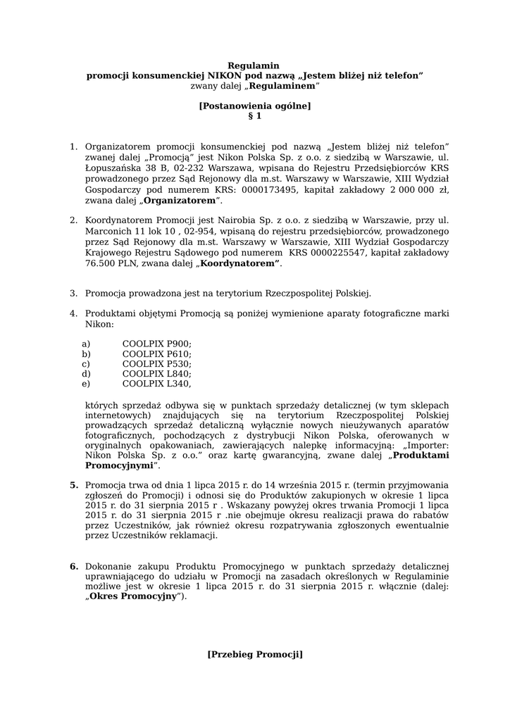 Regulamin promocji konsumenckiej NIKON pod nazwą „Jestem bliżej niż telefon” zwany dalej „Regulaminem” [Postanowienia ogólne] §1 1. Organizatorem promocji konsumenckiej pod nazwą „Jestem bliżej niż telefon” zwanej dalej „Promocją” jest Nikon Polska Sp. z o.o. z siedzibą w Warszawie, ul. Łopuszańska 38 B, 02-232 Warszawa, wpisana do Rejestru Przedsiębiorców KRS prowadzonego przez Sąd Rejonowy dla m.st. Warszawy w Warszawie, XIII Wydział Gospodarczy pod numerem KRS: 0000173495, kapitał zakładowy 2 000 000 zł, zwana dalej „Organizatorem”. 2. Koordynatorem Promocji jest Nairobia Sp. z o.o. z siedzibą w Warszawie, przy ul. Marconich 11 lok 10 , 02-954, wpisaną do rejestru przedsiębiorców, prowadzonego przez Sąd Rejonowy dla m.st. Warszawy w Warszawie, XIII Wydział Gospodarczy Krajowego Rejestru Sądowego pod numerem KRS 0000225547, kapitał zakładowy 76.500 PLN, zwana dalej „Koordynatorem”. 3. Promocja prowadzona jest na terytorium Rzeczpospolitej Polskiej. 4. Produktami objętymi Promocją są poniżej wymienione aparaty fotograficzne marki Nikon: a) b) c) d) e) COOLPIX COOLPIX COOLPIX COOLPIX COOLPIX P900; P610; P530; L840; L340, których sprzedaż odbywa się w punktach sprzedaży detalicznej (w tym sklepach internetowych) znajdujących się na terytorium Rzeczpospolitej Polskiej prowadzących sprzedaż detaliczną wyłącznie nowych nieużywanych aparatów fotograficznych, pochodzących z dystrybucji Nikon Polska, oferowanych w oryginalnych opakowaniach, zawierających nalepkę informacyjną: „Importer: Nikon Polska Sp. z o.o.” oraz kartę gwarancyjną, zwane dalej „Produktami Promocyjnymi”. 5. Promocja trwa od dnia 1 lipca 2015 r. do 14 września 2015 r. (termin przyjmowania zgłoszeń do Promocji) i odnosi się do Produktów zakupionych w okresie 1 lipca 2015 r. do 31 sierpnia 2015 r . Wskazany powyżej okres trwania Promocji 1 lipca 2015 r. do 31 sierpnia 2015 r .nie obejmuje okresu realizacji prawa do rabatów przez Uczestników, jak również okresu rozpatrywania zgłoszonych ewentualnie przez Uczestników reklamacji. 6. Dokonanie zakupu Produktu Promocyjnego w punktach sprzedaży detalicznej uprawniającego do udziału w Promocji na zasadach określonych w Regulaminie możliwe jest w okresie 1 lipca 2015 r. do 31 sierpnia 2015 r. włącznie (dalej: „Okres Promocyjny”). [Przebieg Promocji] §2 1. Na zasadach określonych w Regulaminie, w szczególności ust. 4 poniżej, za zakup Produktu Promocyjnego w Okresie Promocyjnym przysługuje od Organizatora rabat promocyjny w formie zwrotu części ceny kupionego Produktu Promocyjnego (dalej: „Rabat”). Wysokość Rabatu będzie zależeć od modelu zakupionego Produktu Promocyjnego zgodnie z poniższym: a) za zakup Produktu Promocyjnego COOLPIX P900 będzie przysługiwać Rabat wysokości 300 (słownie: trzystu) złotych brutto (wliczając podatek VAT); b) za zakup Produktu Promocyjnego COOLPIX P610 będzie przysługiwać Rabat wysokości 200 (słownie: dwustu) złotych brutto (wliczając podatek VAT); c) za zakup Produktu Promocyjnego COOLPIX P530 będzie przysługiwał Rabat wysokości 100 (słownie: stu) złotych brutto (wliczając podatek VAT); d) za zakup Produktu Promocyjnego COOLPIX L840 będzie przysługiwać Rabat wysokości 100 (słownie: stu) złotych brutto (wliczając podatek VAT); e) za zakup Produktu Promocyjnego COOLPIX L340 będzie przysługiwać Rabat wysokości 50 (słownie: pięćdziesięciu) złotych brutto (wliczając podatek VAT); w w w w w 2. Uczestnikiem Promocji może być: a) pełnoletnia osoba fizyczna w chwili dokonania zgłoszenia w Promocji zgodnie z Regulaminem, która dokonuje zakupu Produktu Promocyjnego działając jako konsument w rozumieniu art. 22 1 kodeksu cywilnego (tekst jednolity - Dz. U. 2014 r. poz. 121 z późn. zm.); b) przedsiębiorca, niezależnie od formy organizacyjno-prawnej (osoba fizyczna prowadząca jednoosobową działalność gospodarczą, jednostka organizacyjna nieposiadająca osobowości prawnej, której ustawa przyznaje zdolność do czynności prawnych, osoba prawna) posiadający miejsce zamieszkania albo siedzibę w Rzeczpospolitej Polskiej (dalej: „Uczestnik”). 3. Warunkiem otrzymania Nagrody w Promocji jest dokonanie zgłoszenia w Promocji (dalej: „Zgłoszenie”) polegającego na dokonaniu łącznie następujących czynności, we wskazanej poniżej kolejności: a) dokonanie zakupu Produktu Promocyjnego w Okresie Promocyjnym, przy czym, w przypadku zakupu Produktu Promocyjnego w sklepie internetowym, zakup Produktu Promocyjnego uznaje się za dokonany w Okresie Promocyjnym, jeżeli Uczestnik wyśle zamówienie Produktu Promocyjnego na serwer danego sklepu internetowego w czasie od godz. 00.00.01 dnia 1 lipca 2015 r. do godz. 23.59.59 dnia 31 sierpnia 2015 r.; b) zachowanie paragonu fiskalnego lub faktury VAT stanowiącej dowód dokonania zakupu, o którym mowa w lit. a) powyżej oraz karty gwarancyjnej znajdującej się w opakowaniu Produktu Promocyjnego; c) dokonanie rejestracji zakupu Produktu Promocyjnego: i. za pośrednictwem listu poleconego z dopiskiem „Jestem bliżej niż telefon” wysłanego w terminie do 14 września 2015 r. do Koordynatora na adres: ul. Marconich 11 lok 10 , 02-954 Warszawa zawierającego: kopię paragonu fiskalnego lub faktury VAT, o których mowa w lit. b) powyżej oraz kopię karty gwarancyjnej, o której mowa w lit. b) powyżej oraz wypełniony kupon promocyjny znajdujący się w opakowaniu Produktu Promocyjnego lub pobrany ze strony http://www.nikon.pl/promocje/ (dalej: „Kupon Promocyjny”) zwierający dane Uczestnika w postaci imienia, nazwiska, dokładnego adresu korespondencyjnego, adresu email i numeru telefonu komórkowego, jak również numer seryjny aparatu stanowiącego Produkt Promocyjny oraz zgodę na przetwarzanie danych osobowych Uczestnika dla celów przeprowadzenia Promocji i realizacji na jego rzecz Rabatu, przy czym, o zachowaniu terminu dokonania rejestr