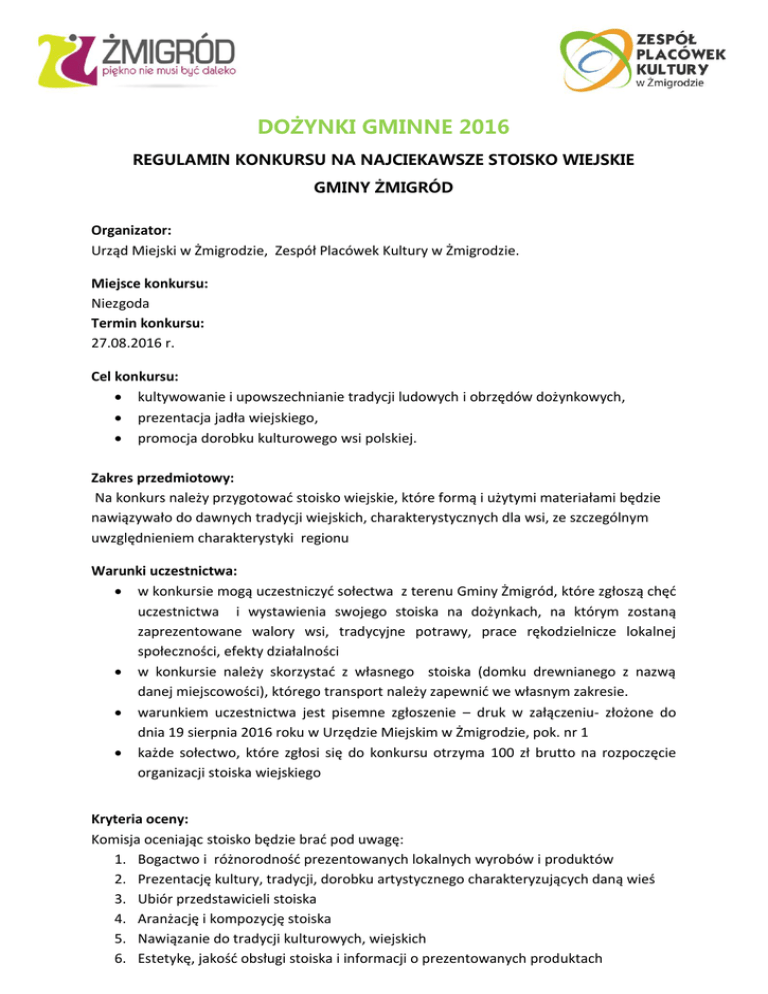 DOŻYNKI GMINNE 2016 REGULAMIN KONKURSU NA NAJCIEKAWSZE STOISKO WIEJSKIE GMINY ŻMIGRÓD Organizator: Urząd Miejski w Żmigrodzie, Zespół Placówek Kultury w Żmigrodzie. Miejsce konkursu: Niezgoda Termin konkursu: 27.08.2016 r. Cel konkursu: kultywowanie i upowszechnianie tradycji ludowych i obrzędów dożynkowych, prezentacja jadła wiejskiego, promocja dorobku kulturowego wsi polskiej. Zakres przedmiotowy: Na konkurs należy przygotować stoisko wiejskie, które formą i użytymi materiałami będzie nawiązywało do dawnych tradycji wiejskich, charakterystycznych dla wsi, ze szczególnym uwzględnieniem charakterystyki regionu Warunki uczestnictwa: w konkursie mogą uczestniczyć sołectwa z terenu Gminy Żmigród, które zgłoszą chęć uczestnictwa i wystawienia swojego stoiska na dożynkach, na którym zostaną zaprezentowane walory wsi, tradycyjne potrawy, prace rękodzielnicze lokalnej społeczności, efekty działalności w konkursie należy skorzystać z własnego stoiska (domku drewnianego z nazwą danej miejscowości), którego transport należy zapewnić we własnym zakresie. warunkiem uczestnictwa jest pisemne zgłoszenie – druk w załączeniu- złożone do dnia 19 sierpnia 2016 roku w Urzędzie Miejskim w Żmigrodzie, pok. nr 1 każde sołectwo, które zgłosi się do konkursu otrzyma 100 zł brutto na rozpoczęcie organizacji stoiska wiejskiego Kryteria oceny: Komisja oceniając stoisko będzie brać pod uwagę: 1. Bogactwo i różnorodność prezentowanych lokalnych wyrobów i produktów 2. Prezentację kultury, tradycji, dorobku artystycznego charakteryzujących daną wieś 3. Ubiór przedstawicieli stoiska 4. Aranżację i kompozycję stoiska 5. Nawiązanie do tradycji kulturowych, wiejskich 6. Estetykę, jakość obsługi stoiska i informacji o prezentowanych produktach Jury, oceniając stoiska weźmie pod uwagę ww. kryteria i w każdym zakresie przyzna od 1 do 5 punktów. Zwycięży to stoisko, które otrzyma największą ilość punktów. Jury ustala ilość przyznanych miejsc. Przebieg konkursu: 1. Stoiska należy ustawiać wg wskazania organizatora w godzinach porannych, tak by przed rozpoczęciem mszy świętej ekspozycje były gotowe. 2. Oferowane produkty lokalne prezentowane na stoisku będą udostępnione do degustacji (nieodpłatnie). Podsumowanie konkursu i nagrody: 1. Rozdanie nagród laureatom konkursu nastąpi podczas trwania uroczystości Dożynek Gminnych w Niezgodzie. 2. W konkursie przewidziane są nagrody rzeczowe lub pieniężne. Żmigród, dnia 7.07.2016 r. Załącznik do REGULAMIN KONKURSU NA NAJCIEKAWSZE STOISKO WIEJSKIE GMINY ŻMIGRÓD Zgłoszenie: Sołectwo: ……………………………………………………………………………. zgłasza udział w konkursie na najciekawsze stoisko wiejskie organizowane w ramach uroczystości Dożynki Gminne 2016 , które odbędą się 27 sierpnia 2016 r w Niezgodzie. Oświadczam, że zapoznałam-em się z Regulaminem KONKURSU NA NAJCIEKAWSZE STOISKO WIEJSKIE GMINY ŻMIGRÓD …………………………………………………………….. ( podpis sołtysa)