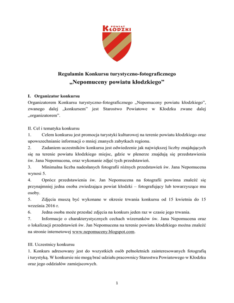 Regulamin Konkursu turystyczno-fotograficznego „Nepomuceny powiatu kłodzkiego” I. Organizator konkursu Organizatorem Konkursu turystyczno-fotograficznego „Nepomuceny powiatu kłodzkiego”, zwanego dalej „konkursem” jest Starostwo Powiatowe w Kłodzku zwane dalej „organizatorem”. II. Cel i tematyka konkursu 1. Celem konkursu jest promocja turystyki kulturowej na terenie powiatu kłodzkiego oraz upowszechnianie informacji o mniej znanych zabytkach regionu. 2. Zadaniem uczestników konkursu jest odwiedzenie jak największej liczby znajdujących się na terenie powiatu kłodzkiego miejsc, gdzie w plenerze znajdują się przedstawienia św. Jana Nepomucena, oraz wykonanie zdjęć tych przedstawień. 3. Minimalna liczba nadesłanych fotografii różnych przedstawień św. Jana Nepomucena wynosi 5. 4. Oprócz przedstawienia św. Jan Nepomucena na fotografii powinna znaleźć się przynajmniej jedna osoba zwiedzająca powiat kłodzki – fotografujący lub towarzyszące mu osoby. 5. Zdjęcia muszą być wykonane w okresie trwania konkursu od 15 kwietnia do 15 września 2016 r. 6. Jedna osoba może przesłać zdjęcia na konkurs jeden raz w czasie jego trwania. 7. Informacje o charakterystycznych cechach wizerunków św. Jana Nepomucena oraz o lokalizacji przedstawień św. Jan Nepomucena na terenie powiatu kłodzkiego można znaleźć na stronie internetowej www.nepomuceny.blogspot.com. III. Uczestnicy konkursu 1. Konkurs adresowany jest do wszystkich osób pełnoletnich zainteresowanych fotografią i turystyką. W konkursie nie mogą brać udziału pracownicy Starostwa Powiatowego w Kłodzku oraz jego oddziałów zamiejscowych. 1 2. Przesłanie zdjęć na konkurs oznacza, że uczestnik wyraża zgodę na przetwarzanie przez organizatora konkursu jego danych osobowych zgodnie z ustawą z dnia 29 sierpnia 1997 r. o ochronie danych osobowych (t.j. Dz. U. 2015 r. poz.2135 ze zm.) IV. Zgłaszanie prac 1. Zgłoszenie fotografii do konkursu odbywa się poprzez przesłanie plików w formie elektronicznej na adres [email protected]. Zdjęcia muszą być w formacie JPG, a wielkość pliku nie może być mniejsza niż 300 KB ani większa niż 1 MB. 2. W e-mailu przesłanym na adres organizatora powinny się znajdować następujące informacje: - temat wiadomości e-mail – „Konkurs Nepomuceny”, - karta zgłoszenia zawierająca: imię, nazwisko, adres, telefon, daty wykonania fotografii (przy czym data nie powinna znajdować się na fotografii), informacje o lokalizacji fotografowanych przedstawień św. Jana Nepomucena (miejscowość i ulica lub charakterystyczny opis miejsca), - plik JPG podpisany ma być nazwiskiem autora z kolejnym numerem fotografii np. Kowalski1, Kowalski2, a nie numerem nadanym przez aparat fotograficzny. 3. Obróbka zdjęć przesłanych na konkurs może polegać jedynie na działaniach odpowiadających zabiegom stosowanym w ciemni fotograficznej, polegających na globalnych zmianach - rozjaśnianiu, kontrastowaniu, redukcji koloru. Wszelkie inne zmiany, a zwłaszcza fotomontaż, są niedopuszczalne. Zdjęcie niespełniające wymagań konkursowych zostanie zdyskwalifikowane. 4. Zdjęcia na konkurs mogą przesyłać tylko ich autorzy. 5. Prace niespełniające wymogów regulaminu konkursu zostaną odrzucone. 6. Nadesłanie zdjęć na konkurs jest równoznaczne z wyrażeniem przez ich autora zgody na bezterminowe, wielokrotne bezpłatne wykorzystanie tych fotografii do celów promocyjnych powiatu kłodzkiego. 7. Nadesłanie zdjęcia na konkurs jest równoznaczne z wyrażeniem przez osoby znajdujące się na fotografii zgody na publikację wizerunku w elektronicznych i drukowanych materiałach promocyjnych Powiatu Kłodzkiego oraz na stronie internetowej www.nepomuceny.blogspot.com. 8. Przekazanie prac konkursowych oznacza jednocześnie, że nie będą one zagrażały ani naruszały praw osób trzecich, w szczególności nie będą naruszały ich majątkowych i osobistych praw autorskich. IV. Przebieg konkursu i nagrody 1. Zdjęcia można nadsyłać w okresie trwania konkursu od 15 kwietnia do 15 września 2016 r. 2. Zdjęcia oceniać będzie jury powołane przez organizatora. 2 3. Autorzy wszystkich prac spełniających warunki konkursu otrzymają mapę ziemi kłodzkiej oraz gadżet promocyjny. 4. Autorzy prac, którzy odwiedzili i sfotografowali ponad 10 przedstawień św. Jan Nepomucena otrzymają gadżety promocyjnych, mapę oraz folder. 5. Autorzy prac, którzy odwiedzili i sfotografowali ponad 20 przedstawień św. Jana Nepomucena otrzymają album „Hrabstwo kłodzkie na fotografii”, gadżety promocyjne, mapę oraz folder. 6. Nagrody rzeczowe zostaną przesłane pocztą na adres podany w karcie zgłoszenia. 7. Autor prac, który odwiedził najwięcej przedstawień św. Jana Nepomucena otrzyma nagrodę główną w postaci pobytu weekendowego w powiecie kłodzkim dla dwóch osób. W przypadku, gdy większa liczba uczestników prześle na konkurs jednakową największą liczbę zdjęć, powołane przez organizatora jury wybierze laureata nagrody głównej na podstawie oceny jakości zdjęć. 8. Fundatorem nagrody głównej są Uzdrowiska Kłodzkie S.A. – Grupa PGU. 9. Pobyt obejmuje: 2 noclegi dla dwóch osób z pełnym wyżywieniem oraz dostęp do Strefy Wellness SPA w tym basen, fitness oraz sauny w jednym z obiektów uzdrowiskowych tj. Wielka Pieniawa w Polanicy-Zdroju, Jan Kazimierz w DusznikachZdroju, Zameczek w Kudowie-Zdroju w terminie od 1 października do 18 grudnia 2016 roku. Obiekt wskazuje fundator nagrody po wyborze terminu pobytu przez laureata. V. Postanowienia końcowe 1. Regulamin Konkursu dostępny jest na stronie internetowej www.powiat.klodzko.pl oraz na stronie www.nepomuceny.blogspot.com. 2. W sprawach nieuregulowanych niniejszym regulaminem zastosowanie znajdują odpowiednie przepisy prawa polskiego. 3. Konkurs nie jest grą losową w rozumieniu art. 2 ustawy z dnia 19 listopada 2009 r. o grach hazardowych (j.t. Dz.U.2015.612 ze zm.) i