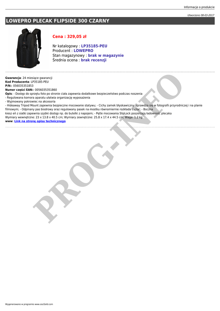 Informacje o produkcie Utworzono 08-03-2017 LOWEPRO PLECAK FLIPSIDE 300 CZARNY Cena : 329,05 zł Nr katalogowy : LP35185-PEU Producent : LOWEPRO Stan magazynowy : brak w magazynie Średnia ocena : brak recenzji PR O G -I N FO Gwarancja: 24 miesiące gwarancji Kod Producenta: LP35185-PEU P/N:: 056035351853 Numer części EAN:: 0056035351860 Opis: - Dostęp do sprzętu foto po stronie ciała zapewnia dodatkowe bezpieczeństwo podczas noszenia - Regulowana komora aparatu ułatwia organizację wyposażenia - Wyjmowany pokrowiec na akcesoria - Hideaway Tripod Mount zapewnia bezpieczne mocowanie statywu; - Cichy zamek błyskawiczny sprawdza się w fotografii przyrodniczej i na planie filmowym; - Odpinany pas biodrowy oraz regulowany pasek na mostku równomiernie rozkłada ciężar; - Boczna kiesz eń z siatki zapewnia szybki dostęp np. do butelki z napojem; - Pętle mocowania SlipLock poszerzają ładowność plecaka Wymiary wewnętrzne: 23 x 13.8 x 40.5 cm; Wymiary zewnętrzne: 25.8 x 17.4 x 44.5 cm; Waga: 1.2 kg www: Link na stronę opisu technicznego Wygenerowano w programie www.oscGold.com