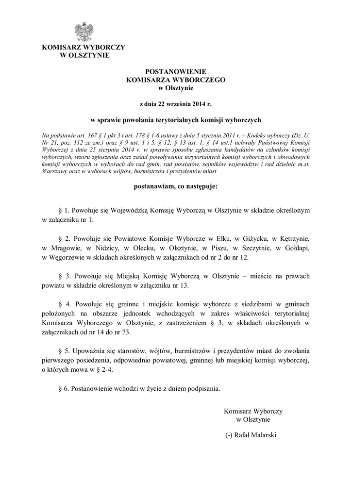 KOMISARZ WYBORCZY W OLSZTYNIE POSTANOWIENIE KOMISARZA WYBORCZEGO w Olsztynie z dnia 22 wrze nia 2014 r. w sprawie powo ania terytorialnych komisji wyborczych Na podstawie art. 167 § 1 pkt 3 i art. 178 § 1-6 ustawy z dnia 5 stycznia 2011 r. – Kodeks wyborczy (Dz. U. Nr 21, poz. 112 ze zm.) oraz § 9 ust. 1 i 5, § 12, § 13 ust. 1, § 14 ust.1 uchwa y Pa stwowej Komisji Wyborczej z dnia 25 sierpnia 2014 r. w sprawie sposobu zg aszania kandydatów na cz onków komisji wyborczych, wzoru zg oszenia oraz zasad powo ywania terytorialnych komisji wyborczych i obwodowych komisji wyborczych w wyborach do rad gmin, rad powiatów, sejmików województw i rad dzielnic m.st. Warszawy oraz w wyborach wójtów, burmistrzów i prezydentów miast postanawiam, co nast puje: § 1. Powo uje si Wojewódzk Komisj Wyborcz w Olsztynie w sk adzie okre lonym w za czniku nr 1. § 2. Powo uje si Powiatowe Komisje Wyborcze w E ku, w Gi ycku, w K trzynie, w Mr gowie, w Nidzicy, w Olecku, w Olsztynie, w Piszu, w Szczytnie, w Go dapi, w W gorzewie w sk adach okre lonych w za cznikach od nr 2 do nr 12. § 3. Powo uje si Miejsk Komisj Wyborcz w Olsztynie – mie cie na prawach powiatu w sk adzie okre lonym w za czniku nr 13. § 4. Powo uje si gminne i miejskie komisje wyborcze z siedzibami w gminach po onych na obszarze jednostek wchodz cych w zakres w ciwo ci terytorialnej Komisarza Wyborczego w Olsztynie, z zastrze eniem § 3, w sk adach okre lonych w za cznikach od nr 14 do nr 73. § 5. Upowa nia si starostów, wójtów, burmistrzów i prezydentów miast do zwo ania pierwszego posiedzenia, odpowiednio powiatowej, gminnej lub miejskiej komisji wyborczej, o których mowa w § 2-4. § 6. Postanowienie wchodzi w ycie z dniem podpisania. Komisarz Wyborczy w Olsztynie (-) Rafa Malarski Za cznik nr 1 do postanowienia Komisarz Wyborczy w Olsztynie z dnia 22 wrze nia 2014 r. Wojewódzka Komisja Wyborcza w Olsztynie Olsztyn, Urz d Marsza kowski Województwa Warmi sko-Mazurskiego, ul. Emilii Plater 1, pokój nr 433 Sk ad komisji: 1. Tomasz Madej zg oszenia dokona : Prezes S du Okr gowego w Olsztynie 2. Agnieszka Depczy ska, zam. Olsztyn zg oszenia dokona : KWW Forum Samorz dowe Powiatu Piskiego 3. Edyta Dorota Gadomska, zam. Olsztyn zg oszenia dokona : Komitet Wyborczy PSL 4. Ewa Monika Golakowicz, zam. Olsztyn zg oszenia dokona : KWW Piskie Forum 5. Danuta Ma gorzata Grabowska, zam. Orneta zg oszenia dokona : KWW Ruch Narodowy 6. Jolanta Kalinowska, zam. Olsztyn zg oszenia dokona : KWW VIP 7. Przemys aw Olszy ski, zam. Olsztyn zg oszenia dokona : KW Dobry Samorz d Miast i Gmin Olszty skich 8. Leon Edward Szel g, zam. Olsztyn zg oszenia dokona : KKW SLD Lewica Razem 9. Katarzyna Wade, zam. Olsztyn zg oszenia dokona : KWW Andrzej Ry ski-Olsztyn przyjazny ludziom Za cznik nr 13 do postanowienia Komisarz Wyborczy w Olsztynie z dnia 22 wrze nia 2014 r. Miejska Komisja Wyborcza w Olsztynie Olsztyn, Urz d Miasta Olsztyna, ul. Wyzwolenia 30, pokój nr 207 Sk ad komisji: 1. Anna Górczy ska zg oszenia dokona : Prezes S du Okr gowego w Olsztynie 2. Adriana Lucyna Agaci ska, zam. Olsztyn zg oszenia dokona : KWW Andrzej Ry ski-Olsztyn przyjazny ludziom 3. Maria Jolanta Cejmer, zam. Olsztyn zg oszenia dokona : KWW SoPraN 4. Hanna Godzieba, zam. Olsztyn zg oszenia dokona : KW Prawo i Sprawiedliwo 5. Monika Jurgin, zam. Olsztyn zg oszenia dokona : KW Dobry Samorz d Miast i Gmin Olszty skich 6. Cezary Kap on, zam. Olsztyn zg oszenia dokona : Komitet Wyborczy PSL 7. Iwona Kostrzewa-Kulczy ska, zam. Olsztyn zg oszenia dokona : KWW Olsztyn Nasz Dom 8. Andrzej Henryk Matusiak, zam. Olsztyn zg oszenia dokona : KW Platforma Obywatelska RP 9. Krzysztof Ludomir wi tek, zam. Olsztyn zg oszenia dokona : KWW Czes awa Jerzego Ma kowskiego