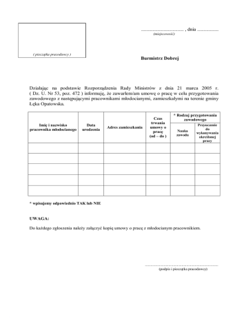 .................................. , dnia ................. (miejscowość) ( pieczątka pracodawcy ) Burmistrz Dobrej Działając na podstawie Rozporządzenia Rady Ministrów z dnia 21 marca 2005 r. ( Dz. U. Nr 53, poz. 472 ) informuję, że zawarłem/am umowę o pracę w celu przygotowania zawodowego z następującymi pracownikami młodocianymi, zamieszkałymi na terenie gminy Łęka Opatowska. Imię i nazwisko pracownika młodocianego Data urodzenia Adres zamieszkania Czas trwania umowy o pracę (od – do ) * Rodzaj przygotowania zawodowego Nauka zawodu Przyuczenie do wykonywania określonej pracy * wpisujemy odpowiednio TAK lub NIE UWAGA: Do każdego zgłoszenia należy załączyć kopię umowy o pracę z młodocianym pracownikiem. .............................................................................. (podpis i pieczątka pracodawcy)