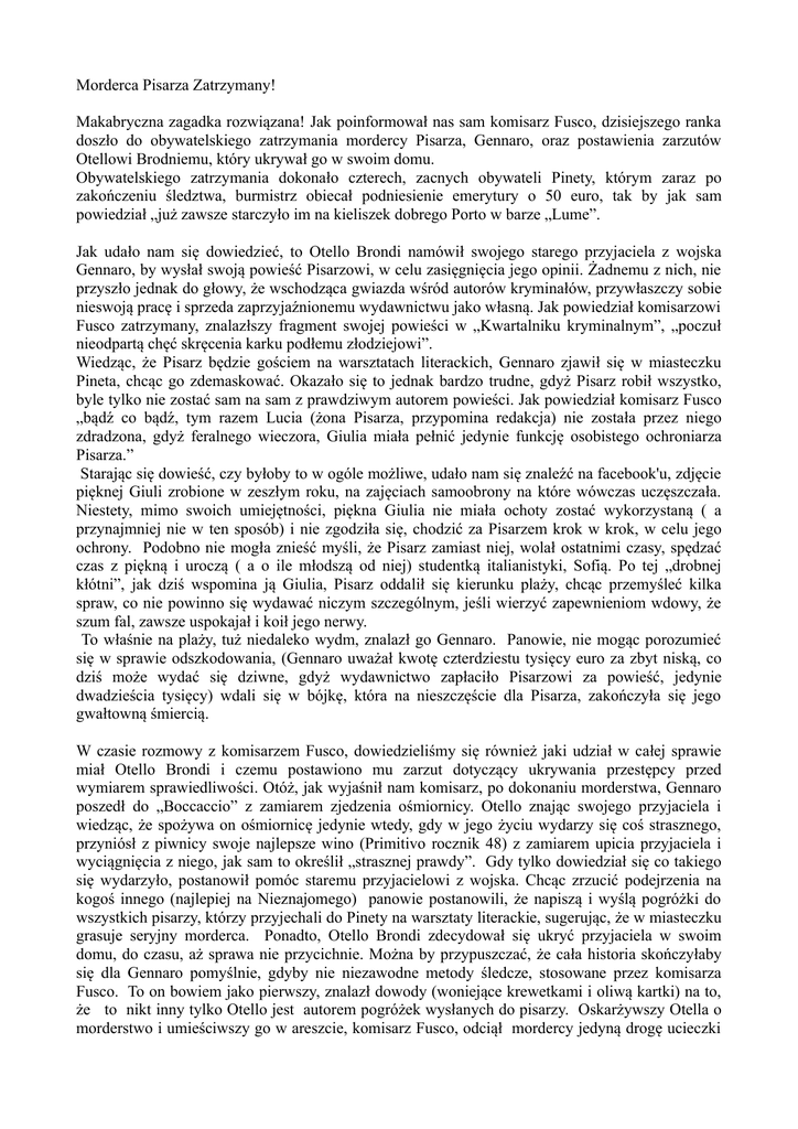 Morderca Pisarza Zatrzymany! Makabryczna zagadka rozwiązana! Jak poinformował nas sam komisarz Fusco, dzisiejszego ranka doszło do obywatelskiego zatrzymania mordercy Pisarza, Gennaro, oraz postawienia zarzutów Otellowi Brodniemu, który ukrywał go w swoim domu. Obywatelskiego zatrzymania dokonało czterech, zacnych obywateli Pinety, którym zaraz po zakończeniu śledztwa, burmistrz obiecał podniesienie emerytury o 50 euro, tak by jak sam powiedział „już zawsze starczyło im na kieliszek dobrego Porto w barze „Lume”. Jak udało nam się dowiedzieć, to Otello Brondi namówił swojego starego przyjaciela z wojska Gennaro, by wysłał swoją powieść Pisarzowi, w celu zasięgnięcia jego opinii. Żadnemu z nich, nie przyszło jednak do głowy, że wschodząca gwiazda wśród autorów kryminałów, przywłaszczy sobie nieswoją pracę i sprzeda zaprzyjaźnionemu wydawnictwu jako własną. Jak powiedział komisarzowi Fusco zatrzymany, znalazłszy fragment swojej powieści w „Kwartalniku kryminalnym”, „poczuł nieodpartą chęć skręcenia karku podłemu złodziejowi”. Wiedząc, że Pisarz będzie gościem na warsztatach literackich, Gennaro zjawił się w miasteczku Pineta, chcąc go zdemaskować. Okazało się to jednak bardzo trudne, gdyż Pisarz robił wszystko, byle tylko nie zostać sam na sam z prawdziwym autorem powieści. Jak powiedział komisarz Fusco „bądź co bądź, tym razem Lucia (żona Pisarza, przypomina redakcja) nie została przez niego zdradzona, gdyż feralnego wieczora, Giulia miała pełnić jedynie funkcję osobistego ochroniarza Pisarza.” Starając się dowieść, czy byłoby to w ogóle możliwe, udało nam się znaleźć na facebook'u, zdjęcie pięknej Giuli zrobione w zeszłym roku, na zajęciach samoobrony na które wówczas uczęszczała. Niestety, mimo swoich umiejętności, piękna Giulia nie miała ochoty zostać wykorzystaną ( a przynajmniej nie w ten sposób) i nie zgodziła się, chodzić za Pisarzem krok w krok, w celu jego ochrony. Podobno nie mogła znieść myśli, że Pisarz zamiast niej, wolał ostatnimi czasy, spędzać czas z piękną i uroczą ( a o ile młodszą od niej) studentką italianistyki, Sofią. Po tej „drobnej kłótni”, jak dziś wspomina ją Giulia, Pisarz oddalił się kierunku plaży, chcąc przemyśleć kilka spraw, co nie powinno się wydawać niczym szczególnym, jeśli wierzyć zapewnieniom wdowy, że szum fal, zawsze uspokajał i koił jego nerwy. To właśnie na plaży, tuż niedaleko wydm, znalazł go Gennaro. Panowie, nie mogąc porozumieć się w sprawie odszkodowania, (Gennaro uważał kwotę czterdziestu tysięcy euro za zbyt niską, co dziś może wydać się dziwne, gdyż wydawnictwo zapłaciło Pisarzowi za powieść, jedynie dwadzieścia tysięcy) wdali się w bójkę, która na nieszczęście dla Pisarza, zakończyła się jego gwałtowną śmiercią. W czasie rozmowy z komisarzem Fusco, dowiedzieliśmy się również jaki udział w całej sprawie miał Otello Brondi i czemu postawiono mu zarzut dotyczący ukrywania przestępcy przed wymiarem sprawiedliwości. Otóż, jak wyjaśnił nam komisarz, po dokonaniu morderstwa, Gennaro poszedł do „Boccaccio” z zamiarem zjedzenia ośmiornicy. Otello znając swojego przyjaciela i wiedząc, że spożywa on ośmiornicę jedynie wtedy, gdy w jego życiu wydarzy się coś strasznego, przyniósł z piwnicy swoje najlepsze wino (Primitivo rocznik 48) z zamiarem upicia przyjaciela i wyciągnięcia z niego, jak sam to określił „strasznej prawdy”. Gdy tylko dowiedział się co takiego się wydarzyło, postanowił pomóc staremu przyjacielowi z wojska. Chcąc zrzucić podejrzenia na kogoś innego (najlepiej na Nieznajomego) panowie postanowili, że napiszą i wyślą pogróżki do wszystkich pisarzy, którzy przyjechali do Pinety na warsztaty literackie, sugerując, że w miasteczku grasuje seryjny morderca. Ponadto, Otello Brondi zdecydował się ukryć przyjaciela w swoim domu, do czasu, aż sprawa nie przycichnie. Można by przypuszczać, że cała historia skończyłaby się dla Gennaro pomyślnie, gdyby nie niezawodne metody śledcze, stosowane przez komisarza Fusco. To on bowiem jako pierwszy, znalazł dowody (woniejące krewetkami i oliwą kartki) na to, że to nikt inny tylko Otello jest autorem pogróżek wysłanych do pisarzy. Oskarżywszy Otella o morderstwo i umieściwszy go w areszcie, komisarz Fusco, odciął mordercy jedyną drogę ucieczki z Pinety. Zamknięty od zewnątrz w piwnicy należącej do Otella, Gennaro po zjedzeniu całego koziego sera i wypiciu resztek znakomitego wina Primitivo, zaczął dawać znaki latarką ( w ciągu dnia zaś „niemiłosiernie hałasował” jak wspomina dziś właściciel baru „Lume”, Massimo) by ktoś znalazł go i wypuścił. To właśnie czterech zacnych obywateli miasteczka, wracając z baru Massima, zauważyło znaki „nadawane” przez Gennaro. Jak udało nam się ustalić, cierpiący na problemy z prostatą panowie, co jakiś czas musieli zatrzymywać się w drodze do domu, by opróżnić pęcherze. Podczas jednego takiego postoju, zauważyli znaki Gennera i postanowili sprawdzić, cóż takiego dzieje się w domu kucharza, podczas jego nieobecności (jak wiadomo siedział on wówczas w areszcie, oskarżony o morderstwo, nie wypowiadając ani jednego słowa na temat winy przyjaciela, chcąc uchronić go przed więzieniem ). Starsi panowie, grożąc Gennaro, że nie wypuszczą go z piwnicy, dopóki nie powie im jak się tam znalazł, zmusili go tym samym do wyznania prawdy. Nie wierząc do końca w umiejętności komisarza Fusco, zgłosili całą sprawę śledczym z Pizy, którzy natychmiast, gdy tylko dowiedzieli się, co takiego się stało, przyjechali by przejąć sprawę. W ten oto sposób zagadka tajemniczego morderstwa rozwiązała się. Kolejne spotkanie literackie w miasteczku Pienta odbędzie się już za rok, choć jak udało nam się ustalić burmistrz wciąż waha si