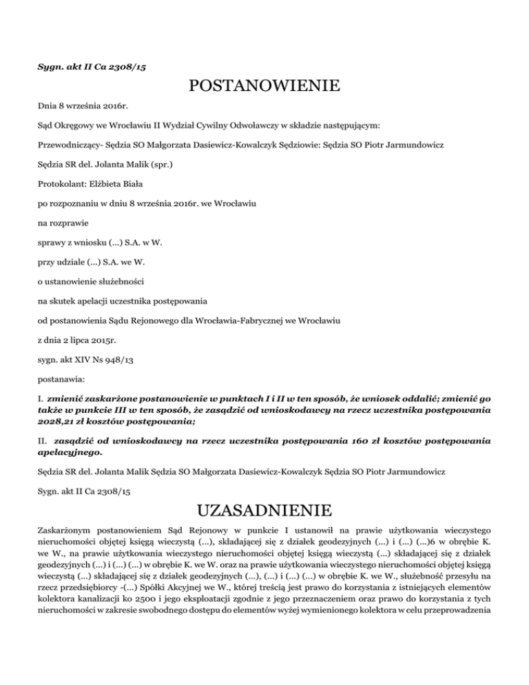 Sygn. akt II Ca 2308/15 POSTANOWIENIE Dnia 8 września 2016r. Sąd Okręgowy we Wrocławiu II Wydział Cywilny Odwoławczy w składzie następującym: Przewodniczący- Sędzia SO Małgorzata Dasiewicz-Kowalczyk Sędziowie: Sędzia SO Piotr Jarmundowicz Sędzia SR del. Jolanta Malik (spr.) Protokolant: Elżbieta Biała po rozpoznaniu w dniu 8 września 2016r. we Wrocławiu na rozprawie sprawy z wniosku (...) S.A. w W. przy udziale (...) S.A. we W. o ustanowienie służebności na skutek apelacji uczestnika postępowania od postanowienia Sądu Rejonowego dla Wrocławia-Fabrycznej we Wrocławiu z dnia 2 lipca 2015r. sygn. akt XIV Ns 948/13 postanawia: I. zmienić zaskarżone postanowienie w punktach I i II w ten sposób, że wniosek oddalić; zmienić go także w punkcie III w ten sposób, że zasądzić od wnioskodawcy na rzecz uczestnika postępowania 2028,21 zł kosztów postępowania; II. zasądzić od wnioskodawcy na rzecz uczestnika postępowania 160 zł kosztów postępowania apelacyjnego. Sędzia SR del. Jolanta Malik Sędzia SO Małgorzata Dasiewicz-Kowalczyk Sędzia SO Piotr Jarmundowicz Sygn. akt II Ca 2308/15 UZASADNIENIE Zaskarżonym postanowieniem Sąd Rejonowy w punkcie I ustanowił na prawie użytkowania wieczystego nieruchomości objętej księgą wieczystą (...), składającej się z działek geodezyjnych (...) i (...) (...)6 w obrębie K. we W., na prawie użytkowania wieczystego nieruchomości objętej księgą wieczystą (...) składającej się z działek geodezyjnych (...) i (...) (...) w obrębie K. we W. oraz na prawie użytkowania wieczystego nieruchomości objętej księgą wieczystą (...) składającej się z działek geodezyjnych (...), (...) i (...) (...) w obrębie K. we W., służebność przesyłu na rzecz przedsiębiorcy -(...) Spółki Akcyjnej we W., której treścią jest prawo do korzystania z istniejących elementów kolektora kanalizacji ko 2500 i jego eksploatacji zgodnie z jego przeznaczeniem oraz prawo do korzystania z tych nieruchomości w zakresie swobodnego dostępu do elementów wyżej wymienionego kolektora w celu przeprowadzenia prac związanych z jego eksploatacją, modernizacją, konserwacją, remontem, usuwaniem awarii, w punkcie II tytułem wynagrodzenia za ustanowienie służebności zasądzić od (...) S.A. we W. na rzecz (...) S.A. we W. kwotę (...),01 (sto pięćdziesiąt pięć tysięcy siedemdziesiąt siedem złotych jeden grosz) płatną w terminie 14 dni od uprawomocnienia się niniejszego postanowienia i z ustawowymi odsetkami w przypadku opóźnienia w jej płatności i oddalić dalej idący wniosek o przyznanie wynagrodzenia oraz w punkcie III stwierdził, że wnioskodawca i uczestnik ponoszą koszty związane ze swym udziałem w sprawie i oddalić ich wnioski o zasądzenie kosztów postępowania. Rozstrzygnięcie swoje Sąd I instancji wydał w oparciu o następujące ustalenia faktyczne: Wnioskodawca jest użytkownikiem wieczystym trzech nieruchomości, a mianowicie: • objętej księgą wieczystą (...), składającej się z działek geodezyjnych (...) i (...)(...)6 w obrębie K. we W. • objętej księgą wieczystą (...) składającej się z działek geodezyjnych (...) i (...) (...) w obrębie K. we W. - objętej księgą wieczystą (...) składającej się z działek geodezyjnych (...), (...) i (...) AM6 w obrębie K. we W.. Właścicielem wszystkich wymienionych nieruchomości jest Gmina (...), która nabyła je od Skarbu Państwa z mocy prawa z dniem 27 maja 1990 r. na zasadzie art. 5 ust. 1 ustawy - przepisy wprowadzające ustawę o samorządzie terytorialnych i ustawę o pracownikach samorządowych. Na nieruchomościach oznaczonych jak wyżej znajdują się urządzenia przesyłowe w postaci kolektora kanalizacji ogólnospławnej ko 2500 zwanego Kolektorem Północnym, wchodzące w skład przedsiębiorstwa uczestnika postępowania. Przedmiotowy kolektor wybudowano w ramach inwestycji realizowanej przez instytucje państwowe w latach 1973 -1974, zaś użytkownikiem sieci przesyłowej było (...) we W. mające w tamtym czasie status przedsiębiorstwa państwowego. Przedsiębiorstwo to z dniem 27 maja 1990 roku prowadziło działalność jako przedsiębiorstwo (...), a w wykonaniu uchwały Rady Miejskiej W. z dnia 18 grudnia 1991 roku zostało przekształcone w spółkę z ograniczoną odpowiedzialnością będącą (...) spółką (...), a w dalszej kolejności w spółkę akcyjną działającą pod nazwą (...) we W.. W dniu 4 czerwca 2009 roku wnioskodawca wystąpił wobec (...) spółki z o.o. we W. z wnioskiem o zawezwanie do próby ugodowej przed Sądem Rejonowym dla Wrocławia - Krzyków, w sprawie I Co 2257/09. Przedmiotem wezwania było żądanie usunięcia posadowionych na wymienionych wyżej nieruchomościach urządzeń między innymi kolektora północnego oraz zapłaty wynagrodzenia za bezumowne korzystanie z tegoż. Pomimo przeprowadzenia postępowania pojednawczego do zawarcia ugody nie doszło. Pismem z dnia 4 września 2013 roku wnioskodawca wezwał uczestnika do ustanowienia służebności przesyłu o treści jak w żądaniu wniosku w niniejszej sprawie na przedmiotowych nieruchomościach za wynagrodzeniem w kwocie 837 788 zł. Żądanie wynagrodzenia oparto na wycenie służebności określonej w wykonanym na zlecenie wnioskodawcy operacie szacunkowym rzeczoznawcy Z. M.. Pismem z 16 września 2013 roku uczestnik postępowania zaproponował zawarcie umowy w przedmiocie ustanowienia służebności za wynagrodzeniem wynoszącym 81 400 zł, również w oparciu o zlecony przez siebie operat szacunkowy. Przy uwzględnieniu zakresu korzystania z nieruchomości w użytkowaniu wieczystym wnioskodawcy dla celów związanych z eksploatacją przedmiotowego kolektora oraz przeznaczenia przedmiotowych nieruchomości wartość służebności przesyłu odpowiadających temu obciążeniu dla poszczególnych działek wynosi: • dla działek objętych księgą wieczystą (...) 40063,90 zł • dla działek objętych