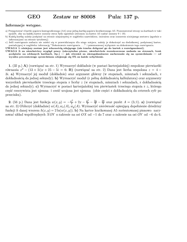 GEO Zestaw nr 80008 Pula: 137 p. Informacje wst¦pne. a) Przygotowa¢ 4 kartki papieru kserogracznego (A4) oraz jedn¡ kartk¦ papieru kratkowanego A5. Ponumerowa¢ strony na kartkach w taki sposób, aby na ka»dej kartce numery stron byªy s¡siednie (stronom na kartce A5 nada¢ numery 9 i 10). b) Ka»d¡ kartk¦ nale»y podpisa¢ na stronie nieparzystej w nagªówku nazwiskiem, imieniem oraz numerem niniejszego zestawu (zgodnie z informacjami na stronie tytuªowej). c) Je±li rozwi¡zanie zadania nie mie±ci si¦ w przewidzianym dla niego miejscu, nale»y je doko«czy¢ na dodatkowej, podpisanej kartce, posiadaj¡cej w nagªówku informacj¦ "Doko«czenie rozwi¡zania ....." i przeznaczonej wyª¡cznie na doko«czenie tego rozwi¡zania. UWAGA 1: niniejszy zestaw jest wªasno±ci¡ zdaj¡cego (nie trzeba doª¡cza¢ go do kartek z rozwi¡zaniami). UWAGA 2: za niewªa±ciwy wygl¡d pracy (nieczytelne pismo, niewªa±ciwie rozmieszczone zadania na stronach, brak podpisów na oddanych kartkach, itp.) | jak równie» za nieregulaminowe zachowanie si¦ na sprawdzianie | od wyniku procentowego sprawdzianu odejmuje si¦ 5% za ka»de uchybienie. 1. (32 p.) A) (rozwi¡za¢ na str. 1) Wyznaczy¢ dokªadnie (w postaci kartezja«skiej) zespolone pierwiastki równania x2 (13 + 2i)x + 25 5i = 0. B) (rozwi¡za¢ na str. 2) Dana jest liczba zespolona z = 4 3i. a) Wyznaczy¢ jej moduª (dokªadnie) oraz argument gªówny (w stopniach, minutach i sekundach, z dokªadno±ci¡ do jednej sekundy). b) Wyznaczy¢ moduª (z peªn¡ dokªadno±ci¡ kalkulatora) oraz argumenty wszystkich pierwiastków trzeciego stopnia z liczby z (w stopniach, minutach i sekundach, z dokªadno±ci¡ do jednej sekundy). c) Wyznaczy¢ w postaci kartezja«skiej ten pierwiastek trzeciego stopnia z z , którego cz¦±¢ rzeczywista jest ujemna i cze±¢ urojona jest ujemna (obie cz¦±ci z dokªadno±ci¡ do czterech cyfr po przecinku). x2 4 2 + 2x y9 29y 289 oraz punkt A = (5; 1). a) (rozwi¡za¢ na str. 3) Obliczy¢ (dokªadnie) w(A); wx (A); wy (A). Wyznaczy¢ nierówno±¢ opisuj¡c¡ dopeªnienie dziedziny funkcji h danej wzorem h(x; y) = 2 ln(w(x; y)). b) Na kartce kratkowanej A5 zorientowanej pionowo narysowa¢ ukªad wspóªrz¦dnych XOY o zakresie na osi OX od 1 do 7 oraz o zakresie na osi OY od 6 do 6. 2. (56 p.) Dana jest funkcja w(x; y) = Na obu osiach jednostk¦ wyznacza zale»no±¢ 1,5 cm = 1 . Na ukªadzie zakreskowa¢ dopeªnienie dziedziny funkcji h oraz zaznaczy¢ punkt A. c) (rozwi¡za¢ na str. 4) Wyznaczy¢ (dokªadnie) h(A); hx (A); hy (A) oraz wektor gradientu dla funkcji h w punkcie A. Wyznaczy¢ (w stopniach, minutach i sekundach, z dokªadno±ci¡ do sekundy) k¡t nachylenia powierzchni h do poziomu w punkcie A w kierunku wektora gradientu. d) (rozwi¡za¢ na str. 5) Wyznaczy¢ w postaci k¡ta nachylenia do osi OX na pªaszczy¹nie XOY dowolnie wybrany jeden z dwóch kierunków (w radianach z zakresu 0 2, z peªn¡ dokªadno±ci¡ kalkulatora), dla których nachylenie powierzchni h do poziomu w punkcie A wynosi 30 000 0000 . Dla powierzchni h napisa¢ równanie warstwicy W przechodz¡cej przez punkt A. e) Na ukªadzie narysowa¢ warstwic¦ W oraz wektor gradientu wyznaczony w c), zaczepiony w punkcie A. 0 3. (35 p.,1 rozpocz¡¢ rozwi¡zanie na str. 7, mo»na kontynuowa¢ na str. 8) 2Dane3 s¡ funkcje f (s; t) = 3t 2s A p oraz g(x; y; z ) = 3 (x 2y + 2z )2 . a) Obliczy¢ f ( 3; 1) w postaci 64 B 75 (A; B; C s¡ liczbami C 2 3 D E caªkowitymi) oraz f 0 ( 3; 1) w postaci 64 F G 75, gdzie staªe D; E; F; G; H; K s¡ liczbami caªkowitymi. H K 2 0 b) Obliczy¢ g (f ( 3; 1)) w postaci 15 [T; U; V ], gdzie T; U; V s¡ liczbami caªkowitymi. c) Korzystaj¡c z a) i b) oraz z wzoru na pochodn¡ funkcji zªo»onej obliczy¢ (g f )0 ( 3; 1) w postaci 65 [M; N ] (tzn., wyznaczy¢ liczby caªkowite M; N ) B @ 7s2 t 2s+t s+4t C A 4. (14 p., rozwi¡za¢ na str. 6) a) Równanie x = A tg(y + x) + B jest caªk¡ ogóln¡ pewnego równania ró»niczkowego postaci y00 = F (x; y; y0 ). Wyznaczy¢ funkcj¦ F (a; b; c). Element kontroli: F (1; 3; 2) 4; 37008.