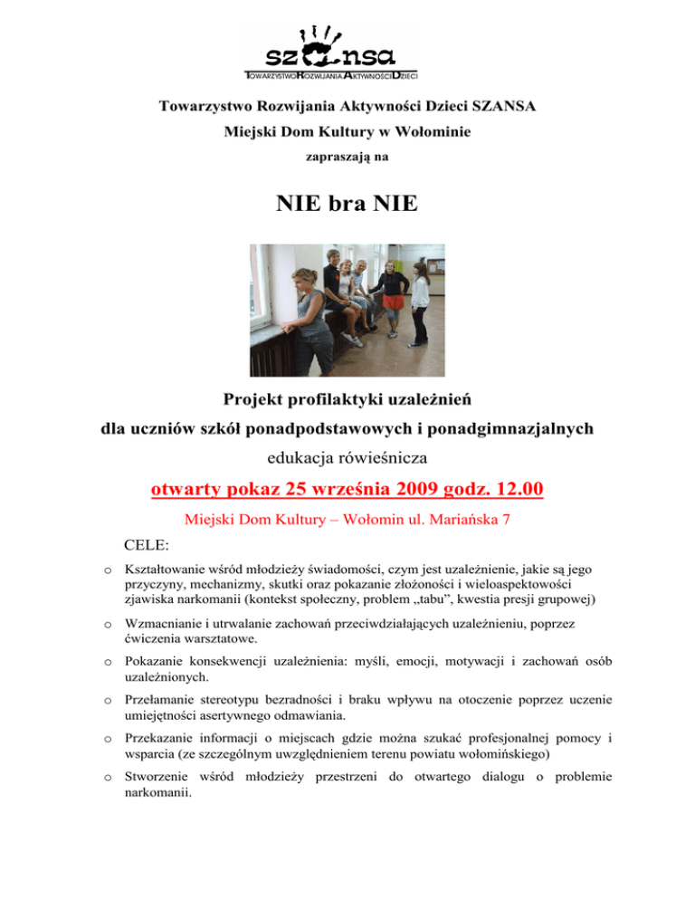 Towarzystwo Rozwijania Aktywności Dzieci SZANSA Miejski Dom Kultury w Wołominie zapraszają na NIE bra NIE Projekt profilaktyki uzaleŜnień dla uczniów szkół ponadpodstawowych i ponadgimnazjalnych edukacja rówieśnicza otwarty pokaz 25 września 2009 godz. 12.00 Miejski Dom Kultury – Wołomin ul. Mariańska 7 CELE: o Kształtowanie wśród młodzieŜy świadomości, czym jest uzaleŜnienie, jakie są jego przyczyny, mechanizmy, skutki oraz pokazanie złoŜoności i wieloaspektowości zjawiska narkomanii (kontekst społeczny, problem „tabu”, kwestia presji grupowej) o Wzmacnianie i utrwalanie zachowań przeciwdziałających uzaleŜnieniu, poprzez ćwiczenia warsztatowe. o Pokazanie konsekwencji uzaleŜnienia: myśli, emocji, motywacji i zachowań osób uzaleŜnionych. o Przełamanie stereotypu bezradności i braku wpływu na otoczenie poprzez uczenie umiejętności asertywnego odmawiania. o Przekazanie informacji o miejscach gdzie moŜna szukać profesjonalnej pomocy i wsparcia (ze szczególnym uwzględnieniem terenu powiatu wołomińskiego) o Stworzenie wśród młodzieŜy przestrzeni do otwartego dialogu o problemie narkomanii. METODA: Projekt jest realizowany metodą warsztatową, która kładzie nacisk na szukanie rozwiązań, pokazywanie moŜliwości działania i wydobywanie pozytywnych zasobów. Uczestnicy szkolenia nie są jedynie biernymi widzami, ale mają wpływ na to, co się wokół dzieje. Skutkuje to większym zaangaŜowaniem i daje realną szansę na zmianę zachowań na bardziej konstruktywne. W oparciu o własny potencjał i pozytywne zasoby osobiste, uczniowie rozwijają swoją wraŜliwość, zdolności komunikacji oraz umiejętność stawiania granic i przeciwstawiania się zewnętrznej presji. ORGANIZACJA: Projekt składa się z dwóch modułów. Moduł I – Interaktywny spektakl i warsztaty dramowe. Prowadzony jest przez certyfikowanego terapeutę uzaleŜnień oraz pedagogów pracujących metodą dramy. Moduł współrealizuje młodzieŜ z grupy teatralnej WPROST, dzięki czemu projekt wpisuje się w nurt edukacji rówieśniczej, której głównymi zaletami jest to, Ŝe: • • • • • Młodzi ludzie chętniej przyjmują informacje od swoich rówieśników niŜ od dorosłych. Zwłaszcza wtedy, gdy wychowywali się w trudnych warunkach i często doznawali rozczarowań od dorosłych w swoim otoczeniu. Młodzi ludzie mówią szczerze, co czują lub myślą swoim rówieśnikom, niŜ dorosłej osobie, której oceny będą się obawiać. Często łatwiej jest zadawać pytania i dyskutować na róŜne tematy z rówieśnikami. Młodzi ludzie silniej identyfikują się z ludźmi w swoim wieku, a informacje uzyskiwane od rówieśników mogą się im wydawać bardziej wiarygodne. Młodzi ludzie posługują się tym samym językiem. Moduł II – Warsztaty edukacyjne. Prowadzony jest przez psychologów specjalizujących się w pracy z dziećmi i młodzieŜą. Systematyzuje to, czego uczestnicy doświadczyli podczas interaktywnego spektaklu i warsztatów dramowych. Obejmie m. in. • • • • nazwanie problemów, które pojawiły się w spektaklu prace poznawczą w odniesieniu do spektaklu – skutki zaŜywania substancji psychoaktywnych (psychiczne, ekonomiczne, prawne, somatyczne) trening asertywności szukanie alternatywnych – zdrowych sposobów rozwiązywania problemu Pokazy projektu dofinansowane przez Powiat Wołomiński PARTNERZY PROJEKTU: • Ośrodek Profilaktyki i Terapii UzaleŜnień Wołominie • Miejski Dom Kultury w Wołominie • Ośrodek Kultury w Kobyłce PROJEKT TOWARZYSTWA ROZWIJANIA AKTYWNOŚCI DZIECI „SZANSA” KONTAKT: Barbara Stasiszyn Mazowiecki Oddział Terenowy TRAD SZANSA tel. 0/600 804 680