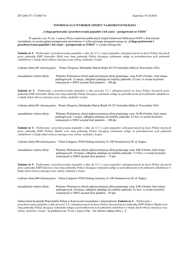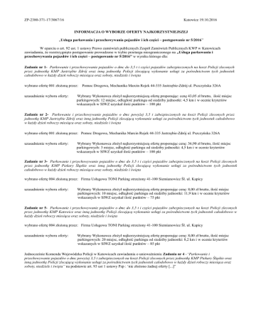 ZP-2380-371-17/3067/16 Katowice 19.10.2016 INFORMACJA O WYBORZE OFERTY NAJKORZYSTNIEJSZEJ „Usługa parkowania i przechowywania pojazdów i ich części – postępowanie nr 5/2016” W oparciu o art. 92 ust. 1 ustawy Prawo zamówień publicznych Zespół Zamówień Publicznych KWP w Katowicach zawiadamia, że rozstrzygnięto postępowanie prowadzone w trybie przetargu nieograniczonego na „Usługa parkowania i przechowywania pojazdów i ich części – postępowanie nr 5/2016” w wyniku którego dla: Zadanie nr 1- Parkowanie i przechowywanie pojazdów o dmc do 3,5 t i części pojazdów zabezpieczonych na koszt Policji zleconych przez jednostkę KMP Jastrzębie Zdrój oraz inną jednostkę Policji zlecającą wykonanie usługi za pośrednictwem tych jednostek całodobowo w każdy dzień roboczy miesiąca oraz soboty, niedziele i święta wybrano ofertę 001 złożoną przez: uzasadnienie wyboru oferty: Pomoc Drogowa, Mechanika Marcin Rojek 44-335 Jastrzębie-Zdrój ul. Pszczyńska 326A Wybrany Wykonawca złożył najkorzystniejszą ofertę proponując: cenę 43,05 zł brutto, ilość miejsc parkingowych: 12 miejsc, odległość parkingu od siedziby jednostki: 4,5 km i w ocenie kryteriów wskazanych w SIWZ uzyskał ilość punktów – 100 pkt Zadanie nr 2- Parkowanie i przechowywanie pojazdów o dmc powyżej 3,5 t zabezpieczonych na koszt Policji zleconych przez jednostkę KMP Jastrzębie Zdrój oraz inną jednostkę Policji zlecającą wykonanie usługi za pośrednictwem tych jednostek całodobowo w każdy dzień roboczy miesiąca oraz soboty, niedziele i święta wybrano ofertę 001 złożoną przez: Pomoc Drogowa, Mechanika Marcin Rojek 44-335 Jastrzębie-Zdrój ul. Pszczyńska 326A uzasadnienie wyboru oferty: Wybrany Wykonawca złożył najkorzystniejszą ofertę proponując cenę: 36,90 zł brutto, ilość miejsc parkingowych: 3 miejsc, odległość parkingu od siedziby jednostki: 4,5 km i w ocenie kryteriów wskazanych w SIWZ uzyskał ilość punktów – 100 pkt Zadanie nr 3- Parkowanie i przechowywanie pojazdów o dmc do 3,5 t i części pojazdów zabezpieczonych na koszt Policji zleconych przez jednostkę KMP Piekary Śląskie oraz inną jednostkę Policji zlecającą wykonanie usługi za pośrednictwem tych jednostek całodobowo w każdy dzień roboczy miesiąca oraz soboty, niedziele i święta wybrano ofertę 004 złożoną przez: Firma Usługowa TONI Parking strzeżony 41-100 Siemianowice Śl. ul. Kapicy uzasadnienie wyboru oferty: Wybrany Wykonawca złożył najkorzystniejszą ofertę proponując cenę: 8,00 zł brutto, ilość miejsc parkingowych: 10 miejsc, odległość parkingu od siedziby jednostki: 11,9 km i w ocenie kryteriów wskazanych w SIWZ uzyskał ilość punktów – 75 pkt Zadanie nr 5- Parkowanie i przechowywanie pojazdów o dmc do 3,5 t i części pojazdów zabezpieczonych na koszt Policji zleconych przez jednostkę KMP Katowice oraz inną jednostkę Policji zlecającą wykonanie usługi za pośrednictwem tych jednostek całodobowo w każdy dzień roboczy miesiąca oraz soboty, niedziele i święta wybrano ofertę 004 złożoną przez: Firma Usługowa TONI Parking strzeżony 41-100 Siemianowice Śl. ul. Kapicy uzasadnienie wyboru oferty: Wybrany Wykonawca złożył najkorzystniejszą ofertę proponując cenę: 8,00 zł brutto, ilość miejsc parkingowych: 20 miejsc, odległość parkingu od siedziby jednostki: 8,2 km i w ocenie kryteriów wskazanych w SIWZ uzyskał ilość punktów – 85 pkt Jednocześnie Komenda Wojewódzka Policji w Katowicach zawiadamia o unieważnieniu Zadania nr 4 - ‘Parkowanie i przechowywanie pojazdów o dmc powyżej 3,5 t zabezpieczonych na koszt Policji zleconych przez jednostkę KMP Piekary Śląskie oraz inną jednostkę Policji zlecającą wykonanie usługi za pośrednictwem tych jednostek całodobowo w każdy dzień roboczy miesiąca oraz soboty, niedziele i święta” na podstawie art. 93 ust 1 ustawy Pzp : ‘nie złożono żadnej oferty [...]” 2. Zestawienie złożonych ofert: Nr oferty Wykonawca Kryteria Zadanie 1 KMP Jastrzębie Z. do 3,5 3600,00 zł Zadanie 2 KMP Jastrzębie Z. Pow. 3,5 1000,00 zł Zadanie 3 KMP Piekary Śl. Do 3,5 4200,00 zł Zadanie 4 KMP Piekary Śl. pow. 3,5 1000,00 zł Zadanie 5 KMP Katowice do 3,5 51 000,00 zł 001 Pomoc Drogowa, Mechanika Marcin Rojek 44-335 Jastrzębie-Zdrój ul. Pszczyńska 326A Cena Ilość miejsc parkingowych Odległość 43,05 zł 12 4,5 km 36,90 zł 3 4,5 km - - - 002 Przedsiębiorstwo Wielobranżowe MICHAŁ Eugeniusz Janek ul. K. Szymanowskiego 14/5 41-103 Siemianowice Śl. Cena Ilość miejsc parkingowych Odległość - - 24,60 zł 40 11,2 km - 10,95 zł 40 13,2 km 003 AGF Arkadiusz Wróbel 41-400 Mysłowice ul. Ks. N. Bończyka 11 Cena Ilość miejsc parkingowych Odległość - - - - 24,60 zł 18 19,7 km 004 Firma Usługowa TONI Parking strzeżony 41-100 Siemianowice Śl. ul. Kapicy Cena Ilość miejsc parkingowych Odległość - - 8,00 zł 10 11,9 km - 8,00 zł 20 8,2 km 3.Do niniejszego postępowania wpłynęły ogółem 3 oferty (streszczenie i porównanie złożonych ofert): Nr oferty Wykonawca 001 Pomoc Drogowa, Mechanika Marcin Rojek 44-335 Jastrzębie-Zdrój ul. Pszczyńska 326A 002 Przedsiębiorstwo Wielobranżowe MICHAŁ Eugeniusz Janek ul. K. Szymanowskiego 14/5 41-103 Siemianowice Śl. 003 004 AGF Arkadiusz Wróbel 41-400 Mysłowice ul. Ks. N. Bończyka 11 Firma Usługowa TONI Parking strzeżony 41-100 Siemianowice Śl. ul. Kapicy Kryteria cena Ilość miejsc parkingowych odległość SUMA cena Ilość miejsc parkingowych Odległość SUMA cena Ilość miejsc parkingowych Odległość SUMA cena Ilość miejsc parkingowych Odległość SUMA Zadanie 1 Zadanie 2 KMP Jastrzębie Z. do 3,5 KMP Jastrzębie Z. Pow. 3,5 3600,00 zł 1000,00 zł Zadanie 3 KMP Piekary Śl. Do 3,5 4200,00 zł Zadanie 4 KMP Piekary Śl. pow. 3,5 1000,00 zł Zadanie 5 KMP Katowice do 3,5 51 000,00 zł - - - - 43,84 pkt 20 pkt 10 pkt 73,84 pkt 19,51 pkt 9 pkt 5 pkt 33,51 pkt 60 pkt 2