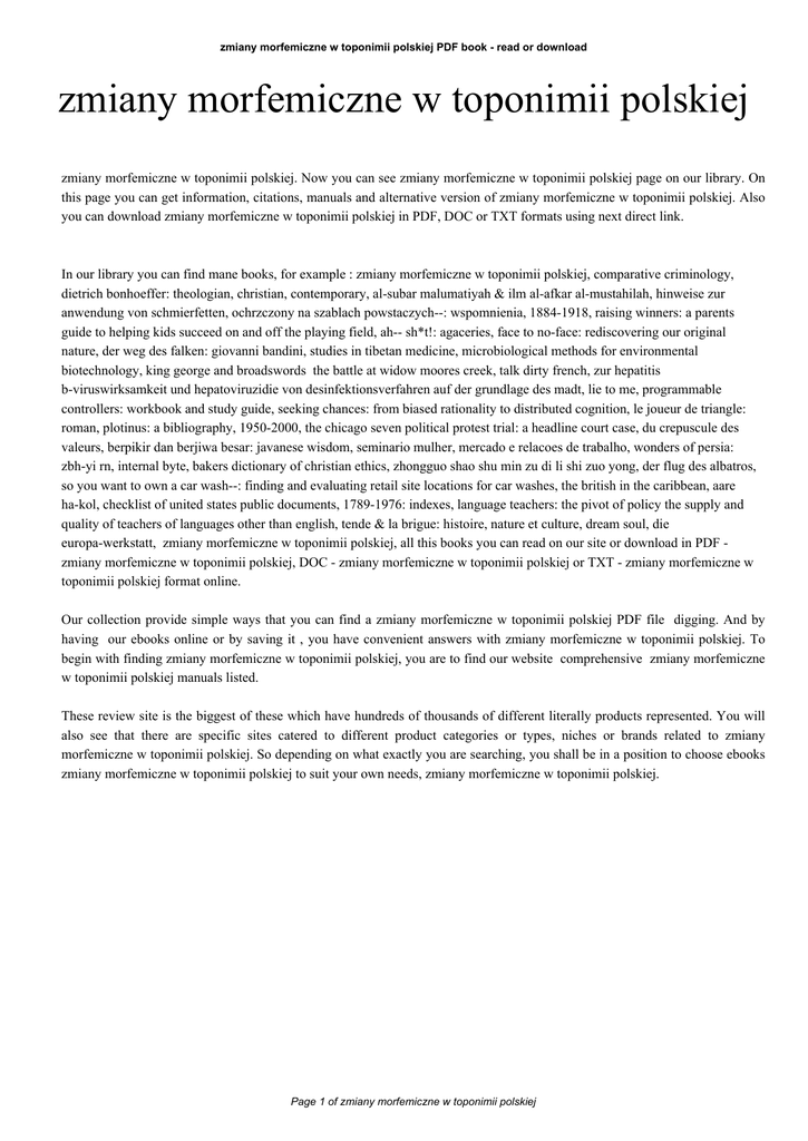 zmiany morfemiczne w toponimii polskiej PDF book - read or download zmiany morfemiczne w toponimii polskiej zmiany morfemiczne w toponimii polskiej. Now you can see zmiany morfemiczne w toponimii polskiej page on our library. On this page you can get information, citations, manuals and alternative version of zmiany morfemiczne w toponimii polskiej. Also you can download zmiany morfemiczne w toponimii polskiej in PDF, DOC or TXT formats using next direct link. In our library you can find mane books, for example : zmiany morfemiczne w toponimii polskiej, comparative criminology, dietrich bonhoeffer: theologian, christian, contemporary, al-subar malumatiyah & ilm al-afkar al-mustahilah, hinweise zur anwendung von schmierfetten, ochrzczony na szablach powstaczych--: wspomnienia, 1884-1918, raising winners: a parents guide to helping kids succeed on and off the playing field, ah-- sh*t!: agaceries, face to no-face: rediscovering our original nature, der weg des falken: giovanni bandini, studies in tibetan medicine, microbiological methods for environmental biotechnology, king george and broadswords the battle at widow moores creek, talk dirty french, zur hepatitis b-viruswirksamkeit und hepatoviruzidie von desinfektionsverfahren auf der grundlage des madt, lie to me, programmable controllers: workbook and study guide, seeking chances: from biased rationality to distributed cognition, le joueur de triangle: roman, plotinus: a bibliography, 1950-2000, the chicago seven political protest trial: a headline court case, du crepuscule des valeurs, berpikir dan berjiwa besar: javanese wisdom, seminario mulher, mercado e relacoes de trabalho, wonders of persia: zbh-yi rn, internal byte, bakers dictionary of christian ethics, zhongguo shao shu min zu di li shi zuo yong, der flug des albatros, so you want to own a car wash--: finding and evaluating retail site locations for car washes, the british in the caribbean, aare ha-kol, checklist of united states public documents, 1789-1976: indexes, language teachers: the pivot of policy the supply and quality of teachers of languages other than english, tende & la brigue: histoire, nature et culture, dream soul, die europa-werkstatt, zmiany morfemiczne w toponimii polskiej, all this books you can read on our site or download in PDF zmiany morfemiczne w toponimii polskiej, DOC - zmiany morfemiczne w toponimii polskiej or TXT - zmiany morfemiczne w toponimii polskiej format online. Our collection provide simple ways that you can find a zmiany morfemiczne w toponimii polskiej PDF file digging. And by having our ebooks online or by saving it , you have convenient answers with zmiany morfemiczne w toponimii polskiej. To begin with finding zmiany morfemiczne w toponimii polskiej, you are to find our website comprehensive zmiany morfemiczne w toponimii polskiej manuals listed. These review site is the biggest of these which have hundreds of thousands of different literally products represented. You will also see that there are specific sites catered to different product categories or types, niches or brands related to zmiany morfemiczne w toponimii polskiej. So depending on what exactly you are searching, you shall be in a position to choose ebooks zmiany morfemiczne w toponimii polskiej to suit your own needs, zmiany morfemiczne w toponimii polskiej. Page 1 of zmiany morfemiczne w toponimii polskiej