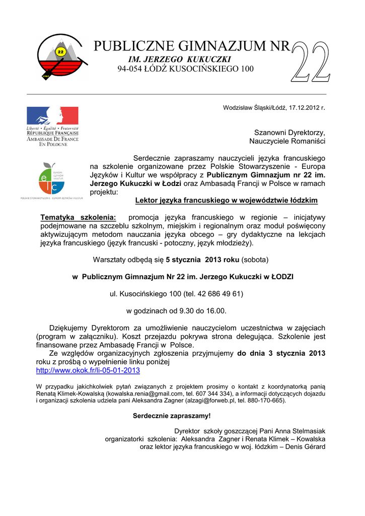 PUBLICZNE GIMNAZJUM NR IM. JERZEGO KUKUCZKI 94-054 ŁÓDŹ KUSOCIŃSKIEGO 100 Wodzisław Śląski/Łódź, 17.12.2012 r. Szanowni Dyrektorzy, Nauczyciele Romaniści Serdecznie zapraszamy nauczycieli języka francuskiego na szkolenie organizowane przez Polskie Stowarzyszenie - Europa Języków i Kultur we współpracy z Publicznym Gimnazjum nr 22 im. Jerzego Kukuczki w Łodzi oraz Ambasadą Francji w Polsce w ramach projektu: Lektor języka francuskiego w województwie łódzkim Tematyka szkolenia: promocja języka francuskiego w regionie – inicjatywy podejmowane na szczeblu szkolnym, miejskim i regionalnym oraz moduł poświęcony aktywizującym metodom nauczania języka obcego – gry dydaktyczne na lekcjach języka francuskiego (język francuski - potoczny, język młodzieży). Warsztaty odbędą się 5 stycznia 2013 roku (sobota) w Publicznym Gimnazjum Nr 22 im. Jerzego Kukuczki w ŁODZI ul. Kusocińskiego 100 (tel. 42 686 49 61) w godzinach od 9.30 do 16.00. Dziękujemy Dyrektorom za umożliwienie nauczycielom uczestnictwa w zajęciach (program w załączniku). Koszt przejazdu pokrywa strona delegująca. Szkolenie jest finansowane przez Ambasadę Francji w Polsce. Ze względów organizacyjnych zgłoszenia przyjmujemy do dnia 3 stycznia 2013 roku z prośbą o wypełnienie linku poniżej http://www.okok.fr/li-05-01-2013 W przypadku jakichkolwiek pytań związanych z projektem prosimy o kontakt z koordynatorką panią Renatą Klimek-Kowalską ([email protected], tel. 607 344 334), a informacji dotyczących dojazdu i organizacji szkolenia udziela pani Aleksandra Zagner ([email protected], tel. 880-170-665). Serdecznie zapraszamy! Dyrektor szkoły goszczącej Pani Anna Stelmasiak organizatorki szkolenia: Aleksandra Zagner i Renata Klimek – Kowalska oraz lektor języka francuskiego w woj. łódzkim – Denis Gérard PROGRAMME DE LA FORMATION / PROGRAM SZKOLENIA Miejsce: Publiczne Gimnazjum nr 22 w Łodzi Data: 5 stycznia 2013 roku (sobota) Prowadzący: Renata Klimek-Kowalska i Denis Gérard 9.30 – 10.45 - 10.45 – 11.00 Pause - café Travail en atelier 1 (chaque participant suivra les deux ateliers) 11.00 – 12.30 Renata KlimekKowalska ATELIER A/B Denis Gérard Introduction et premier bilan Analyse des besoins. Mise en commun des résultats des visites du lecteur itinérant dans les écoles qui participent au projet. Suggestions et inscriptions pour les mois à venir. Travail en groupes (par type d’établissement) – questions - réponses. Atelier A : ORGANISATION Actions de promotion de la langue française dans la voïvodie de Łódź – réflexion sur les matériaux de promotion nécessaires (groupes de travail par tâches). Présentation des concours aux niveaux local et regional et réflexion sur la mise en place d'un concours pour le projet du lecteur itinérant (logo + nom). Journées de la Francophonie et de la langue française – actions prévues. Leçons de sensibilisation dans les écoles primaires et collèges – plan d’action. Stages pour les enseignants de français dans le cadre de Comenius et de l’Ambassade de France (documentation). Correspondance de classe en français avec les écoles en France et dans d’autres pays francophones – état des lieux. Atelier B : APPROFONDISSEMENT LINGUISTIQUE Leçon de français niveau C2 : argot et textos. Quels sont les mots familiers d'aujourd'hui ? Comment lire les sms ? Comment parlent les collégiens et les lycéens ? 12.30 - 13.15 Pause déjeuner 13.15 – 14.45 Travail en atelier 2 ATELIR B/A Soit Atelier A : Organisation, soit Atelier B : Approfondissement linguistique Pause - café 14.45 - 15.00 15.00 – 16.00 - Bilan de la journée Calendrier, sujets et lieux des formations en 2013 Création des groupes de travail et établissement d’un agenda des réunions de travail. Evaluation de la formation.
