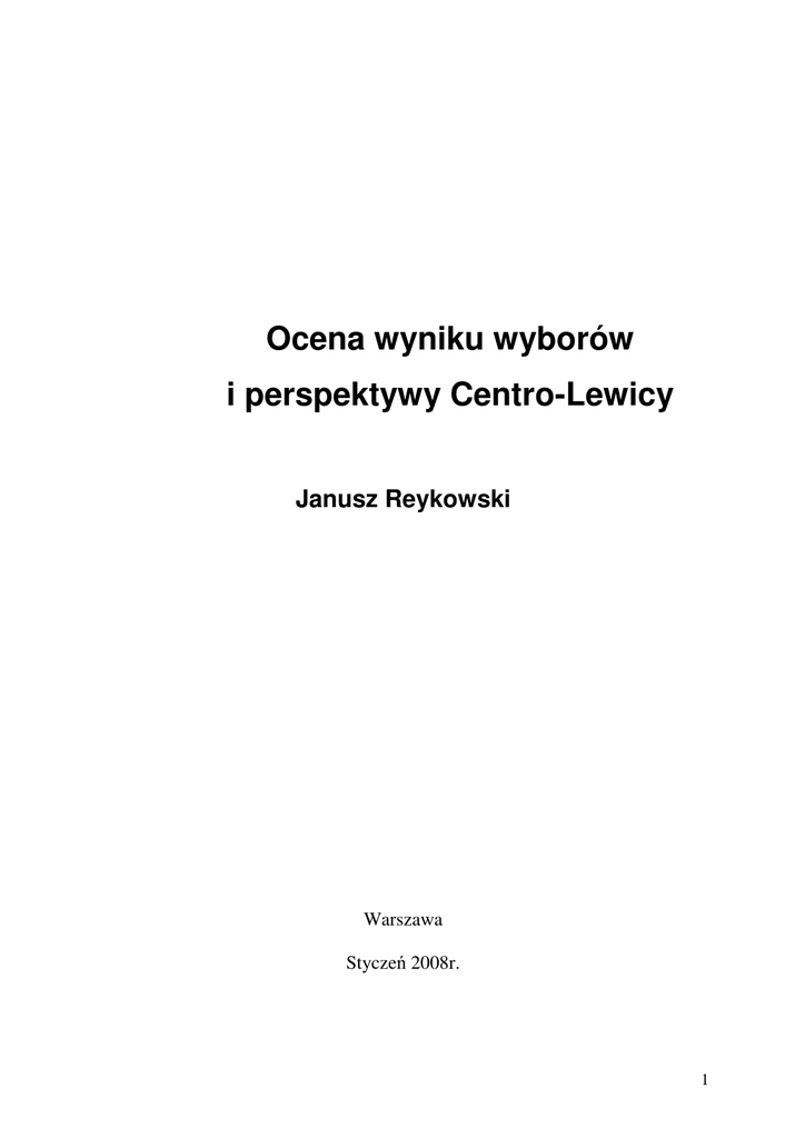 Ocena wyniku wyborów i perspektywy Centro-Lewicy Janusz Reykowski Warszawa Styczeń 2008r. 1 Ocena wyniku wyborów i perspektywy Centro-Lewicy Janusz Reykowski Niniejsze opracowanie powstało w wyniku dyskusji szerszego grona osób, które przekazywały swoje propozycje, uwagi i komentarze. Szczególnie rozwinięte propozycje i komentarze przekazali: Poseł Andrzej Celiński Dr Maciej Gdula Dr Krzysztof Janik Dr Jarosław Klebaniuk Dr Bogdan Karczmarek Lech Nikolski Prof. Jacek Raciborski Prof. Krystyna Skarżyńska Red. Krzysztof Teodor Toepliz Red. Robert Walenciak Dr Jacek Wasilewski Prof. Jerzy Wiatr Warszawa Styczeń 2008r. 2 Spis treści . OCENA WYBORÓW ....................................................................................................... 4 1.Sytuacja społeczno polityczna w okresie przedwyborczym ........................................... 4 2. Sytuacja LiD .............................................................................................................. 7 2.1. SLD. ........................................................................................................................ 7 Punkt wyjścia – sytuacja SLD po wyborach 2005r. .................................................. 8 „Zmarnowane” dwa lata?......................................................................................... 11 2.2. Partia Demokratyczna........................................................................................... 12 2.3. Pozostali członkowie LiD ..................................................................................... 13 3.Kampania wyborcza...................................................................................................... 14 Podsumowanie ................................................................................................................. 19 II. PERSPEKTYWY LID ................................................................................................ 20 4. Nowa Lewica ............................................................................................................... 21 5.Strategia polityczna....................................................................................................... 25 5.1. Po co dążyć do wygrania wyborów? Kwestia celów czyli „Projekt dla Polski” . 25 5.2. Jak przygotowywać się do przyszłych wyborów? ................................................ 26 Rola LiD....................................................................................................................... 27 Opracowanie strategii politycznej................................................................................ 29 Zagrożenia.................................................................................................................... 30 6.Problemy i zadania........................................................................................................ 32 PODSUMOWANIE ........................................................................................................... 35 ZAŁĄCZNIK ..................................................................................................................... 38 O aksjologicznych założeniach lewicy ........................................................................ 38 3 . OCENA WYBORÓW Dokonując oceny wyników wyborów parlamentarnych w 2007 roku i rezultatów uzyskanych przez LiD musimy uwzględnić sytuację społecznopolityczną w jakiej doszło do wyborów (1), sytuację w jakiej znajdował się LiD w okresie przedwyborczym (2) oraz działalność LiD w trakcie wyborów (3). 1.SYTUACJA SPOŁECZNO POLITYCZNA W OKRESIE PRZEDWYBORCZYM Dominującą cechą sytuacji politycznej w Polsce w 2007 roku był zaostrzający się konflikt między sprawującą władzę formacją polityczną (PiS), a wszystkimi siłami politycznymi działającymi na scenie politycznej naszego kraju oraz licznymi grupami społecznymi. Konflikt ten wynikał przede wszystkim z faktu, że polityka PiS, o prawicowo-populistycznym charakterze, zmierzała do ustanowienia w Polsce specyficznej formy ładu politycznego, którą można by określić, jako „autorytarną demokrację”. Miała ona prowadzić do monopolu władzy tej partii. Polityka ta godziła w interesy różnych grup społecznych, a także zagrażała międzynarodowym interesom Polski oraz ograniczała jej możliwości rozwojowe. Co więcej była ona niezgodna z ważnymi wartościami i zasadami demokratycznego społeczeństwa. Wszystko to sprawiło, że w znacznej części polskiego społeczeństwa ukształtowało się przekonanie o konieczności odsunięcia PiS od władzy. Dlatego wybory w 2007r przybrały charakter swego rodzaju plebiscytu – za lub przeciw PiS. Jedna ze stron tego konfliktu – PiS - dysponowała znaczną siłą polityczną. Źródłem tej siły, jak konstatowało to wielu obserwatorów i badaczy, były poważne słabości III-ej Rzeczpospolitej umiejętnie uwypuklone przez Jarosława Kaczyńskiego i innych krytyków tego okresu oraz fakt, że oferta programowa i praktyka sprawowania władzy przez PiS miały odpowiadać mentalności znacznej części polskiego społeczeństwa bardzo podatnego na propagandę prawicowo-populistyczną. Niektórzy badacze świadomości społecznej w Polsce uważali, że odpowiedniość ta dotyczy większości polskiego społeczeństwa i dlatego przewidywali zwycięstwo PiS w wyborach. Co się tyczy słabości III-ej RP, to jedną z głównych wydaje się w być dopuszczenie do narastania w Polsce nielegitymizowanych nierówności i 4 związanego z tym poczucia licznych grup społecznych, że ten porządek ustrojowy nie stwarza im szans rozwojowych. Bardzo znaczna część społeczeństwa miała poczucie upośledzenia oraz przekonanie, ze zamiast dawnych ograniczeń wolności o charakterze politycznym pojawiły się, ze zdwojoną siłą, ograniczenia wolności o charakterze ekonomicznym. Tymczasem, żadna z sił polit