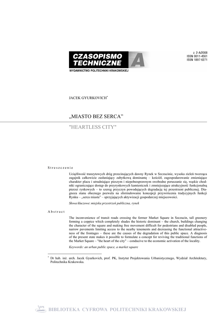 JACEK GYURKOVICH∗ „MIASTO BEZ SERCA” "HEARTLESS CITY" Streszczenie Uciążliwość tranzytowych dróg przecinających dawny Rynek w Szczucinie, wysoka zieleń tworząca zagajnik całkowicie zasłaniający zabytkową dominantę – kościół, zagospodarowanie zmieniające charakter placu i utrudniające pieszym i niepełnosprawnym swobodne poruszanie się, wąskie chodniki ograniczające dostęp do przyrynkowych kamieniczek i zmniejszające atrakcyjność funkcjonalną pierzei rynkowych – to szereg przyczyn powodujących degradację tej przestrzeni publicznej. Diagnoza stanu obecnego pozwala na sformułowanie koncepcji przywrócenia tradycyjnych funkcji Rynku – „serca miasta” – sprzyjających aktywizacji gospodarczej miejscowości. Słowa kluczowe: miejska przestrzeń publiczna, rynek Abstract The inconvenience of transit roads crossing the former Market Square in Szczucin, tall greenery forming a coppice which completely shades the historic dominant – the church, buildings changing the character of the square and making free movement difficult for pedestrians and disabled people, narrow pavements limiting access to the nearby tenements and decreasing the functional attractiveness of the frontages – these are the causes of the degradation of this public space. A diagnosis of the present state makes it possible to formulate a concept for reviving the traditional functions of the Market Square – "the heart of the city" – conducive to the economic activation of the locality. Keywords: an urban public space, a market square ∗ Dr hab. inż. arch. Jacek Gyurkovich, prof. PK, Instytut Projektowania Urbanistycznego, Wydział Architektury, Politechnika Krakowska. 242 W kulturze europejskiej w procesie historycznego rozwoju miasta wykształciły swój charakterystyczny, hierarchiczny model przestrzeni i budowli, tworzących czytelny i powszechnie zrozumiały język w systemie informacji wizualnej. U zarania dziejów „miasta obywatelskie” były miejscem schronienia dla tworzących je społeczności – mury czytelnie definiowały granice miasta, a bramy były swoistym filtrem, przepuszczającym wybranych i zatrzymującym wykluczonych. Miasta, które zachowały swój pierwotny kształt i linie zewnętrznych murów1 przypominają nam dawno już zapomniane idee koncepcji miasta jako miejsca przyjaznego, chroniącego swoich mieszkańców. W sylwetach miast pojawiały się dominanty informujące o istnieniu i lokalizacji ważnych budowli i przestrzeni publicznych. W średniowiecznych miastach europejskich o rodowodzie chrześcijańskim nad tkanką miasta górowała świątynia2. Symbole władzy świeckiej – warowne zamki królewskie czy siedziby możnowładców – czytelnie zaznaczały swoje miejsce w hierarchicznym języku form przestrzennych w mieście3. Należały do nich również siedziby władz miejskich – ratusze, sygnalizujące swoją obecność wieżami4. Tym ważnym budowlom towarzyszyły otwarte przestrzenie publiczne – przestronne wnętrza urbanistyczne w zwartej tkance zabudowy, intensywnie wykorzystującej teren ograniczony murami miasta. Place przed katedrami i kościołami służące wiernym, place miejskie, przy których sytuowane były siedziby władz miejskich i inne ważne budowle publiczne, miejskie pałace i siedziby zamożnych mieszczan – przestrzenie nasycone atrakcyjnymi funkcjami, służące jako miejsca zgromadzeń mieszkańców miast, publicznych sądów i egzekucji czy place targowe – to tradycyjne „serca miast”, miejsca tętniące życiem, codziennymi wydarzeniami i odświętnymi spektaklami i rytuałami, przyciągające licznych użytkowników. Dziś to przede wszystkim atrakcyjne miejsca spotkań mieszkańców miast i obcych – „salon towarzyski”, przestrzeń dla kultury, artystycznych manifestacji – łatwiej znajdujących tu odbiorców niż w tradycyjnych świątyniach sztuki. To miejsce wypoczynku, spędzania wolnego czasu. Miejsce, w którym należy się pokazywać i w którym mieszkańcy miast i przybysze przebywają chętnie. Miejsce żywych, realnych kontaktów poza światem wirtualnym. Kwintesencja miasta5. Wiele miast europejskich o wielowiekowej historii, których status polityczny i warunki lokalizacyjne sprzyjały rozwojowi gospodarczemu, wielokrotnie powiększyło swoje terytorium i liczbę mieszkańców. Dawno utraciły one pierwotną czytelność miejskiej tkanki i homogeniczną strukturę społeczną – stały się miastami o policentrycznych układach przestrzennych, rozległym obszarze z dominującym często wrażeniem chaosu przestrzeni użytkowanej przez wielokulturowe społeczności, charakterystyczne dla rozszerzającego się zjawiska globalizacji. Globalizacja w społecznościach, a także przestrzeniach miejskich, jest „procesem wprowadzania różnic w homogeniczne struktury wspólnot”6. Oznacza to istnienie i zderzanie się w przestrzeni miasta wielu kultur, religii, zachowań – w najlepszym wypadku na zasadach tolerancji. Tolerancja jest tylko gotowością do życia na co dzień z różnicami, nie oznacza jednak gotowości do tworzenia wspólnot. Te miasta, określane przez antropologów kultury mianem ponowoczesnych – post-polis – to miasta opanowane przez obcych, którymi w przestrzeniach publicznych są zarówno mieszkańcy odległych dzielnic, jak i przyjezdni – niezwiązani na stałe z miastem pracownicy międzynarodowego biznesu, turyści, studenci7. W przeciwieństwie do tych metropolii małe miejscowości i miasteczka zachowały wiele cech pierwotnej struktury „miasta obywatelskiego”. W erze cywilizacji informacyjnej znoszącej bariery przestrzeni i czasu, umożliwiającej w wielu zawodach pracę na odległość z wykorzystaniem środków elektronicznej komunikacji oraz dostęp do informacji – wiedzy i kultury – małe miasta mogą tworzyć atrakcyjną ofertę współczesnego środowiska życia, przestrzeni o mniejszym stopniu złożoności struktury funkcjonalnej, czy