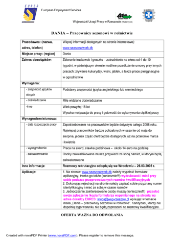 European Employment Services Wojewódzki Urząd Pracy w Rzeszowie (Wałbrzych) DANIA – Pracownicy sezonowi w rolnictwie Pracodawca: (nazwa, Więcej informacji dostępnych na stronie internetowej: adres, telefon) www.seasonalwork.dk Miejsce pracy: (region) Dania Zakres obowiązków: Zbieranie truskawek i groszku – zatrudnienie na okres od 4 do 10 tygodni, w późniejszym okresie możliwe przedłużenie umowy przy innych pracach: zrywanie kukurydzy, wiśni, jabłek, a także prace pielęgnacyjne w ogrodnictwie Wymagania: - znajomość języków Podstawy znajomości języka angielskiego lub niemieckiego obcych - doświadczenie Mile widziane doświadczanie -inne Wiek powyżej 18 lat Wysoka motywacja do pracy i gotowość do wykonywania ciężkiej pracy Wynagrodzenie/umowa: - data rozpoczęcia pracy Zapotrzebowanie na pracowników będzie dotyczyło całego 2008 roku. Najwięcej pracowników będzie potrzebnych w sezonie od maja do sierpnia, jednak część ofert będzie dostępnych już na przełomie marca i kwietnia - wynagrodzenie Praca na akord, stawka godzinowa – około 14 euro na godzinę. - zakwaterowanie Osoby zakwalifikowane muszą przywieźć ze sobą namiot, w którym będą zakwaterowane Inne informacje: Rozmowy rekrutacyjne odbędą się we Wrocławiu – 26.03.2008 r. Aplikacje: 1. Na stronie: www.seasonalwork.dk należy wypełnić formularz aplikacyjny, trzeba go także (koniecznie!!!) wydrukować i mieć przy sobie podczas przeprowadzanych rozmów kwalifikacyjnych 2. Dokonując rejestracji na stronie należy zapisać sobie przyznany numer identyfikacyjny i mieć ze sobą w czasie rozmów 3. Jednocześnie zainteresowane osoby muszą (koniecznie!!!) przesłać swoje zgłoszenie /kopia formularza wypełnianego na stronie/ na adres doradcy EURES: [email protected] wpisując w temacie maila „Dania – pracownicy sezonowi w rolnictwie”. Kandydaci, którzy nie dopełnią tego warunku nie będą zaproszeni na rozmowy kwalifikacyjne. OFERTA WAŻNA DO ODWOŁANIA Created with novaPDF Printer (www.novaPDF.com). Please register to remove this message.
