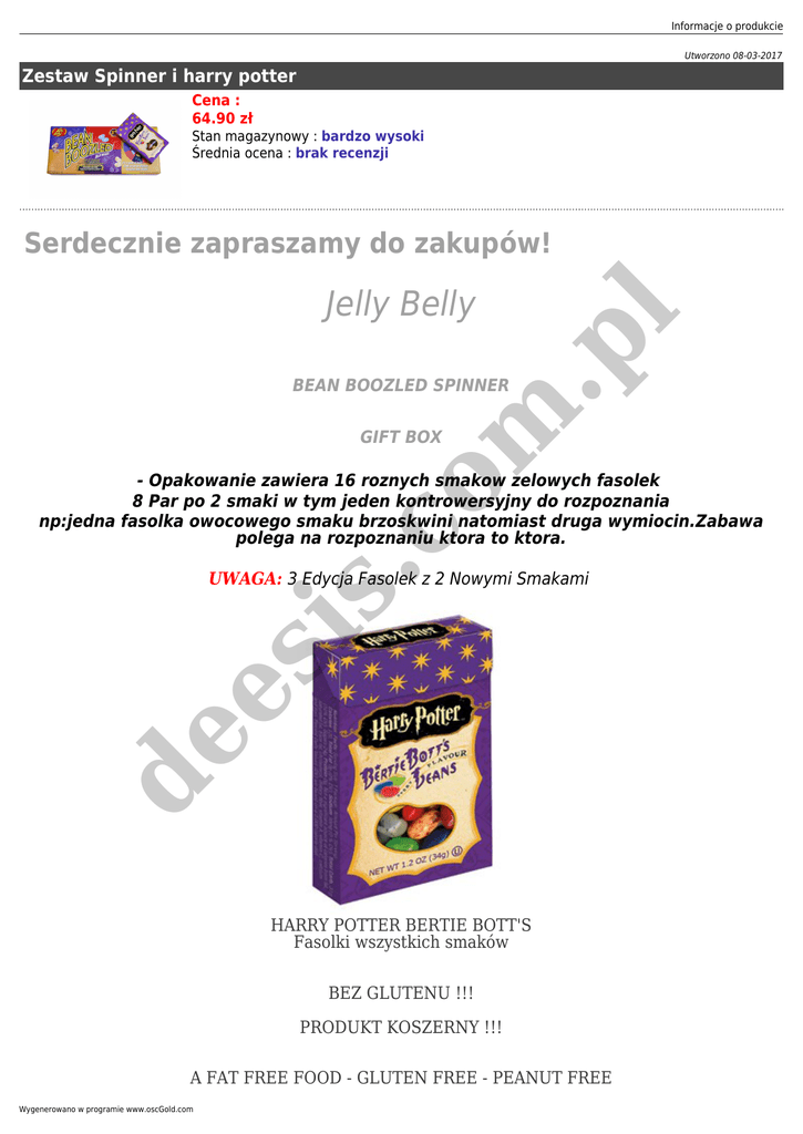 Informacje o produkcie Utworzono 08-03-2017 Zestaw Spinner i harry potter Cena : 64.90 zł Stan magazynowy : bardzo wysoki Średnia ocena : brak recenzji Serdecznie zapraszamy do zakupów! m .p l Jelly Belly BEAN BOOZLED SPINNER GIFT BOX .c o - Opakowanie zawiera 16 roznych smakow zelowych fasolek 8 Par po 2 smaki w tym jeden kontrowersyjny do rozpoznania np:jedna fasolka owocowego smaku brzoskwini natomiast druga wymiocin.Zabawa polega na rozpoznaniu ktora to ktora. de es is UWAGA: 3 Edycja Fasolek z 2 Nowymi Smakami HARRY POTTER BERTIE BOTT'S Fasolki wszystkich smaków BEZ GLUTENU !!! PRODUKT KOSZERNY !!! A FAT FREE FOOD - GLUTEN FREE - PEANUT FREE Wygenerowano w programie www.oscGold.com NATURAL & ARTIFICIAL FLAVORS Skład: Cukier, syrop kukurydziany, skrobia modyfikowana, puree z jeżyn, puree z cytryn, puree z bananów, koncentrat soku z wiśni, koncentrat soku z arbuza, koncentrat soku z jabłek, pieprz czarny, kwas cytrynowy, kwas jabłkowy, maltodekstryna, naturalne i sztuczne aromaty, barwniki (w tym E129 , E102, E110, E133, E132), subst. glazurujące (wosk pszczeli, wosk Carnauba, glazura cukiernicza), zagęstnik (dekstryna z tapioki), sól. *wartość odżywcza w 34 g : 120 kcal, tłuszcz 0g, węglowodany 31 g, cukry 24 g, błonnik 0 g, sód 20 mg. de es is .c o m .p l Waga netto: 34g