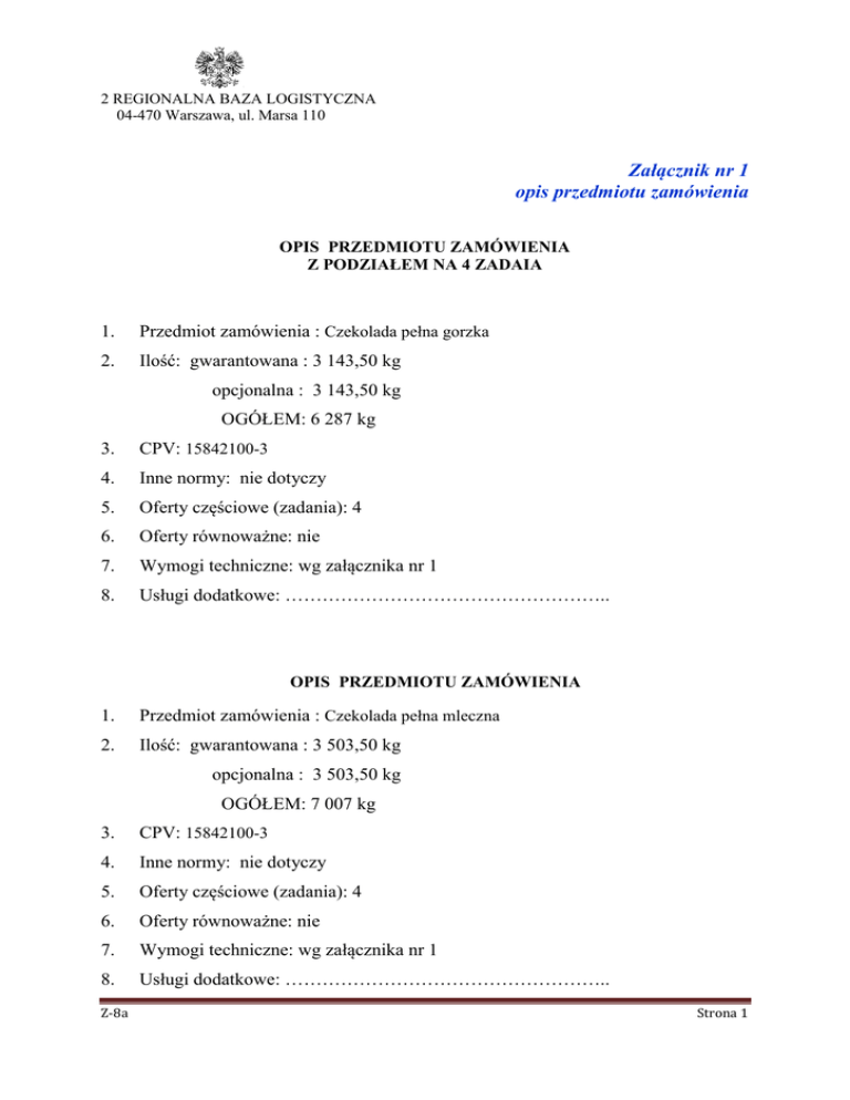 2 REGIONALNA BAZA LOGISTYCZNA 04-470 470 Warszawa, ul. Marsa 110 Załącznik nr 1 opis przedmiotu zamówienia OPIS PRZEDMIOTU ZAMÓWIENIA ZAM Z PODZIAŁEM NA 4 ZADAIA 1. Przedmiot zamówienia : Czekolada pełna gorzka 2. Ilość: gwarantowana : 3 143,50 kg opcjonalna : 3 143,50 kg OGÓŁEM: 6 287 kg 3. CPV: 15842100-3 4. Inne normy:: nie dotyczy 5. Oferty częściowe ciowe (zadania) (zadania): 4 6. Oferty równoważne:: nie 7. Wymogi techniczne:: wg załącznika nr 1 8. Usługi dodatkowe:: …………………………………………….. OPIS PRZEDMIOTU ZAMÓWIENIA ZAM 1. Przedmiot zamówienia : Czekolada pełna mleczna 2. Ilość:: gwarantowana : 3 503,50 kg opcjonalna : 3 503,50 kg OGÓŁEM: 7 007 kg 3. CPV: 15842100-3 4. Inne normy:: nie dotyczy 5. Oferty częściowe ciowe (zadania) (zadania): 4 6. Oferty równoważne:: nie 7. Wymogi techniczne:: wg załącznika zał nr 1 8. Usługi dodatkowe:: …………………………………………….. Z-8a Strona 1 OPIS PRZEDMIOTU ZAMÓWIENIA 1. Przedmiot zamówienia : Czekolada mleczna z orzechami 2. Ilość: gwarantowana : 3 666 kg opcjonalna : 3 666 kg OGÓŁEM: 7 332 kg 3. CPV: 15842100-3 4. Inne normy: nie dotyczy 5. Oferty częściowe (zadania): 4 6. Oferty równoważne: nie 7. Wymogi techniczne: wg załącznika nr 1 8. Usługi dodatkowe: …………………………………………….. OPIS PRZEDMIOTU ZAMÓWIENIA 1. Przedmiot zamówienia : Czekolada nadzieniem owocowym 2. Ilość: gwarantowana : 3 691 kg opcjonalna : 3 691 kg OGÓŁEM: 7 382 kg 3. CPV: 15842100-3 4. Inne normy: nie dotyczy 5. Oferty częściowe (zadania): 4 6. Oferty równoważne: nie 7. Wymogi techniczne: wg załącznika nr 1 8. Usługi dodatkowe: …………………………………………….. Załącznik nr 1 do SIWZ; numer postępowania: D/165/2016 Strona 2 OPIS PRZEDMIOTU ZAMÓWIENIA 1. Przedmiot zamówienia : Wafel czekoladowy o smaku kakaowym 2. Ilość: gwarantowana : 1 977 kg opcjonalna : 1 977 kg OGÓŁEM: 3 954 kg 3. CPV: 15840000-8 4. Inne normy: nie dotyczy 5. Oferty częściowe (zadania): 4 6. Oferty równoważne: nie 7. Wymogi techniczne: wg załącznika nr 1 8. Usługi dodatkowe: …………………………………………….. OPIS PRZEDMIOTU ZAMÓWIENIA 1. Przedmiot zamówienia : Wafel czekoladowy o smaku kokosowym 2. Ilość: gwarantowana : 1 912 kg opcjonalna : 1 912 kg OGÓŁEM: 3 824 kg 3. CPV: 15840000-8 4. Inne normy: nie dotyczy 5. Oferty częściowe (zadania): 4 6. Oferty równoważne: nie 7. Wymogi techniczne: wg załącznika nr 1 8. Usługi dodatkowe: …………………………………………….. Załącznik nr 1 do SIWZ; numer postępowania: D/165/2016 Strona 3 OPIS PRZEDMIOTU ZAMÓWIENIA 1. Przedmiot zamówienia : Wafel czekoladowy o smaku orzechowym 2. Ilość: gwarantowana : 1 957 kg opcjonalna : 1 957 kg OGÓŁEM: 3 914 kg 3. CPV: 15840000-8 4. Inne normy: nie dotyczy 5. Oferty częściowe (zadania): 4 6. Oferty równoważne: nie 7. Wymogi techniczne: wg załącznika nr 1 8. Usługi dodatkowe: …………………………………………….. OPIS PRZEDMIOTU ZAMÓWIENIA 1. Przedmiot zamówienia : Wafel czekoladowy o smaku toffi 2. Ilość: gwarantowana : 1 864,50 kg opcjonalna : 1 864,50 kg OGÓŁEM: 3 729 kg 3. CPV: 15840000-8 4. Inne normy: nie dotyczy 5. Oferty częściowe (zadania): 4 6. Oferty równoważne: nie 7. Wymogi techniczne: wg załącznika nr 1 8. Usługi dodatkowe: …………………………………………….. Załącznik nr 1 do SIWZ; numer postępowania: D/165/2016 Strona 4 OPIS PRZEDMIOTU ZAMÓWIENIA 1. Przedmiot zamówienia : Cukierki czekoladowe 2. Ilość: gwarantowana : 3 716 kg opcjonalna : 3 716 kg OGÓŁEM: 7 432 kg 3. CPV: 15842000-2 4. Inne normy: nie dotyczy 5. Oferty częściowe (zadania): 4 6. Oferty równoważne: nie 7. Wymogi techniczne: wg załącznika nr 1 8. Usługi dodatkowe: …………………………………………….. OPIS PRZEDMIOTU ZAMÓWIENIA 1. Przedmiot zamówienia : Cukierki witaminizowane 2. Ilość: gwarantowana : 2 751 kg opcjonalna : 2 751 kg OGÓŁEM: 5 502 kg 3. CPV: 15842300-5 4. Inne normy: nie dotyczy 5. Oferty częściowe (zadania): 4 6. Oferty równoważne: nie 7. Wymogi techniczne: wg załącznika nr 1 8. Usługi dodatkowe: …………………………………………….. Załącznik nr 1 do SIWZ; numer postępowania: D/165/2016 Strona 5 OPIS PRZEDMIOTU ZAMÓWIENIA/ 1. Przedmiot zamówienia : Biszkopty 2. Ilość: gwarantowana : 1 320,50 kg opcjonalna : 1 320,50 kg OGÓŁEM: 2 641 kg 3. CPV: 15812000-3 4. Inne normy: nie dotyczy 5. Oferty częściowe (zadania): 4 6. Oferty równoważne: nie 7. Wymogi techniczne: wg załącznika nr 1 8. Usługi dodatkowe: …………………………………………….. OPIS PRZEDMIOTU ZAMÓWIENIA 1. Przedmiot zamówienia : Ciasteczka kruche 2. Ilość: gwarantowana : 1 435,50 kg opcjonalna : 1 435,50 kg OGÓŁEM: 2 871 kg 3. CPV: 15812000-3 4. Inne normy: nie dotyczy 5. Oferty częściowe (zadania): 4 6. Oferty równoważne: nie 7. Wymogi techniczne: wg załącznika nr 1 8. Usługi dodatkowe: …………………………………………….. Załącznik nr 1 do SIWZ; numer postępowania: D/165/2016 Strona 6 OPIS PRZEDMIOTU ZAMÓWIENIA 1. Przedmiot zamówienia : Ciasteczka typu Delicje 2. Ilość: gwarantowana : 1 235,50 kg opcjonalna : 1 235,50 kg OGÓŁEM: 2 471 kg 3. CPV: 15812000-3 4. Inne normy: nie dotyczy 5. Oferty częściowe (zadania): 4 6. Oferty równoważne: nie 7. Wymogi techniczne: wg załącznika nr 1 8. Usługi dodatkowe: …………………………………………….. OPIS PRZEDMIOTU ZAMÓWIENIA 1. Przedmiot zamówienia : Krakersy 2. Ilość: gwarantowana : 1 447,50 kg opcjonalna : 1 447,50 kg OGÓŁEM: 2 895 kg 3. CPV: 15820000-2 4. Inne normy: nie dotyczy 5. Oferty częściowe (zadania): 4 6. Oferty równoważne: nie 7. Wymogi techniczne: wg załącznika nr 1 8. Usługi dodatkowe: …………………………………………….. Załącznik nr 1 do SIWZ